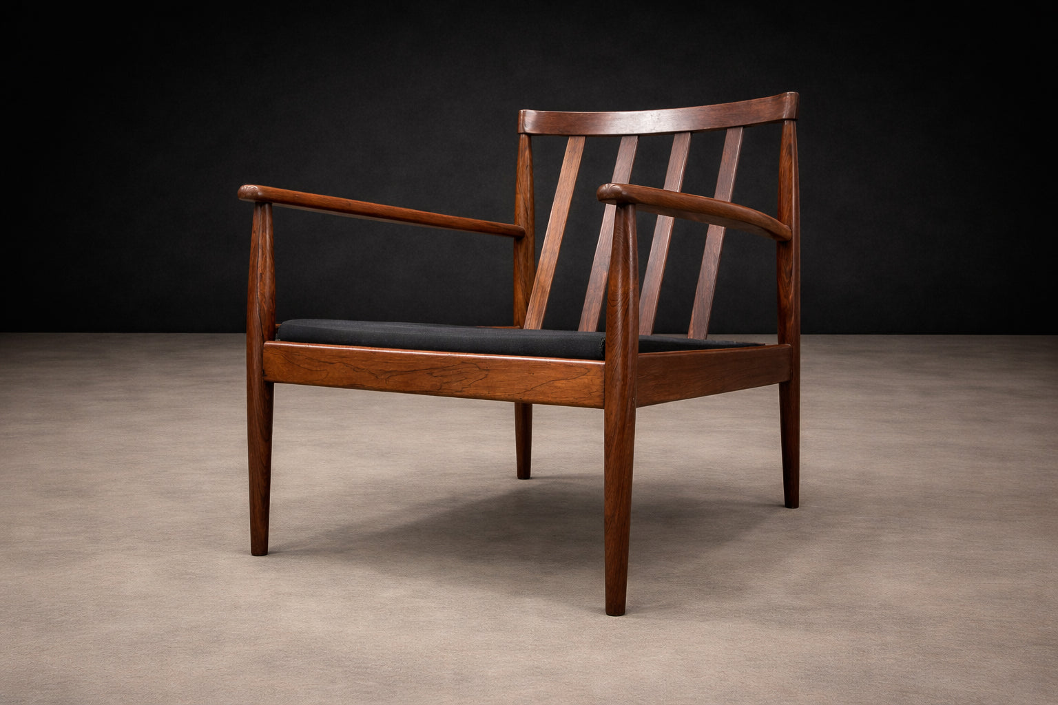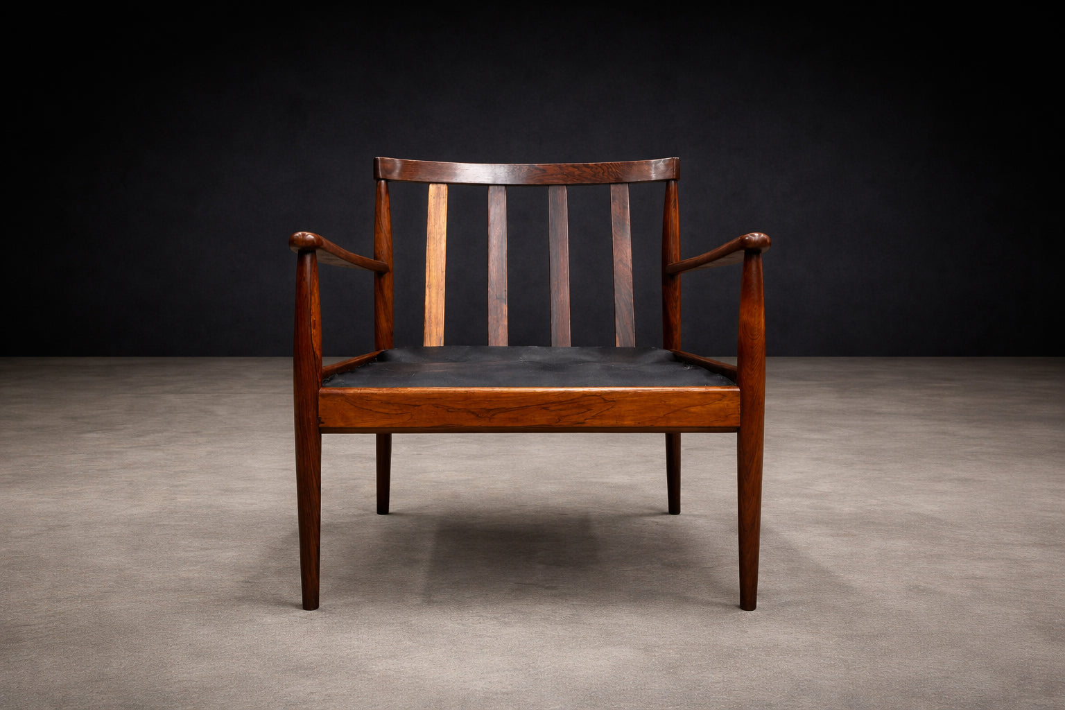 A study in restraint and proportion, this Brazilian Modern armchair from the 1960s reflects the quiet sophistication that defined the era. Crafted in richly figured rosewood, the frame reveals beautifully balanced lines — fluid tapered legs, slender armrests, and a minimal back composed of four solid wood slats that create both rhythm and structural clarity.