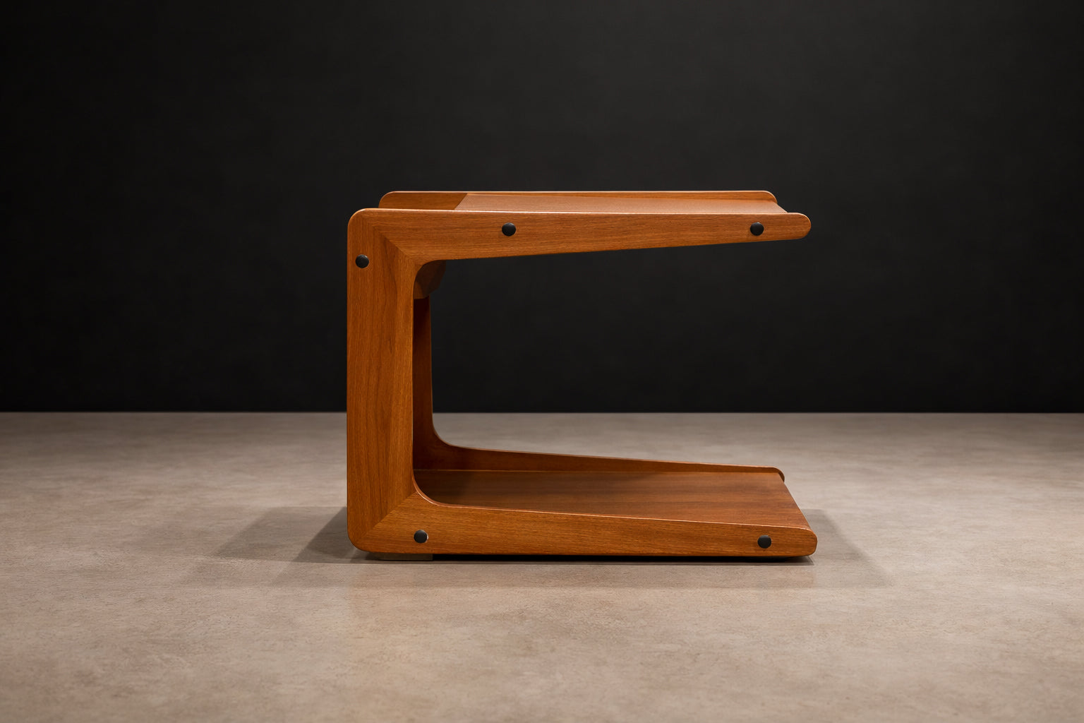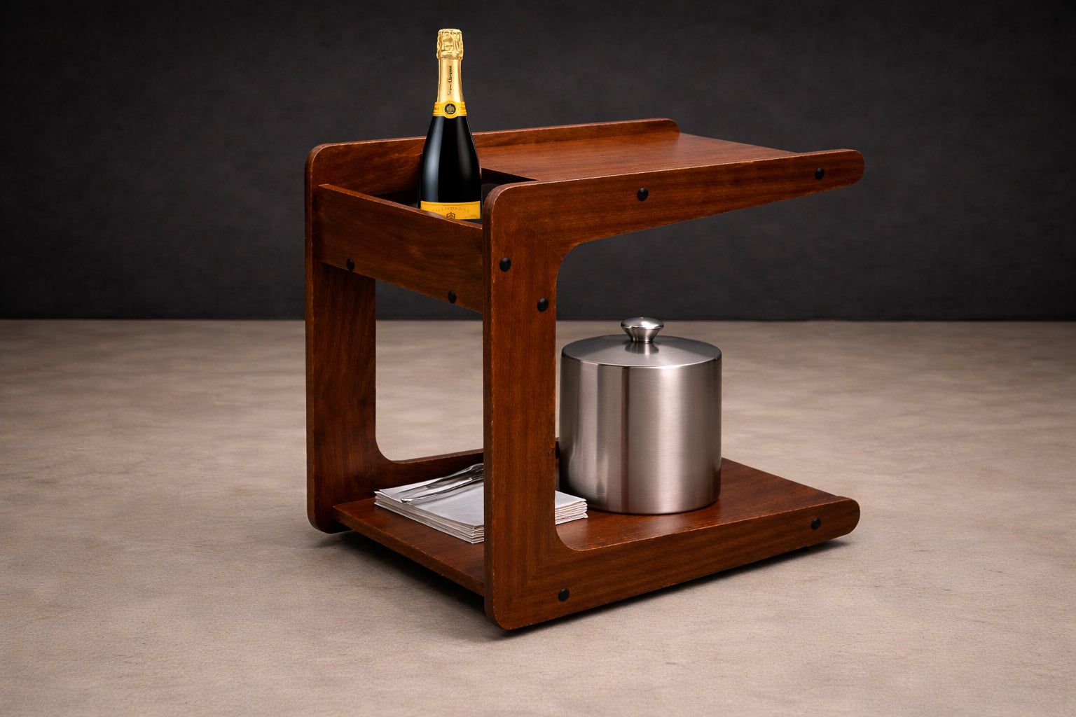 Crafted from richly toned Brazilian hardwood, the piece features a sculptural open-frame construction defined by clean architectural planes and softened corners. Two functional tiers provide practical storage, while the integrated rear compartment discreetly cradles bottles, creating a thoughtful balance between utility and composition. The exposed joinery and darkened hardware accents reinforce the cart’s honest, industrial-modern character—hallmarks of Hobjeto’s forward-looking production during Brazil’s modern design peak.