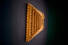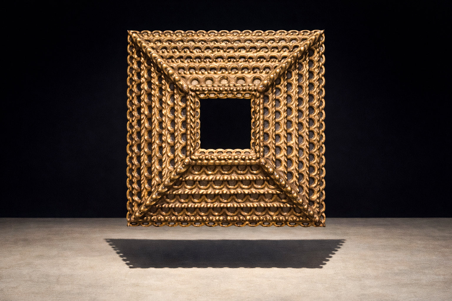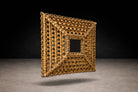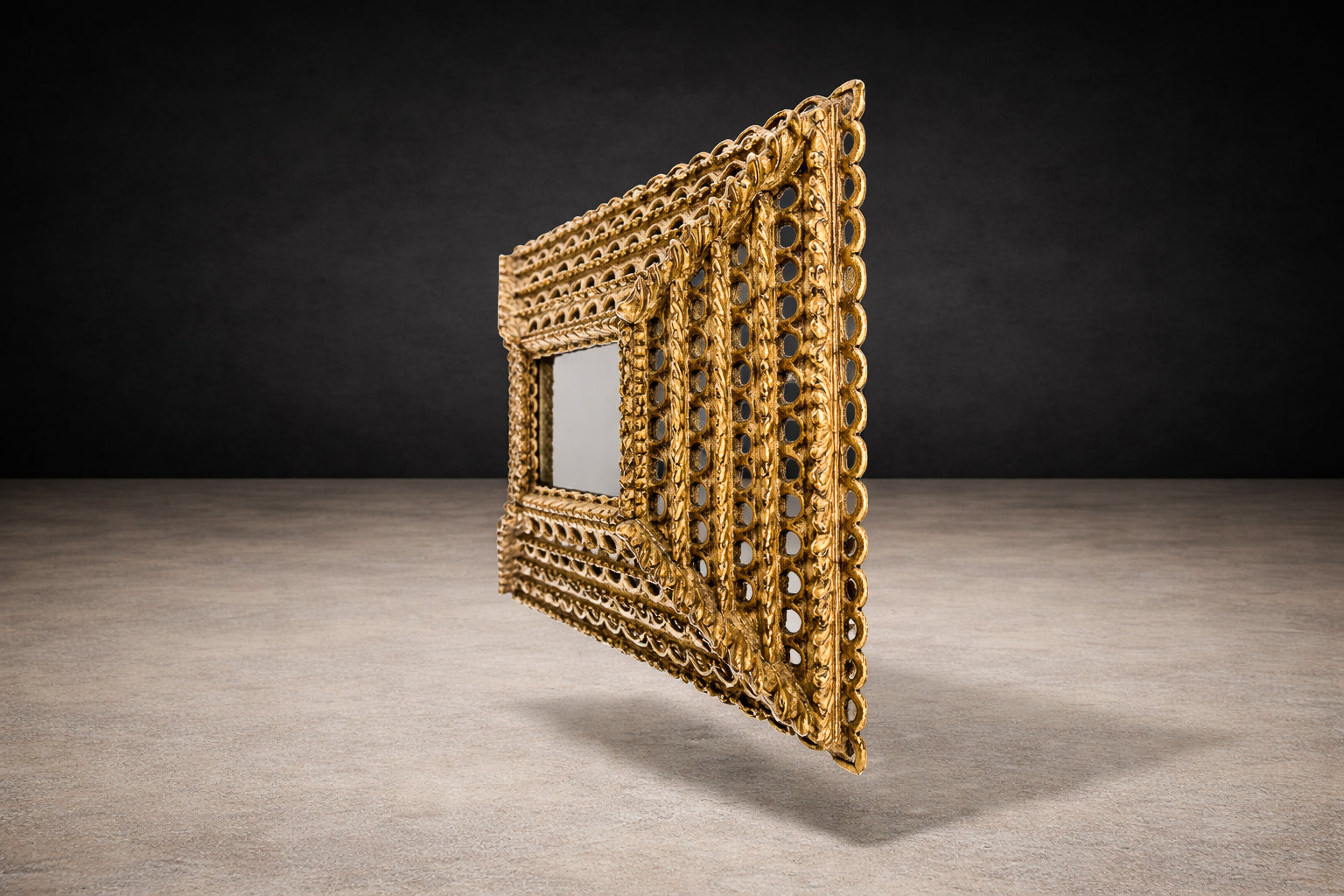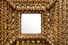 The surface retains its original gilding, now beautifully mellowed with age. Subtle tonal variation across the gold leaf reveals the hand of the artisan and reinforces the mirror’s authenticity. The layered construction produces a striking architectural presence — at once ornamental and structurally grounded — making it equally compelling in traditional interiors or as a dramatic counterpoint within contemporary settings.