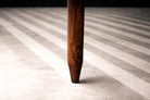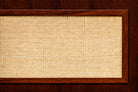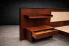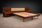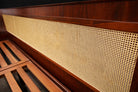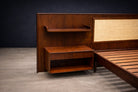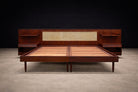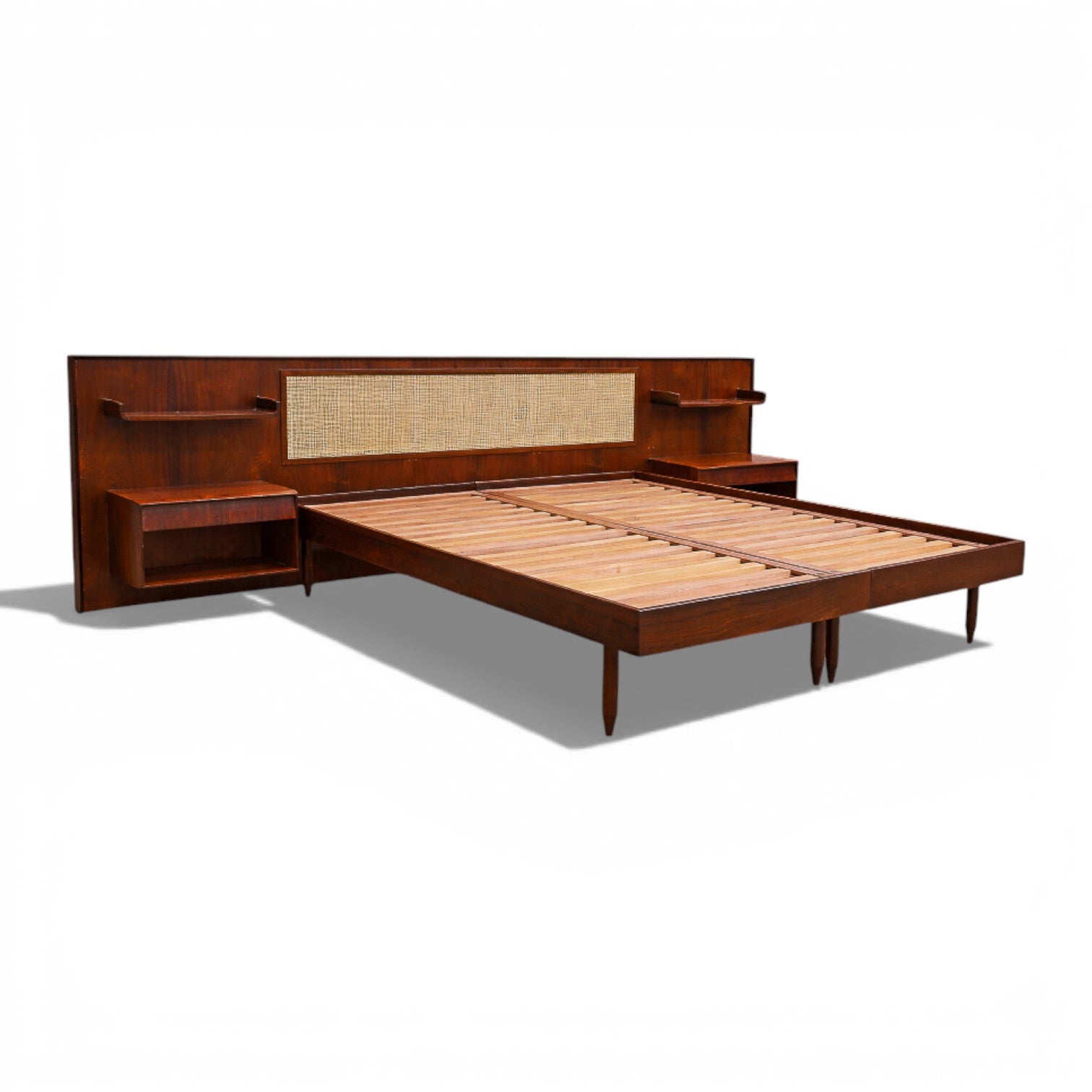 Executed entirely in Brazilian rosewood (Jacaranda), the bed consists of two sculptural bases supported by cone-shaped legs, emphasizing lightness and rhythm. The headboard integrates a central caned panel with built-in shelves and drawers, balancing material richness with functional clarity. The caning has been sensitively renewed, respecting original proportion and texture.