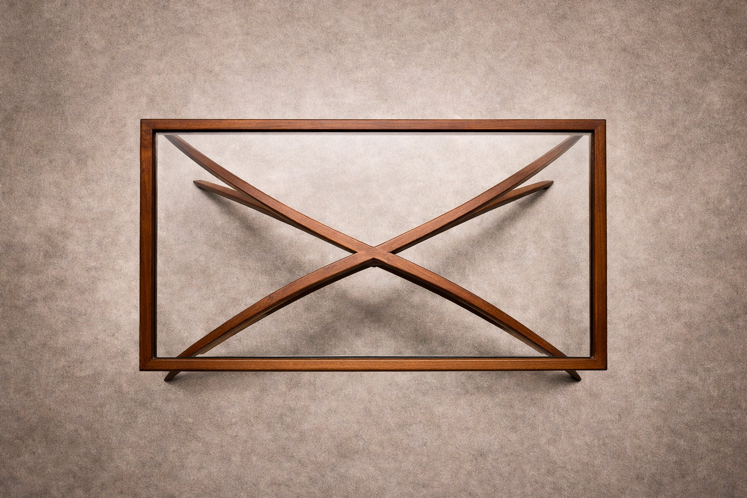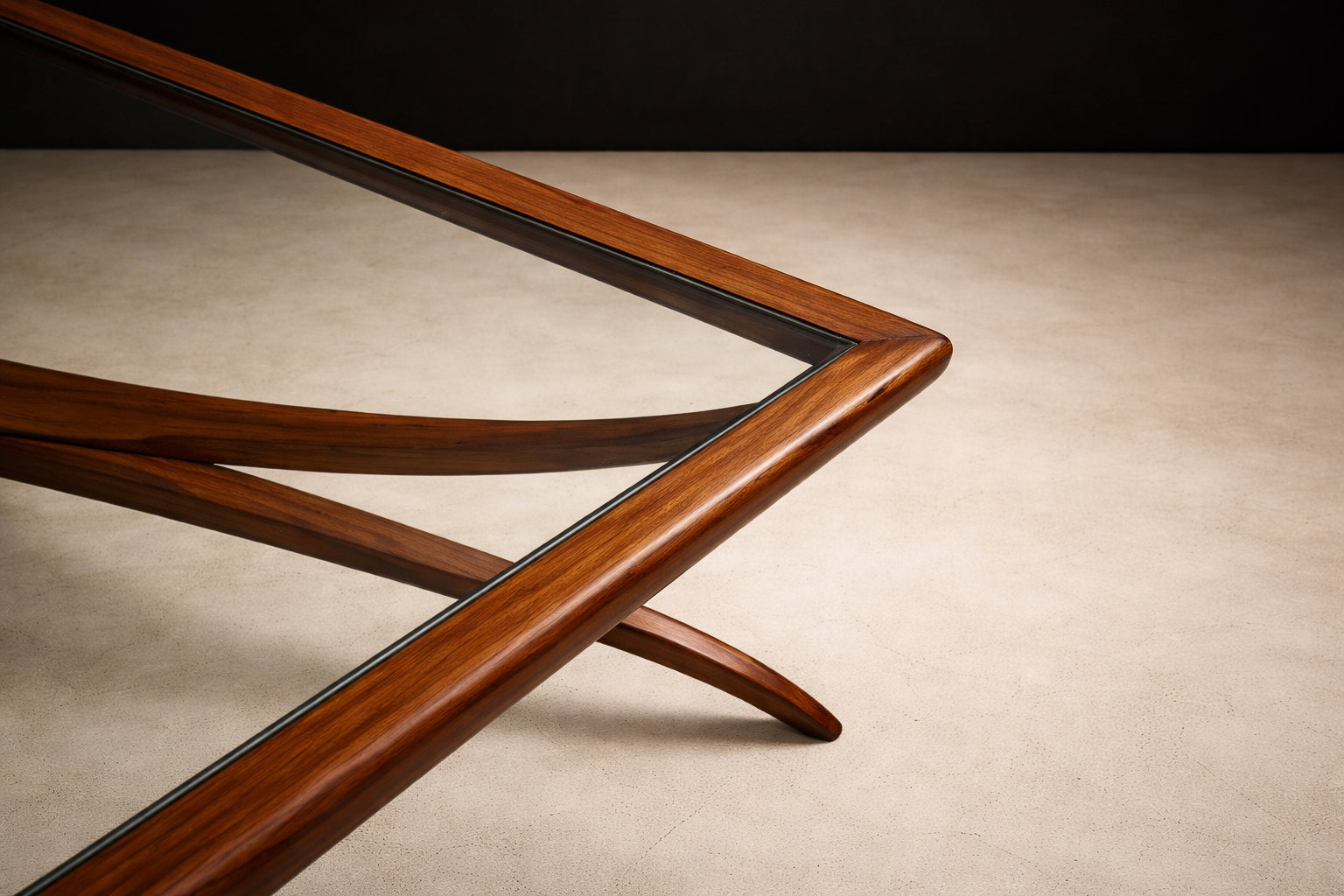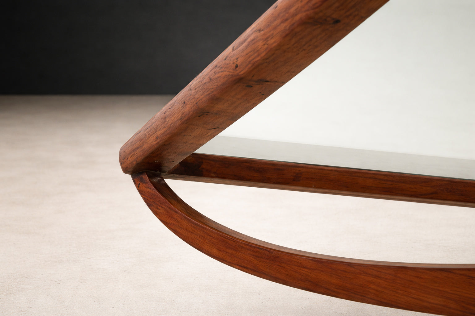 The caviúna is of exceptional quality, displaying rich tonal variation and dramatic grain patterning characteristic of premium Brazilian hardwood. Its warm, honey-to-caramel undertones contrast beautifully against the transparency of the glass, reinforcing the sculptural silhouette beneath. The wood has been professionally restored to a satin matte finish, preserving depth without artificial gloss.