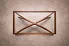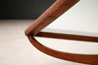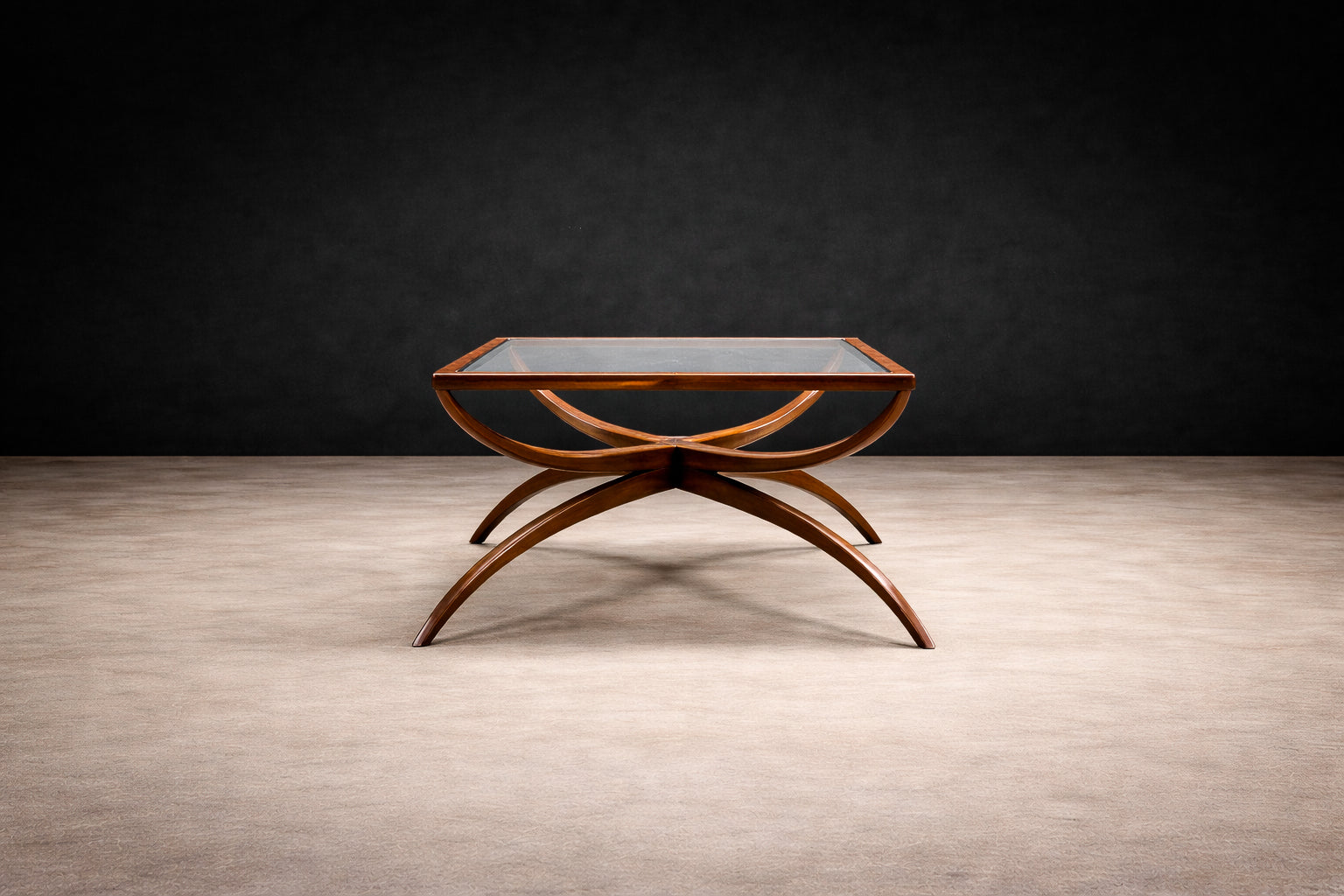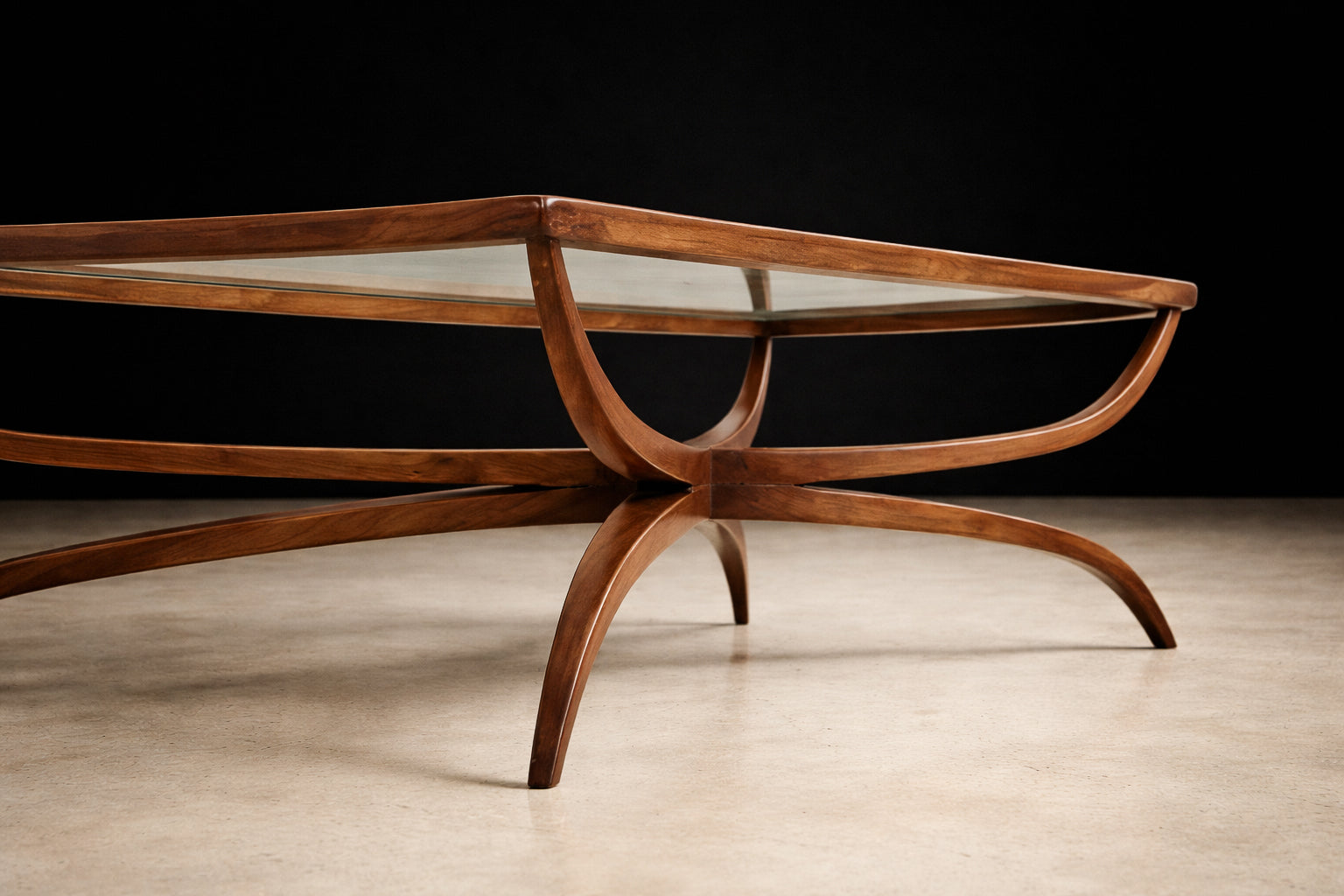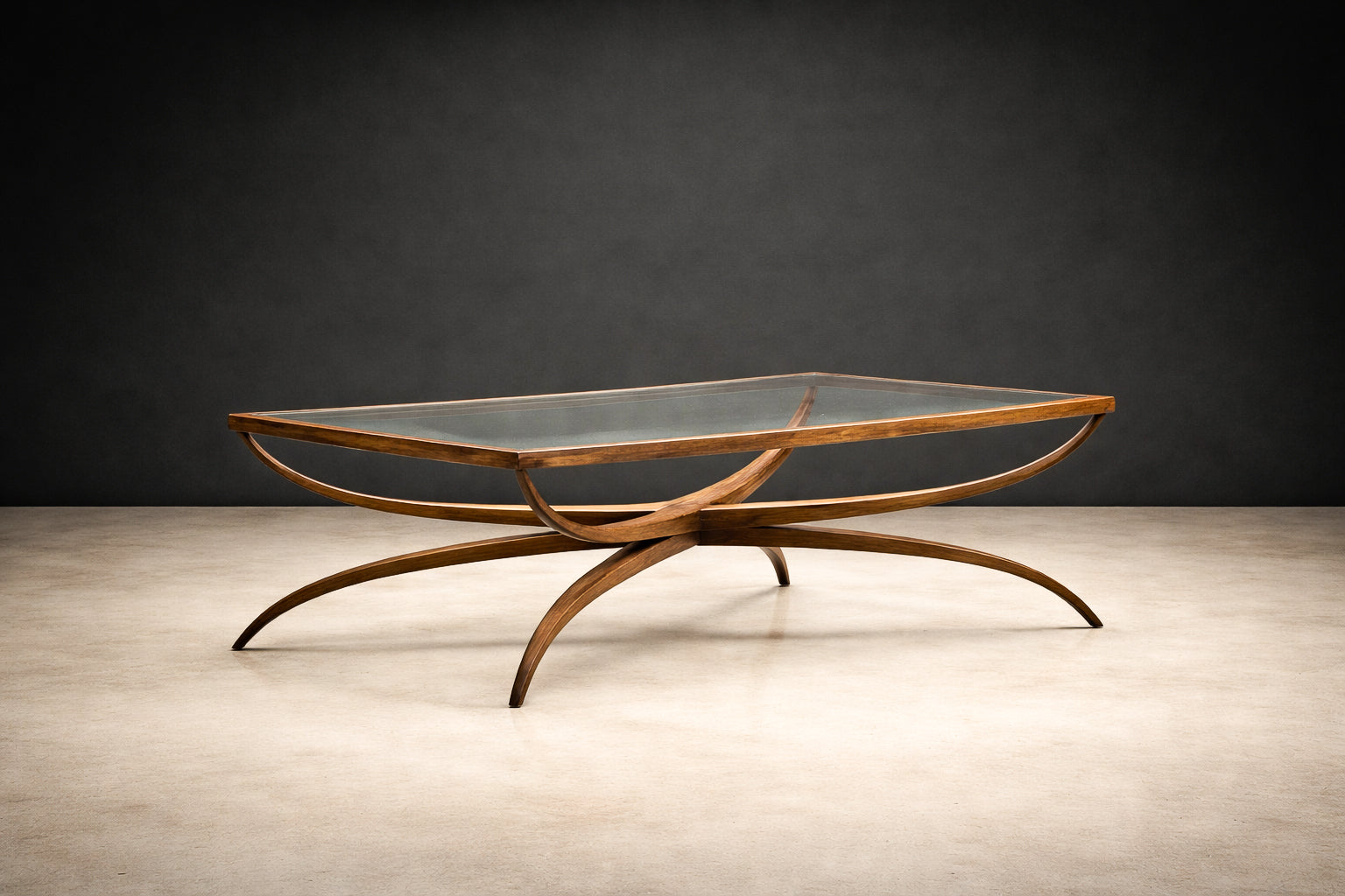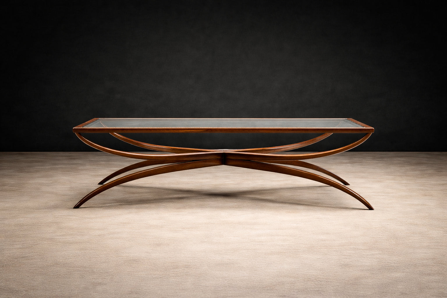 The base is composed of sweeping, curved supports that intersect in a dynamic, almost architectural rhythm—an unmistakable gesture of the period’s embrace of biomorphic form. Rather than rigid geometry, the lines unfold organically, creating tension and lightness simultaneously. The central crossing stretcher and bowed side rails demonstrate refined joinery and careful proportioning, allowing the piece to feel both grounded and airborne.