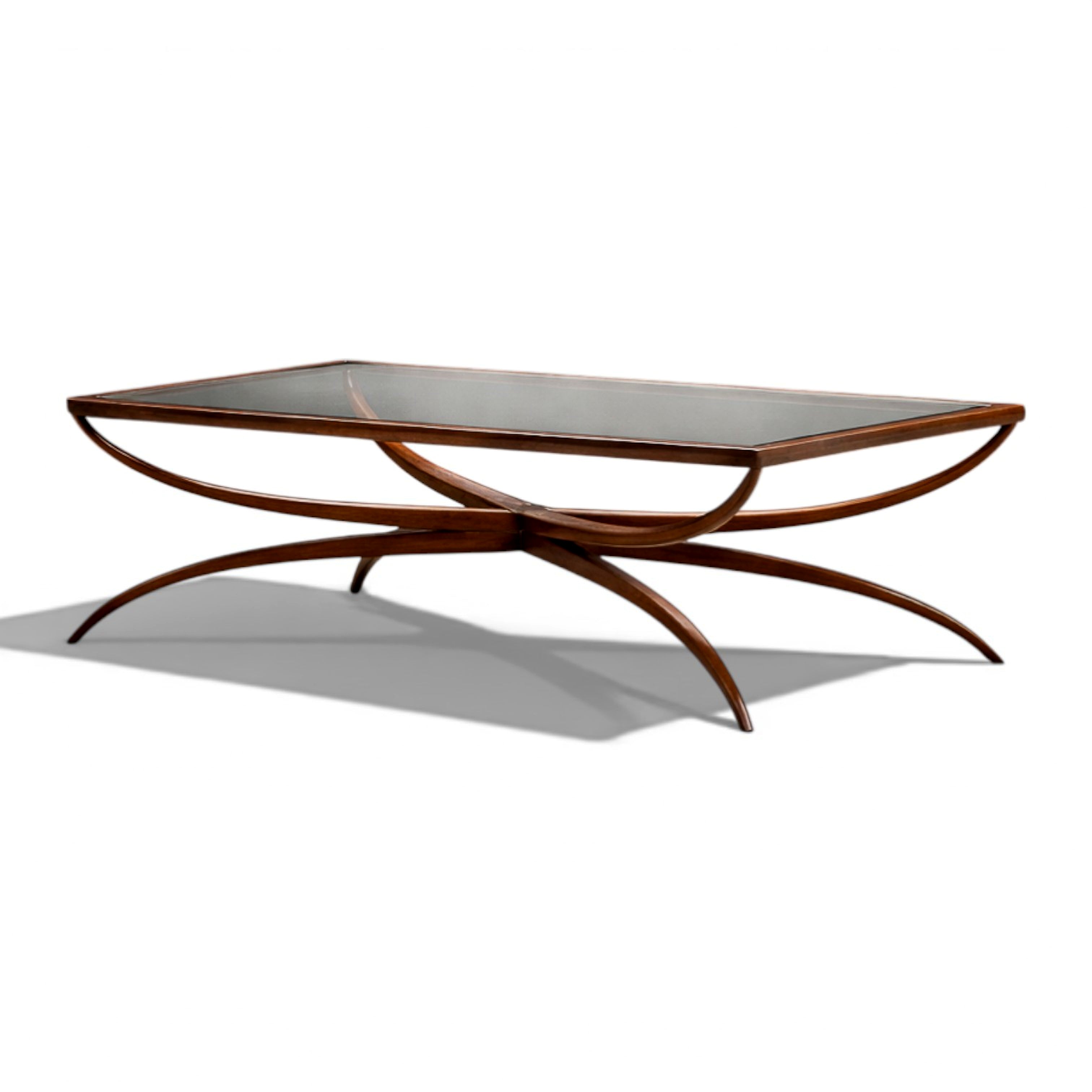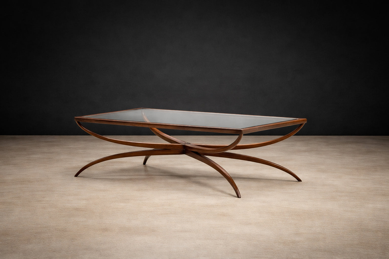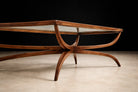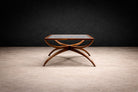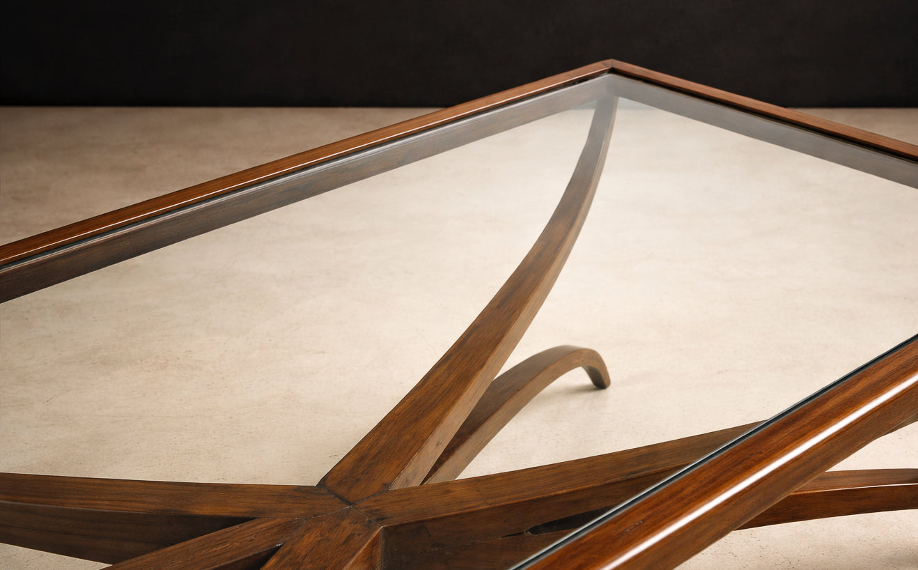 An elegant expression of Brazilian modernism, this coffee table—attributed to Giuseppe Scapinelli—embodies the organic sculptural language that defined Brazilian design in the 1950s. Executed in solid caviúna wood with a floating glass top, the table reveals a masterful interplay between structure and movement.