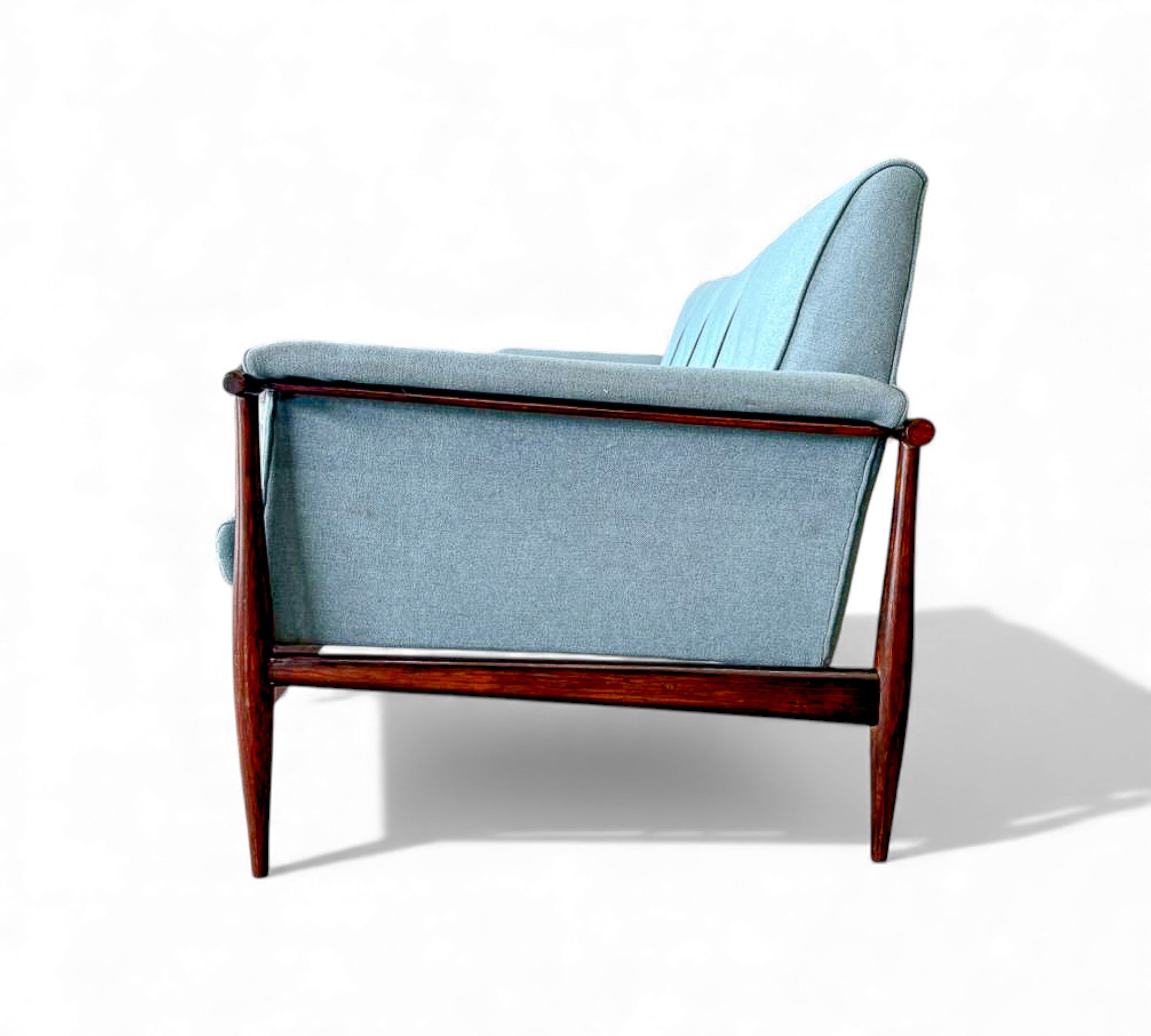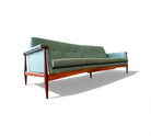 This 1960s Canoa Sofa by Liceu de Artes e Ofícios is crafted in solid rosewood and features the clean lines and sturdy construction associated with the workshop’s mid-century production. The design takes its name, Canoa, from the distinctive armrest handles inspired by the oars used in traditional Indigenous Brazilian canoes. The sofa includes three upholstered seat cushions and a three-panel backrest, offering a straightforward, comfortable layout.