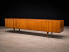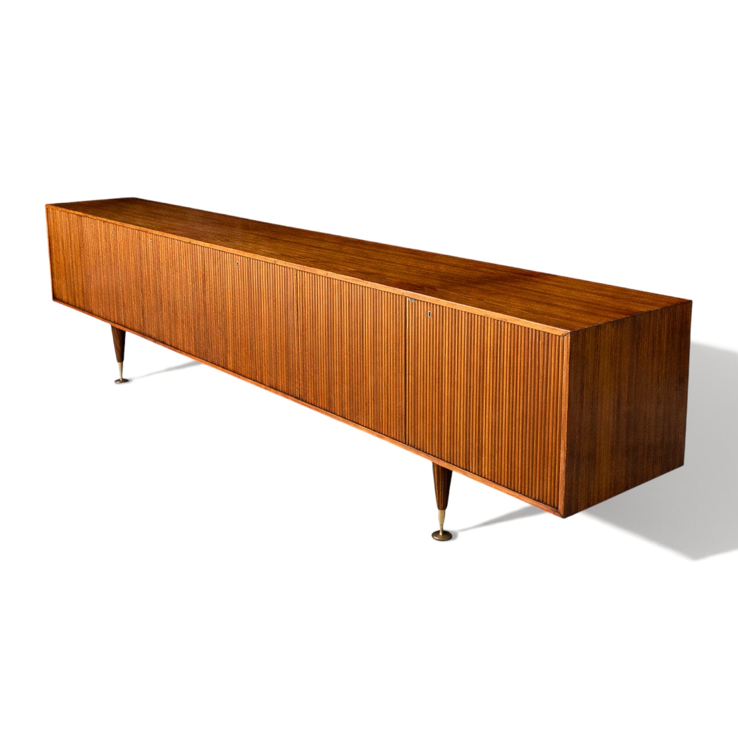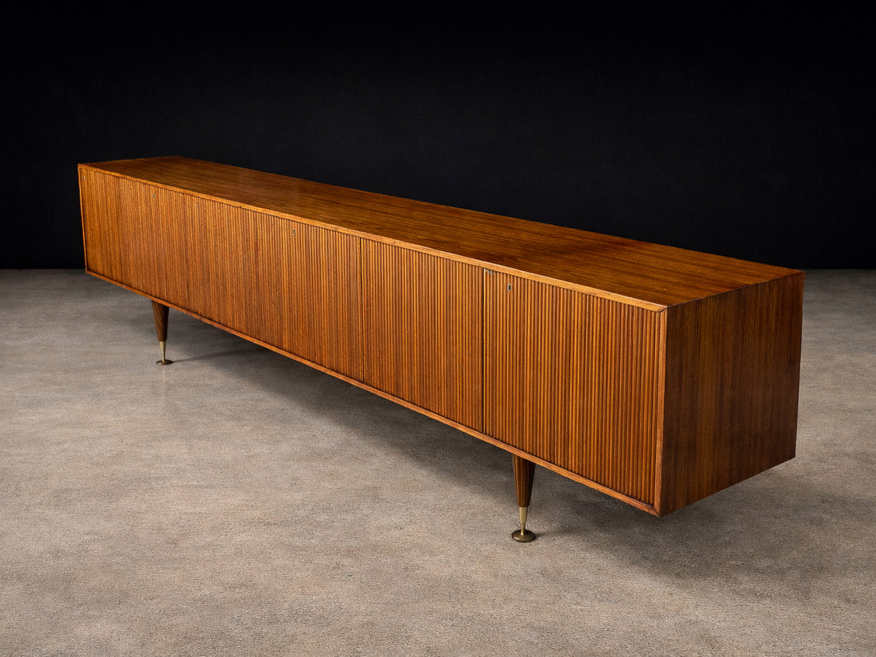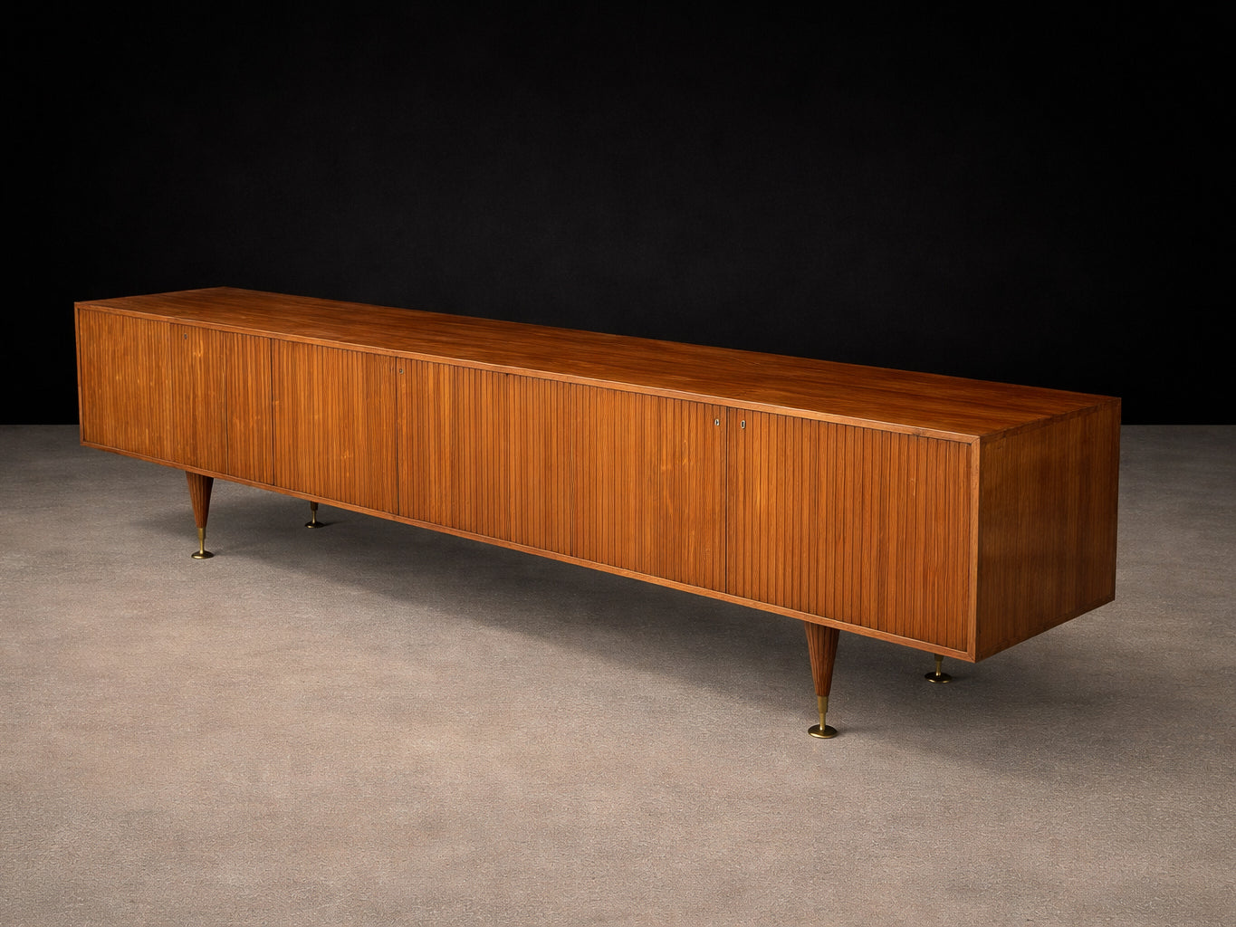 Executed in richly toned caviúna wood, the credenza is defined by its rhythmically reeded façade, a hallmark of Scapinelli’s work and a reflection of the period’s interest in texture, shadow, and architectural surface. Raised on four tapered legs, the long, low composition conveys visual lightness while maintaining a strong structural presence. Six doors open to reveal a thoughtfully organized interior with eight shelves, balancing functional storage with refined proportion.