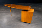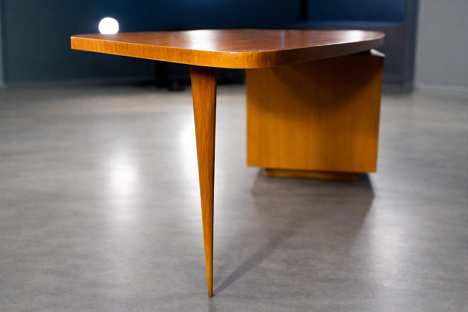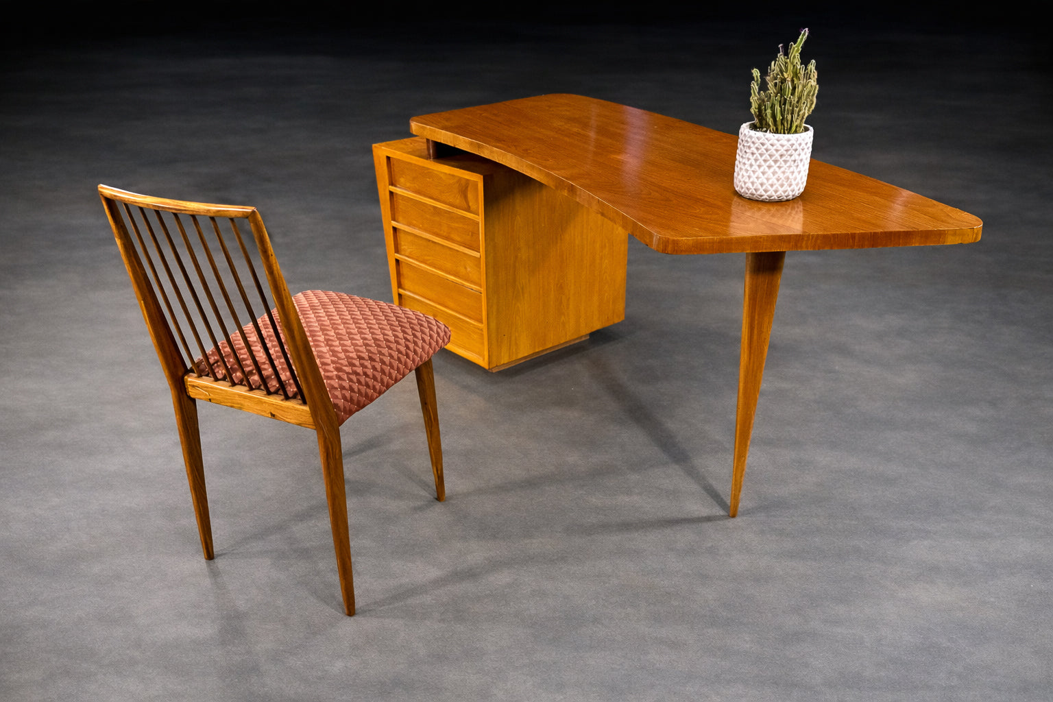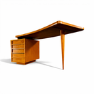 The desk is defined by its elegant asymmetrical composition: a gently curved, cantilevered top extends outward from a compact drawer pedestal, counterbalanced by a single, slender tapered leg. This interplay of mass and suspension is a hallmark of Tenreiro’s work, lending the desk a sense of visual tension and effortless balance. The subtly contoured top softens the geometry of the design while enhancing its sculptural presence.