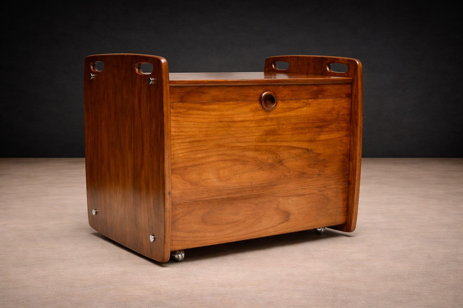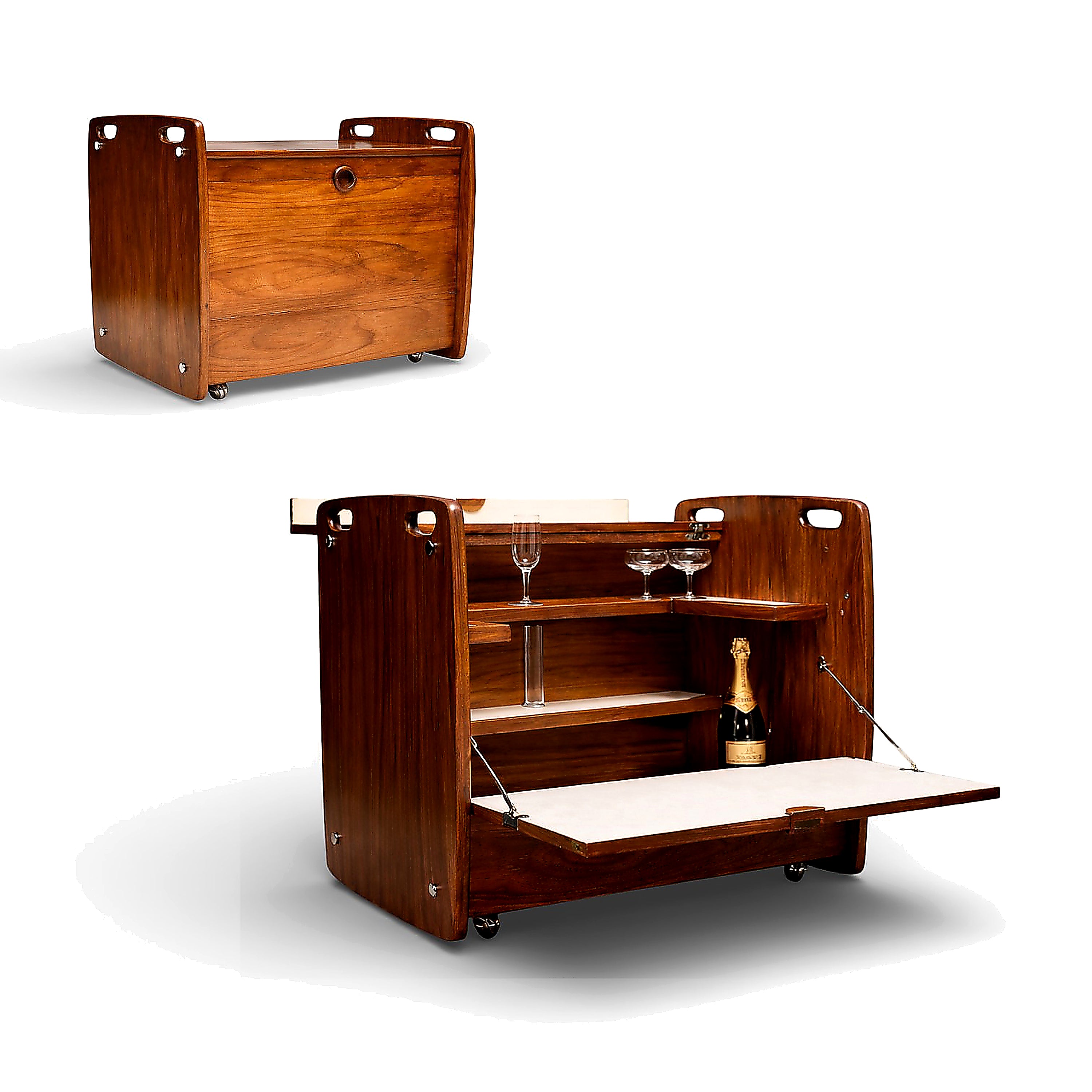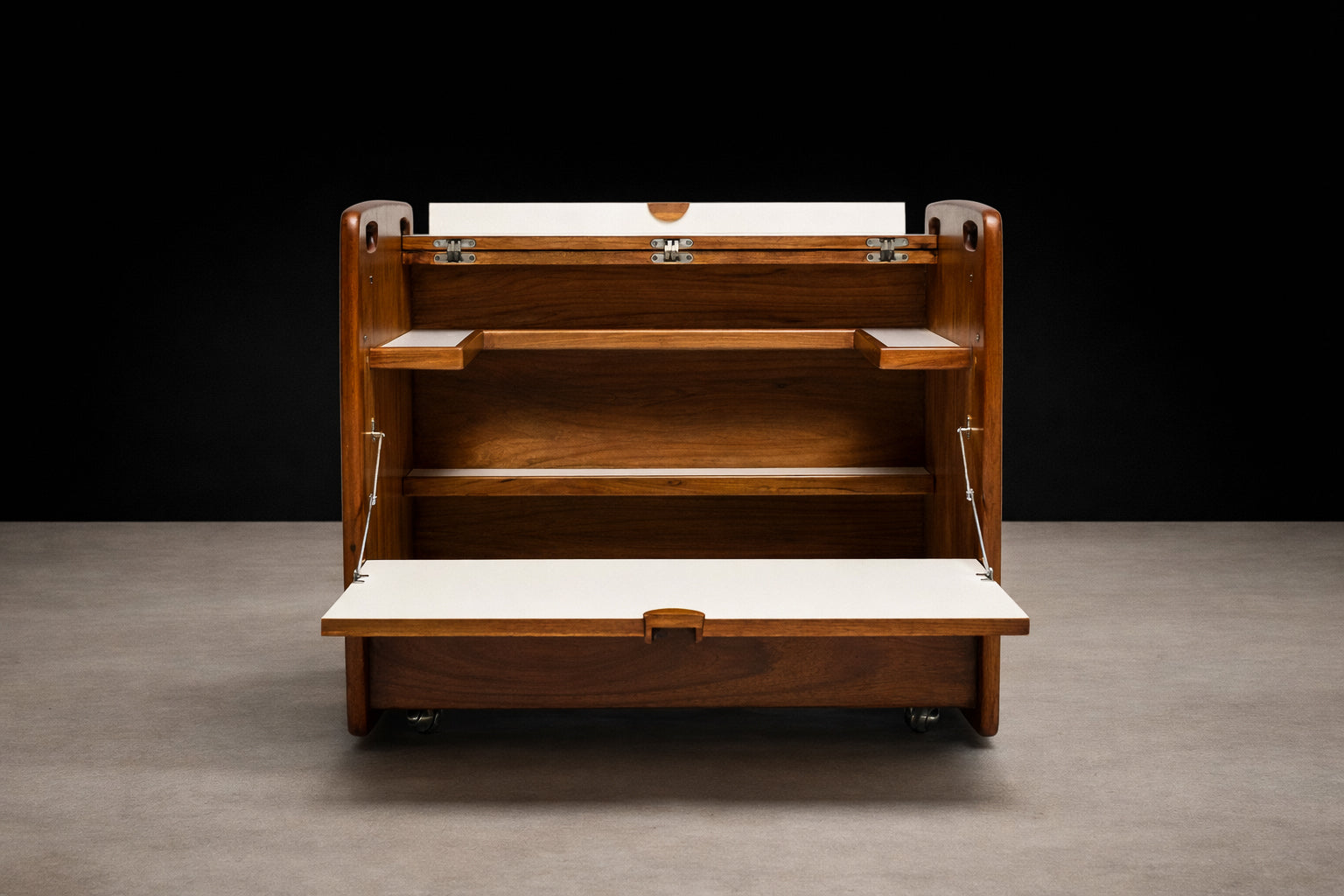 Rodrigues is widely regarded as the architect of Brazilian Modern furniture, championing native woods and relaxed forms suited to Brazil’s climate and social culture. This bar cart embodies that philosophy, offering a compact yet highly practical solution for entertaining without sacrificing sculptural presence.