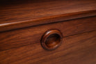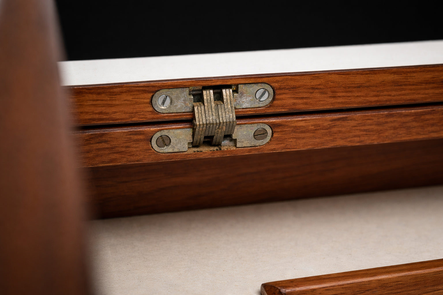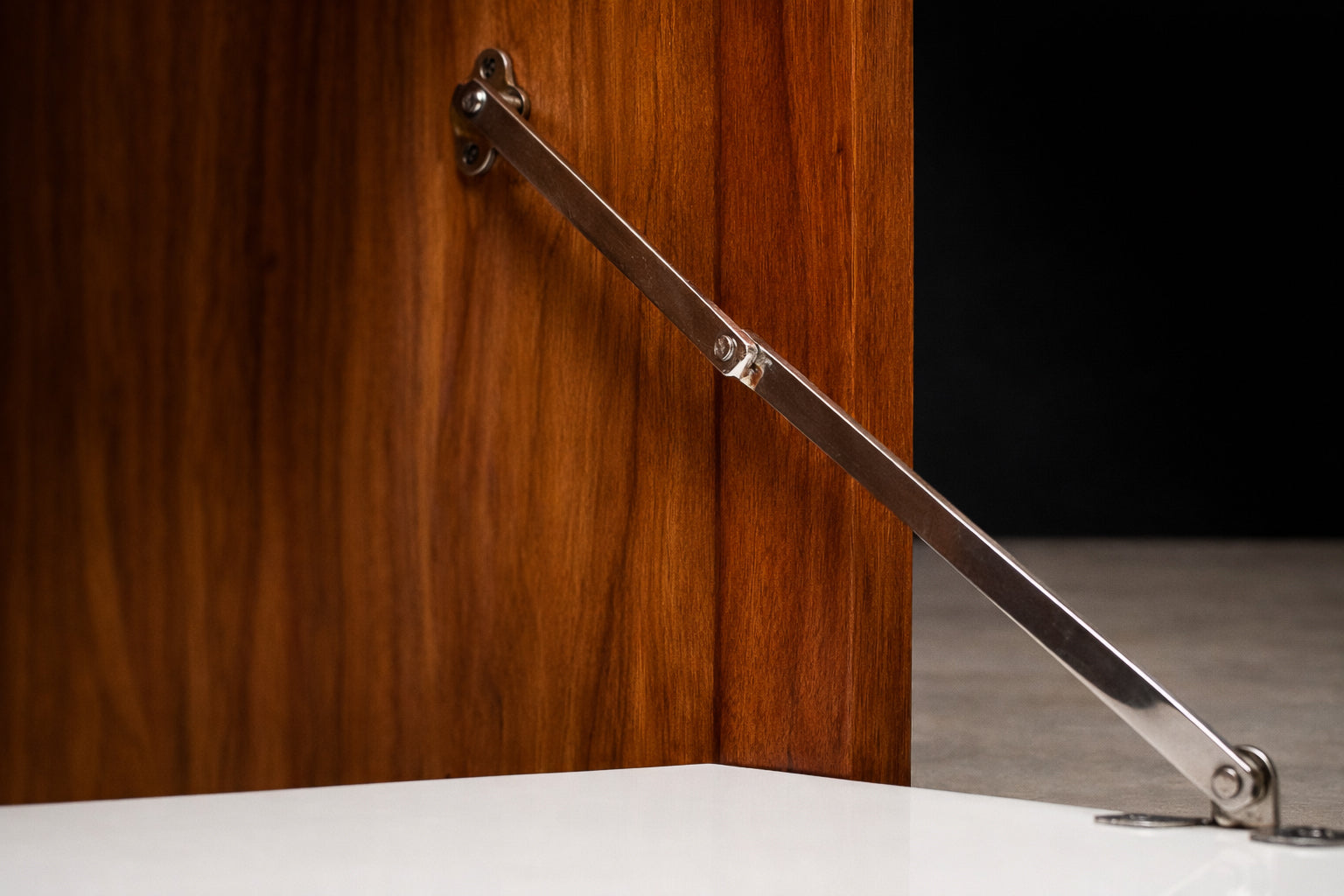 The wood has been refinished to a satin finish, highlighting freijó’s warm tone and subtle grain, while the chrome hardware remains in excellent condition. Its proportions allow it to function equally well as a bar, side cabinet, or mobile serving station. Elegant yet approachable, this piece represents Brazilian Modernism’s shift away from formality toward furniture designed for lived experience.