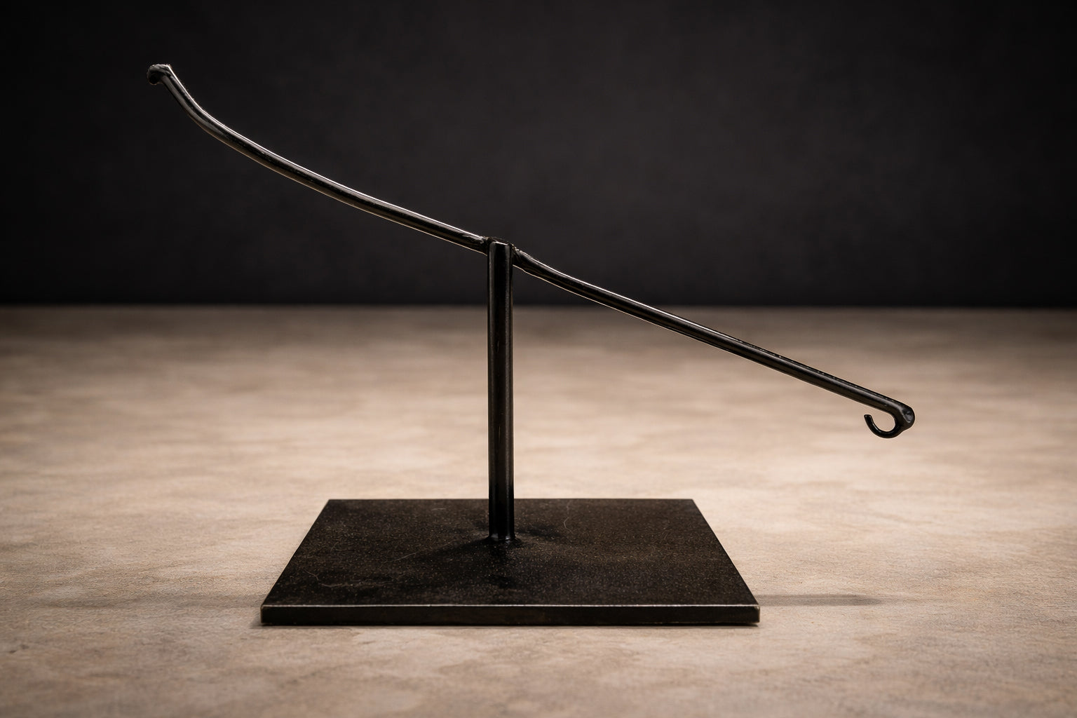 Mounted on a custom black metal stand, the object is presented as it now lives: no longer currency, but artifact. Its silhouette reads as purely modern—almost abstract—bridging ethnographic history and contemporary sculpture. The balance between negative space and forged mass gives it an architectural presence that feels entirely at home in a curated interior.