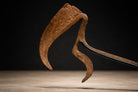 This example embodies that duality of function and symbolism. The sculptural crescent blade, paired with a secondary hooked projection, reflects a typology associated with prestige throwing knives of the Mandara Mountain region. The forged iron surface carries a rich, time-earned patina—deep umber with mineral warmth—revealing the hammer marks and subtle irregularities of hand production. The long, tapering shaft terminates in a faceted pommel, reinforcing both balance and visual rhythm.