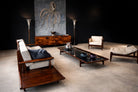 An embedded opaque glass top rests seamlessly within the wooden structure, reinforcing Tenreiro’s interest in integrating materials rather than layering them decoratively. The rosewood has been masterfully restored, revealing exceptional grain and tonal depth, while the original glass surface remains in excellent condition. Notably, the original Brazilian tax stamp from the late 1950s is still present, offering rare documentary evidence of period production and authenticity.