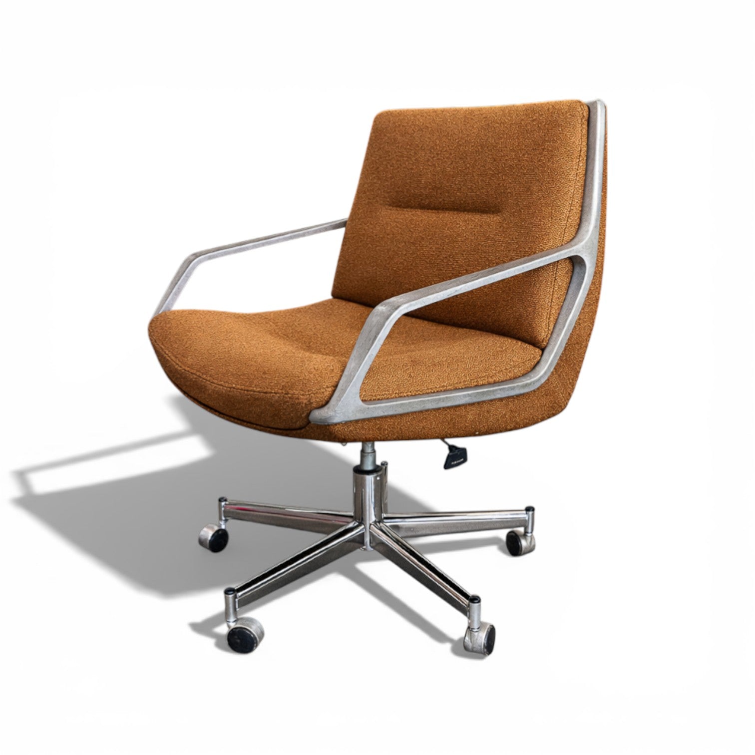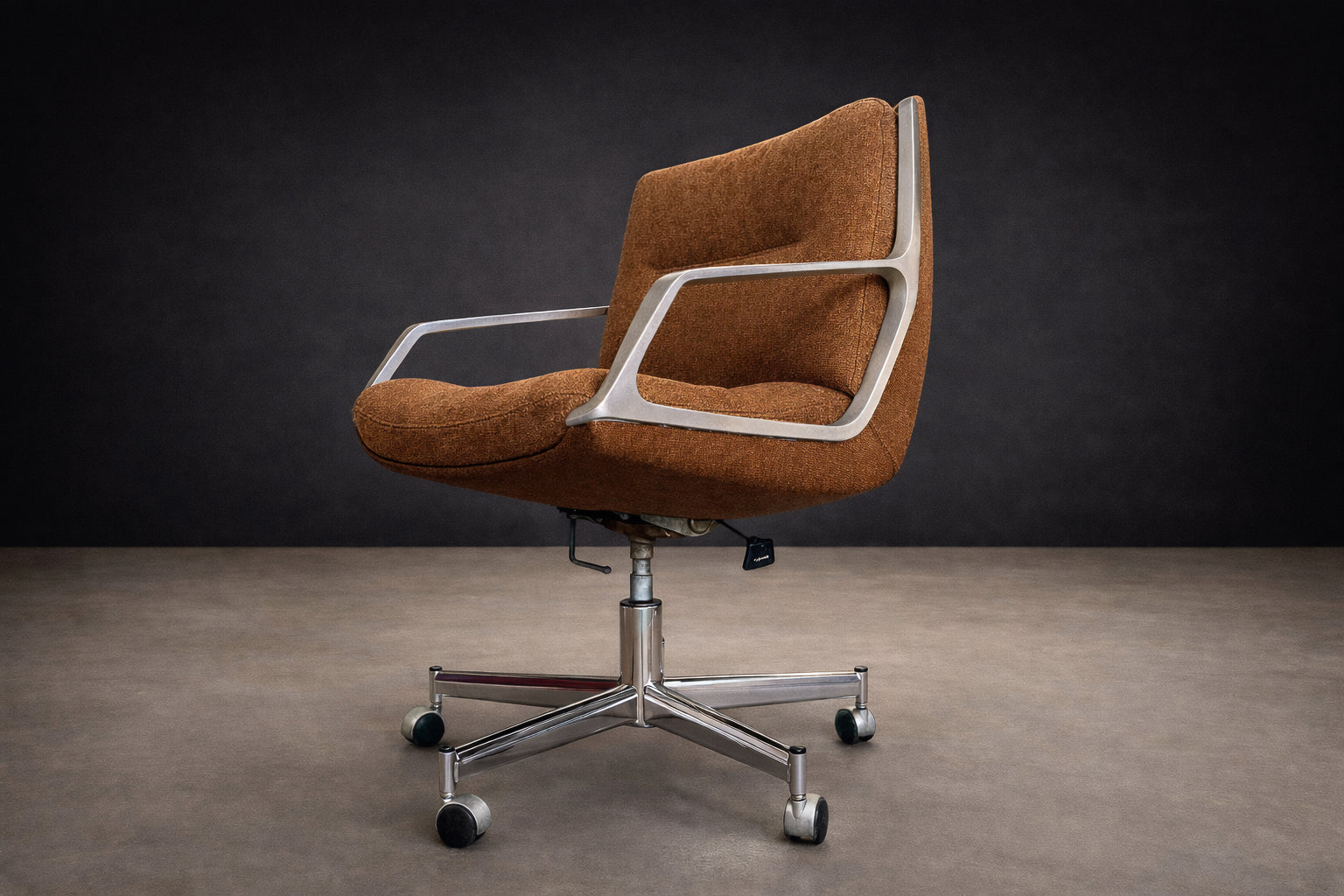 Upholstered in soft bronze-brown chenille, the fiberglass shell retains the integrity of the original design intent, now interpreted through a tactile, contemporary textile. The aluminum armrests maintain a clean, utilitarian finish, underscoring the chair’s industrial lineage. The swivel base and integrated reclining mechanism are discreetly incorporated into the form, reinforcing usability without visual excess.