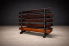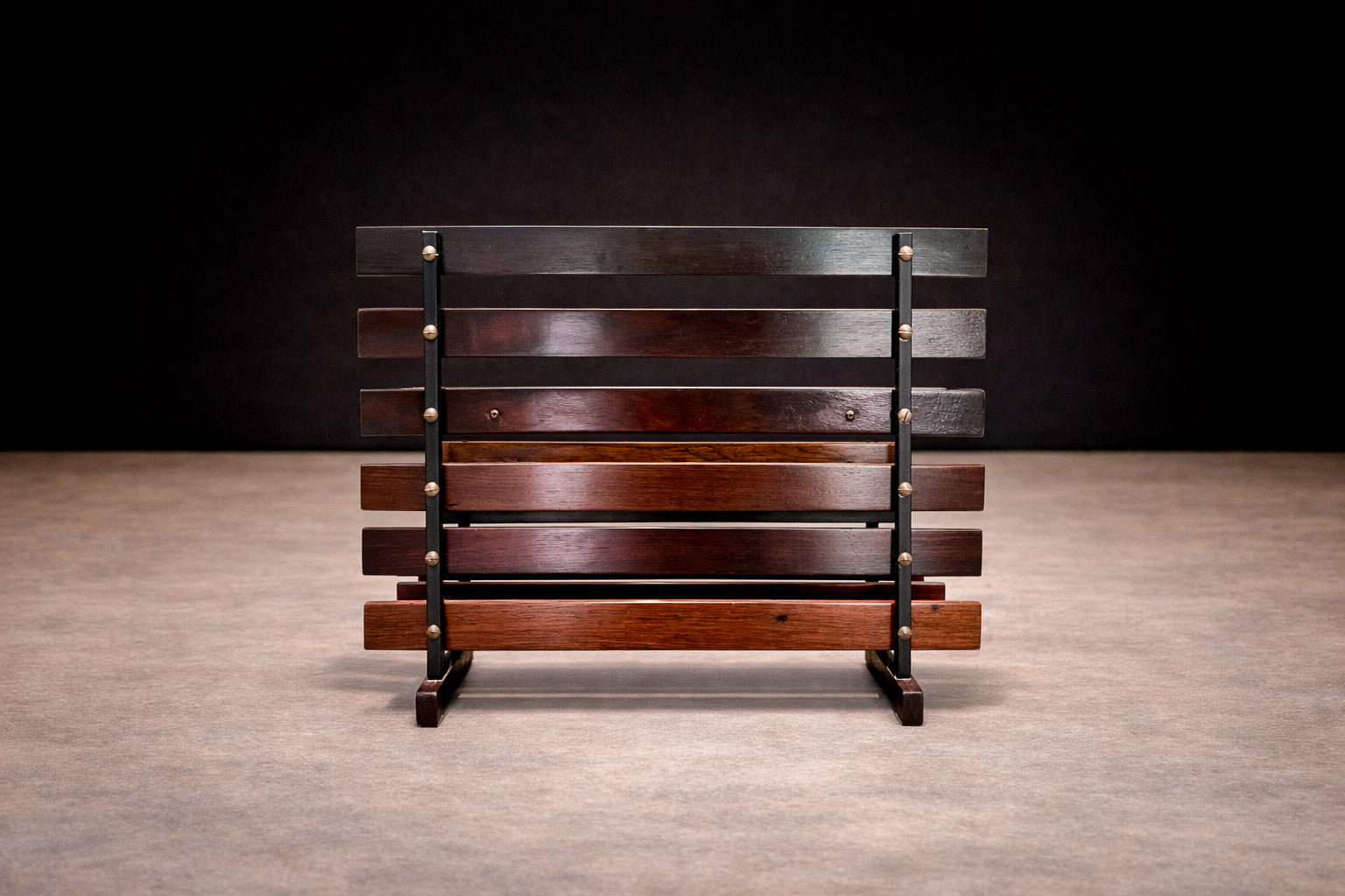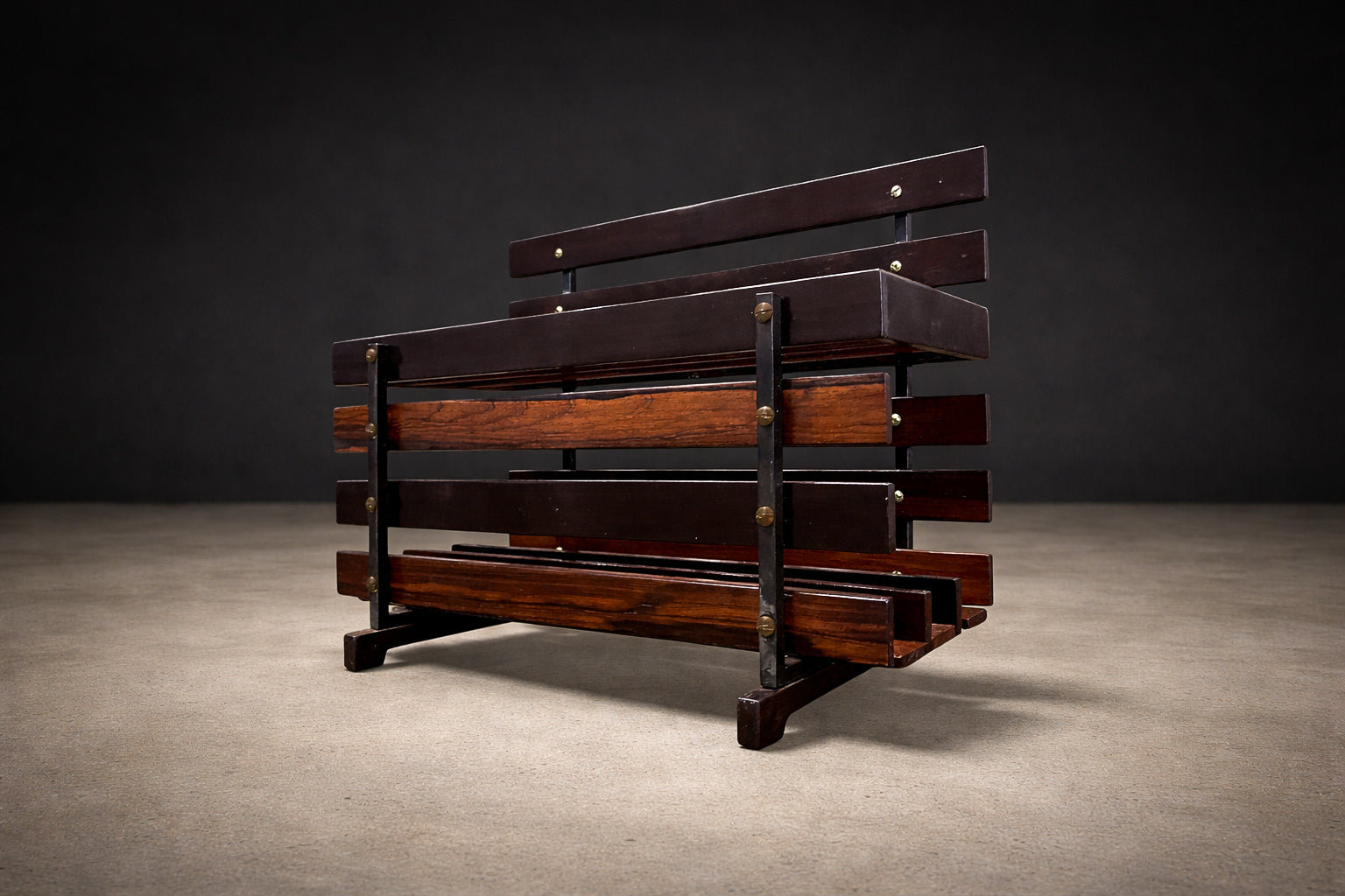 The piece is constructed from solid Brazilian Rosewood (Jacarandá), one of the most coveted hardwoods of the period, celebrated for its deep tonal range and expressive, multicolored grain. The slatted structure features alternating horizontal boards that create a rhythmic visual pattern while allowing air and light to pass through, keeping printed materials organized and elegantly displayed.
