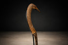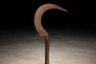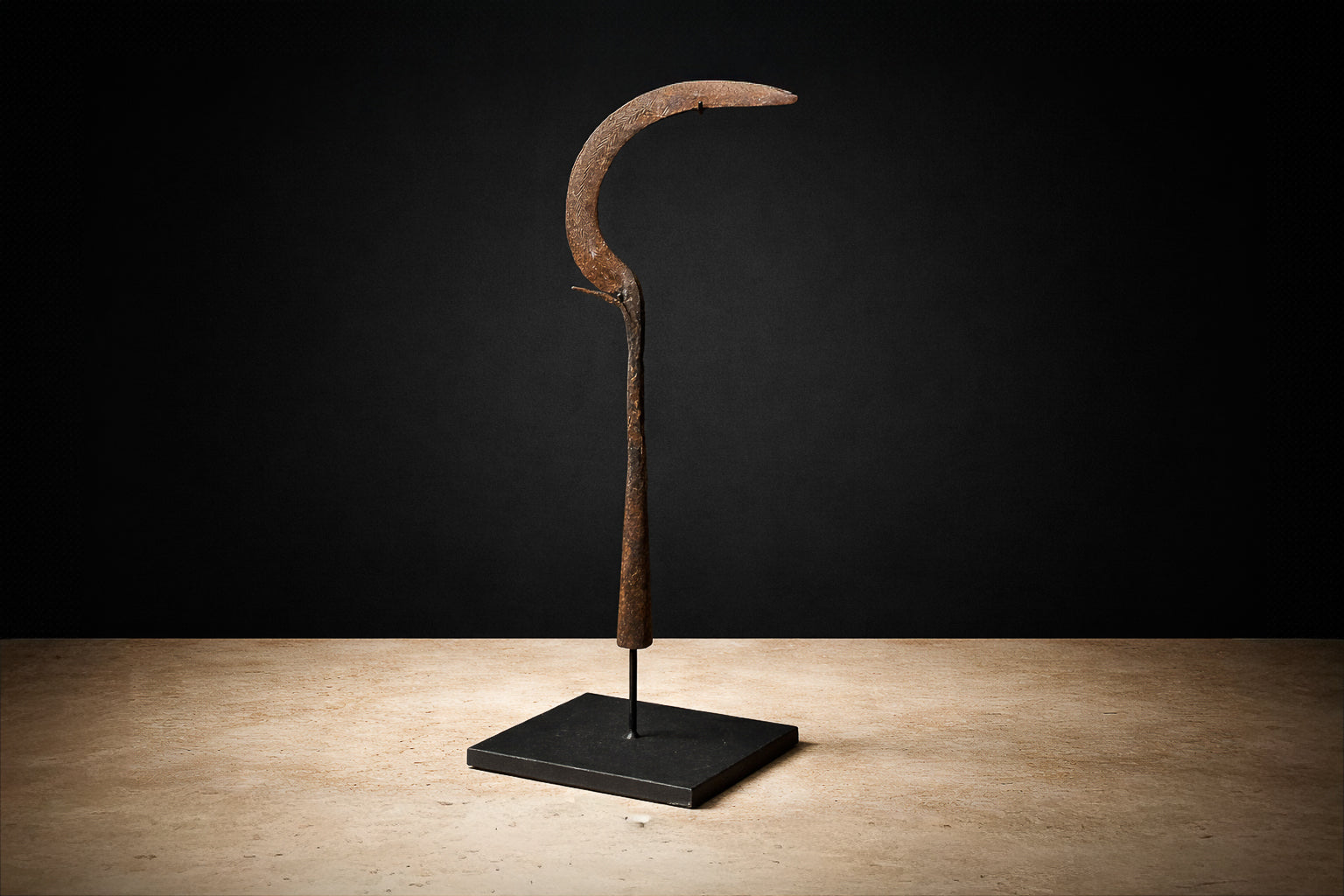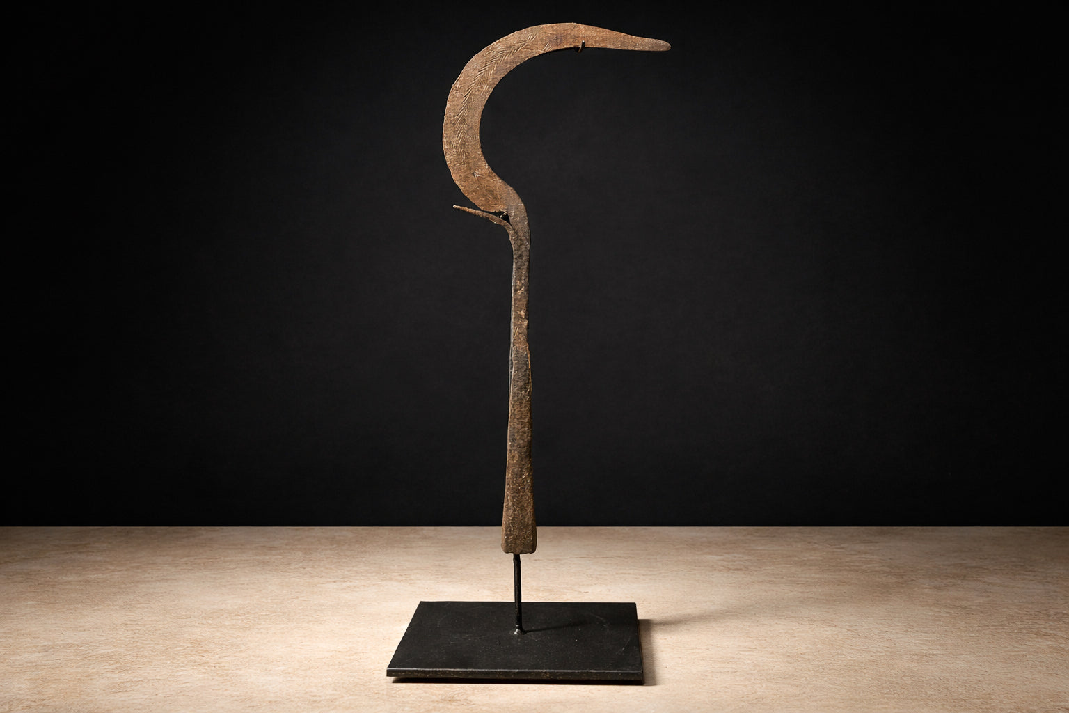 Mounted on a custom-made platform for display, the piece now reads as a refined sculptural object. Its weathered iron patina, subtle textural variations, and dynamic crescent silhouette give it a commanding presence—equally compelling as a collectible ethnographic artifact or as a distinctive decorative accent in a contemporary interior.