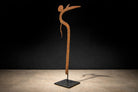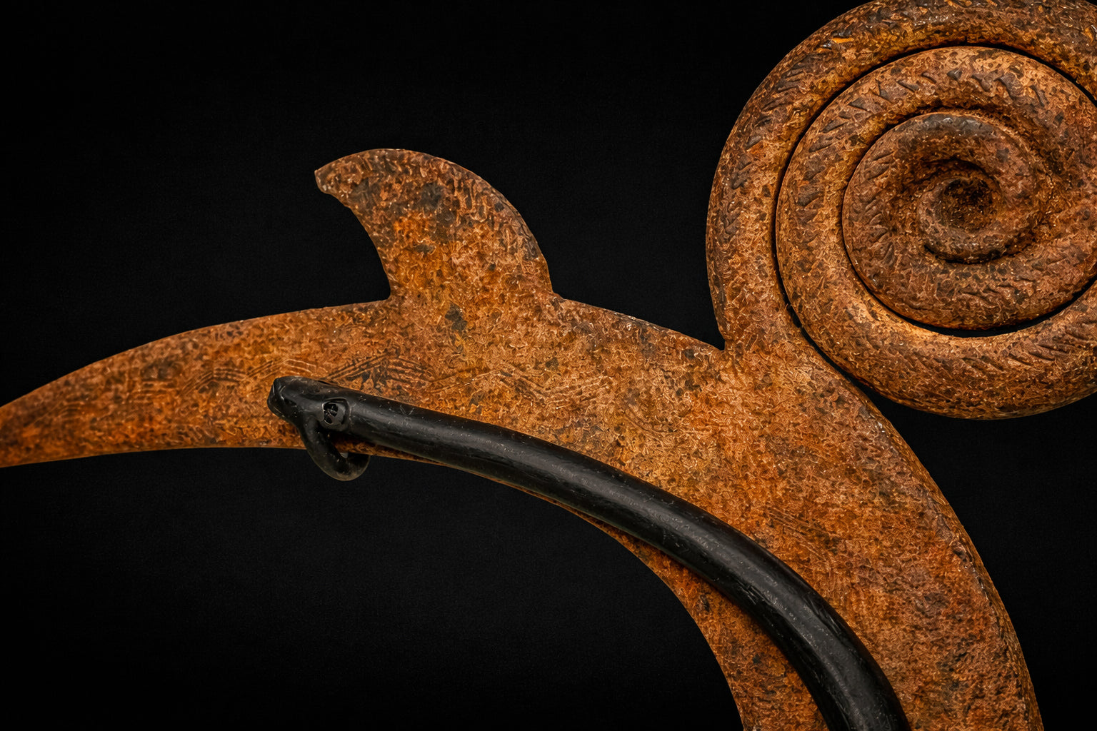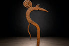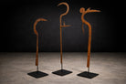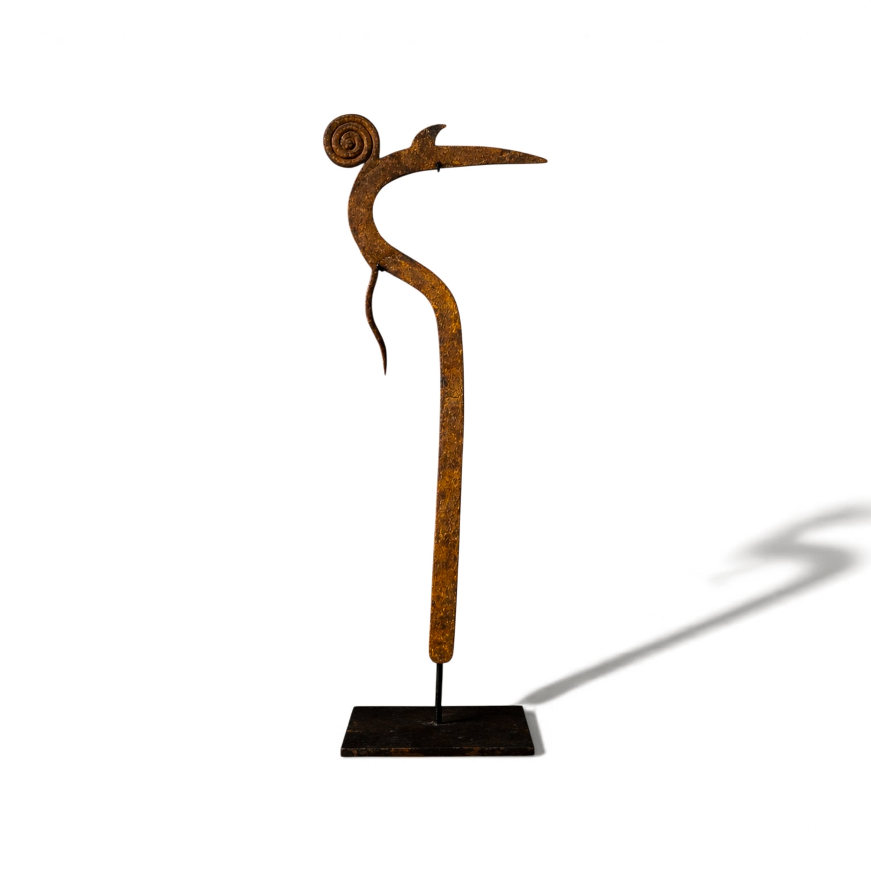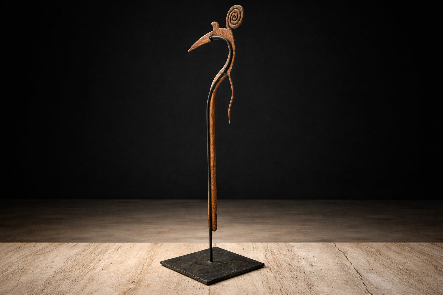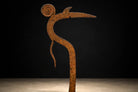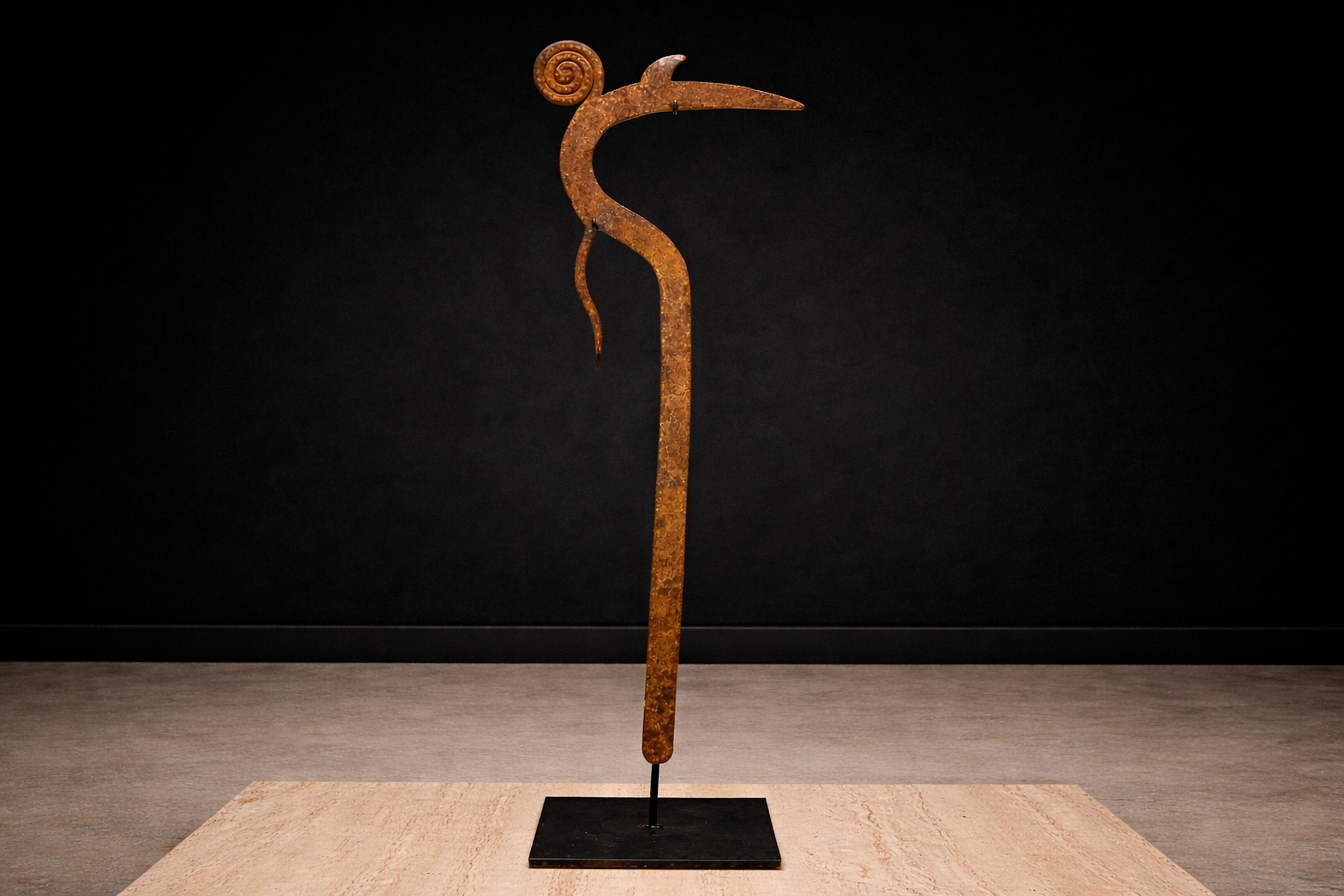 A sculptural iron throwing knife attributed to the Marghi, Mofu, or Kapsiki peoples of northeastern Nigeria and northern Cameroon. Known broadly as a hunga munga, this form transcends utility, occupying the rare territory between weapon, insignia, and ritual object. Forged by hand from iron, the composition is defined by its sinuous, calligraphic profile: a sweeping central shaft terminating in a spiral finial, balanced by a forward-projecting blade and secondary hooked element. The interplay of curve and edge reveals both aerodynamic intention and aesthetic intelligence. The spiral top—at once decorative and symbolic—anchors the form with a quiet authority, while the elongated blade extends outward in poised tension. The surface bears a deep, naturally oxidized patina developed over time, with tonal variations ranging from warm umber to darkened iron. These layers of oxidation are consistent with age and traditional forging methods, preserving the object’s material integrity and historic presence. Mounted on a custom blackened steel stand, the silhouette is presented as the sculpture it has always been. Throwing knives of this type were historically associated with prestige, protection, and ceremonial display, often signifying status within warrior societies. Today, they are recognized as masterworks of Central African metalwork—objects where function and abstraction converge. A compelling addition to collections of African art, ethnographic metalwork, and sculptural modernism.