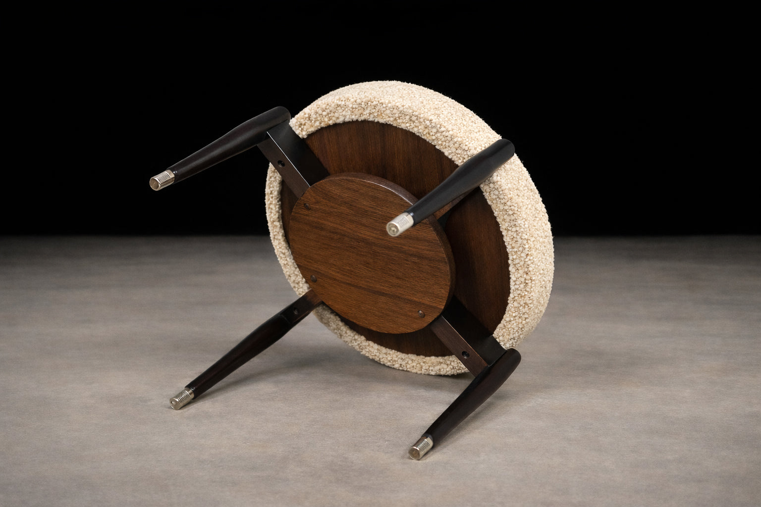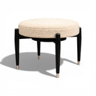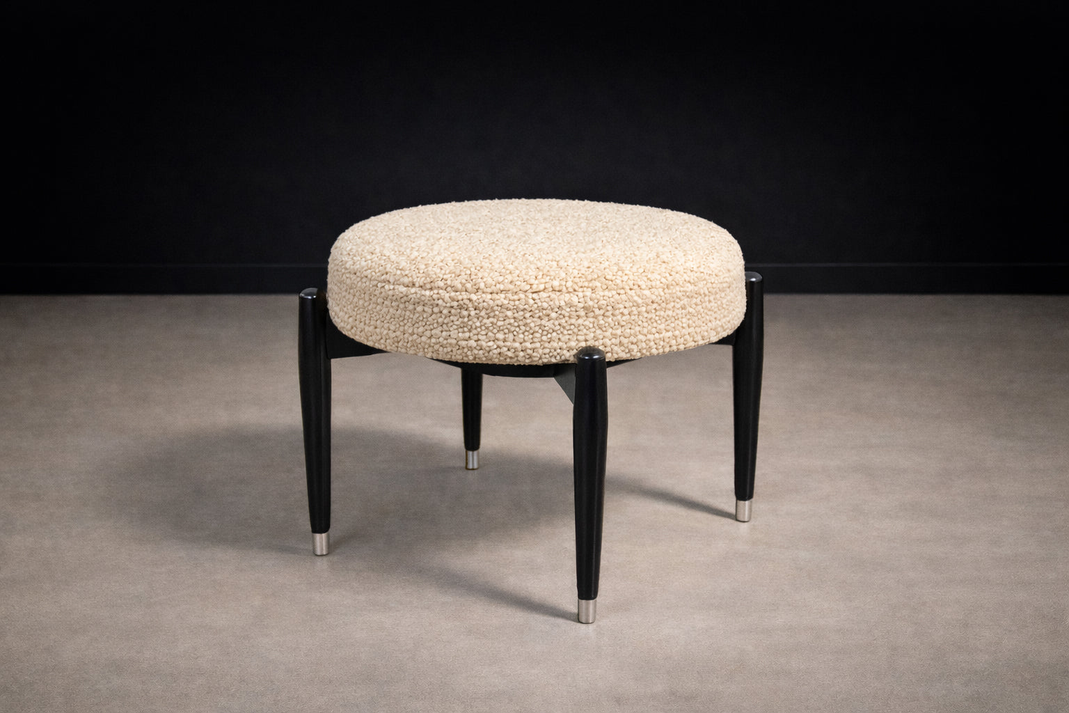 Móveis Cimo Round Stool in Ebonized Wood with Metal Sabots, Brazil, 1950s — Newly Upholstered in Warm Ivory Bouclé - Lot 752