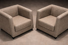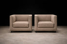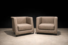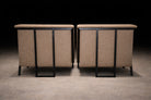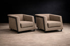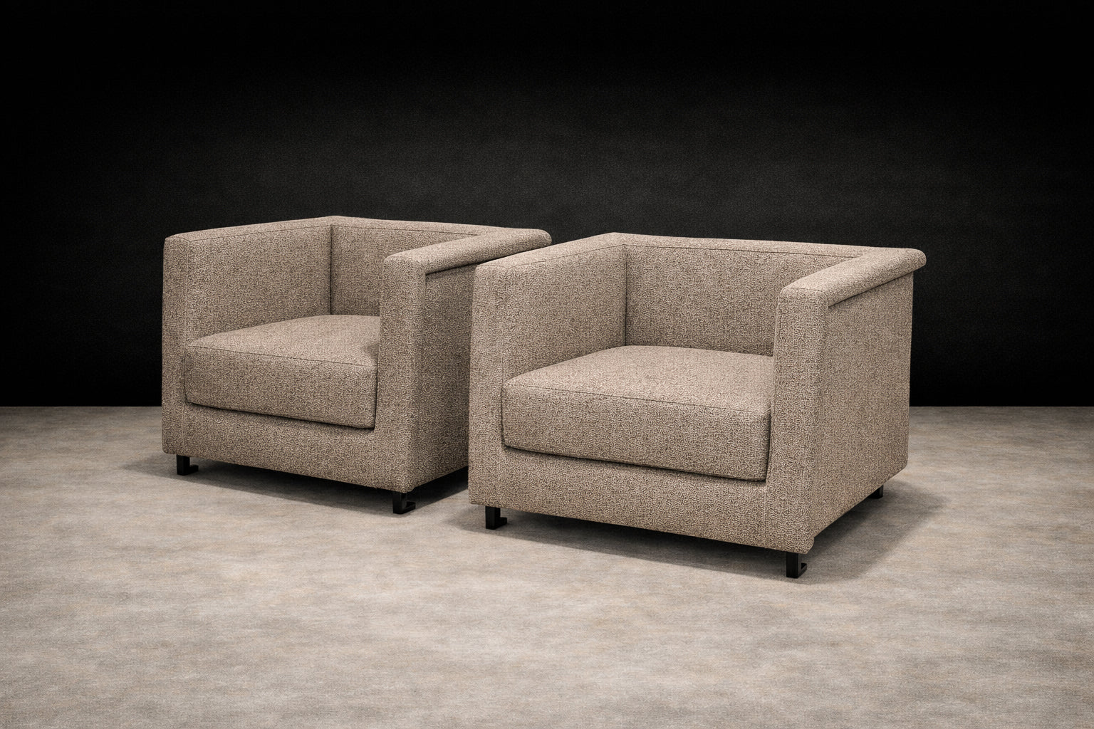 A rare and architecturally disciplined pair of armchairs by Geraldo de Barros, executed in blackened steel and newly upholstered in dense taupe mushroom wool bouclé. Designed in Brazil in the late 1960s to early 1970s, these chairs exemplify de Barros’ commitment to structural clarity, geometric rigor, and material honesty.