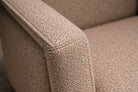 The upholstery is executed in a dense, medium-weight wool-blend bouclé in a refined taupe mushroom tone — warm yet restrained, matte in finish, and tightly looped for a tailored, architectural surface. The texture adds depth without visual noise, maintaining the integrity of the silhouette. The slightly recessed seat and controlled proportions create both comfort and compositional balance.
