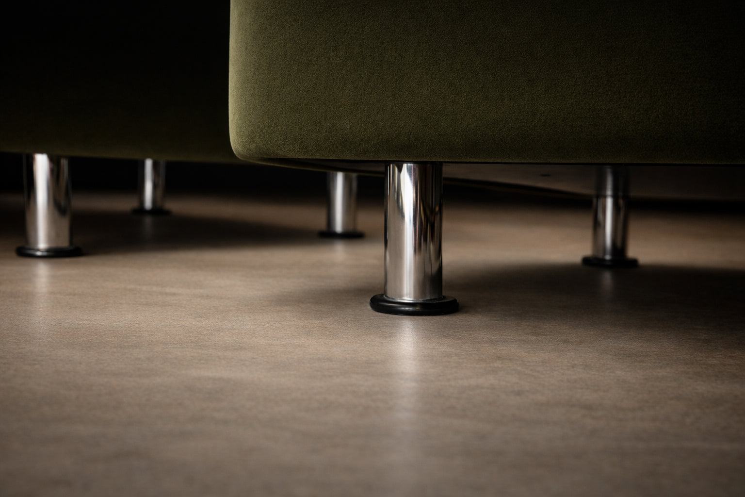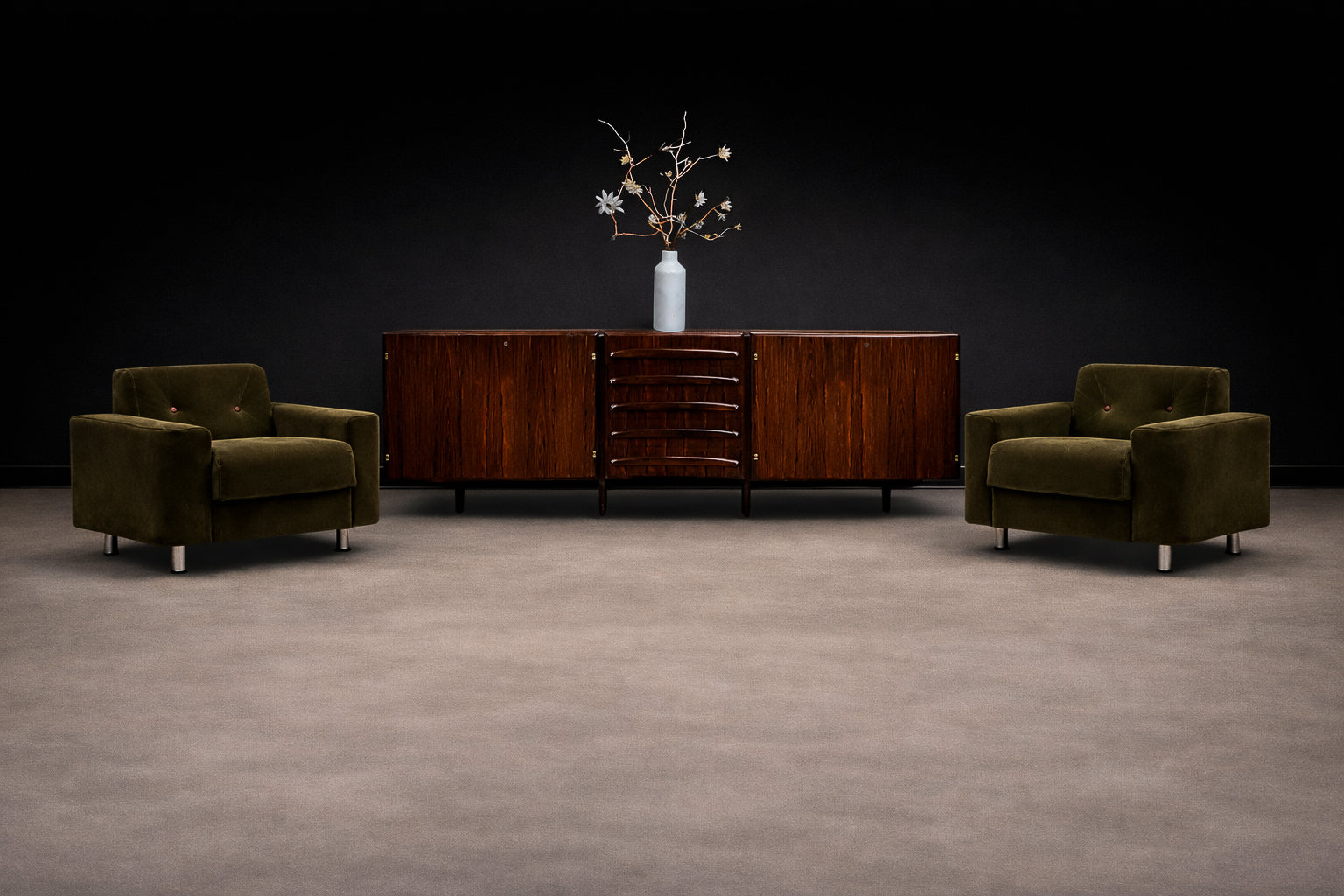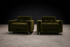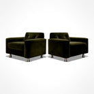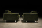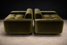 Defined by its disciplined cubic form and low, commanding stance, the design rests on cylindrical steel legs that subtly lift the mass from the floor, reinforcing its architectural presence. The internal wooden frame ensures structural integrity, while the generously scaled cushions provide exceptional comfort. Newly reupholstered in a deep dark olive green velvet, the chairs acquire a rich tonal depth—luxurious yet restrained, and particularly compelling against rosewood environments.
