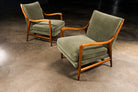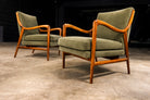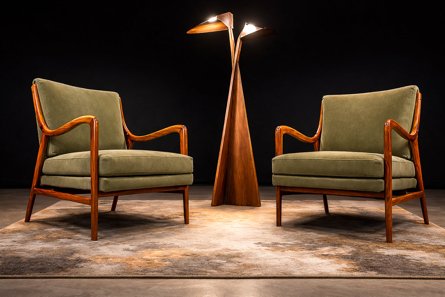 The chairs have been newly upholstered in a refined dusty olive cotton mohair velvet, selected to complement the warmth of the caviúna while reinforcing the understated elegance of the design. The dense velvet pile introduces subtle depth and tactility, while the desaturated moss tone maintains a sophisticated mid-century palette. The cushions have been tailored with clean lines and slightly fuller proportions, enhancing both comfort and visual presence without altering the original geometry of the design.
