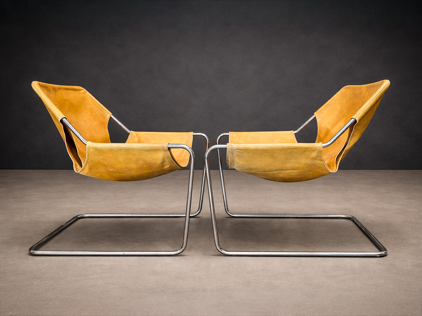 Offered here as a matching pair, entirely in stainless steel with original leather seats, preserved in original condition. A foundational work of twentieth-century design—where architecture, industry, and everyday life converge.