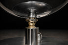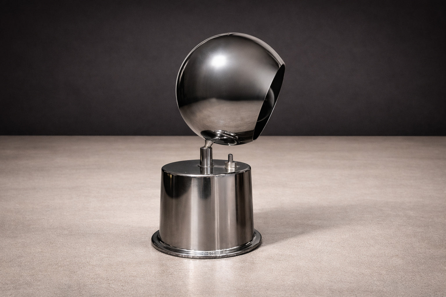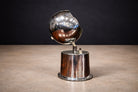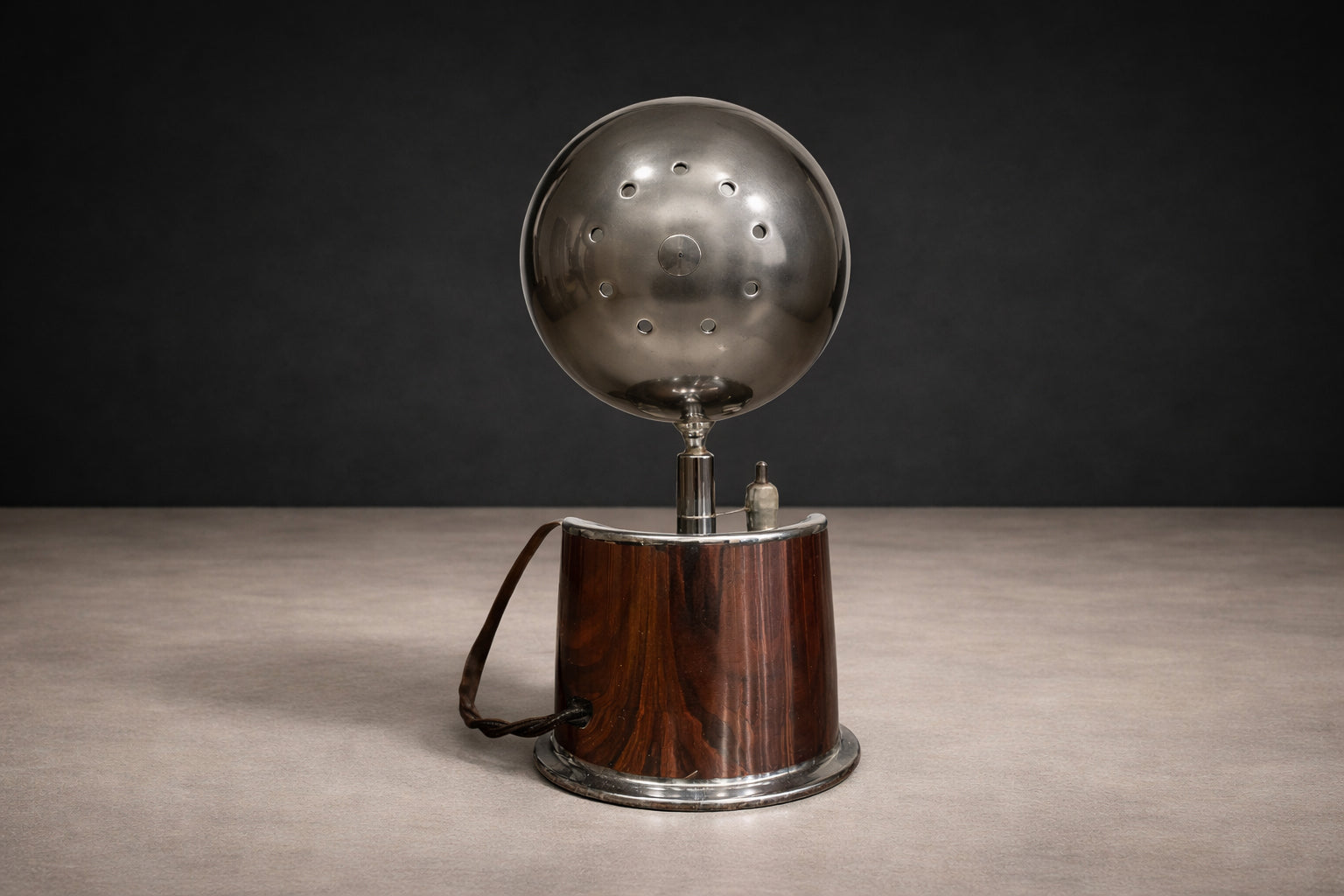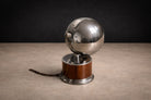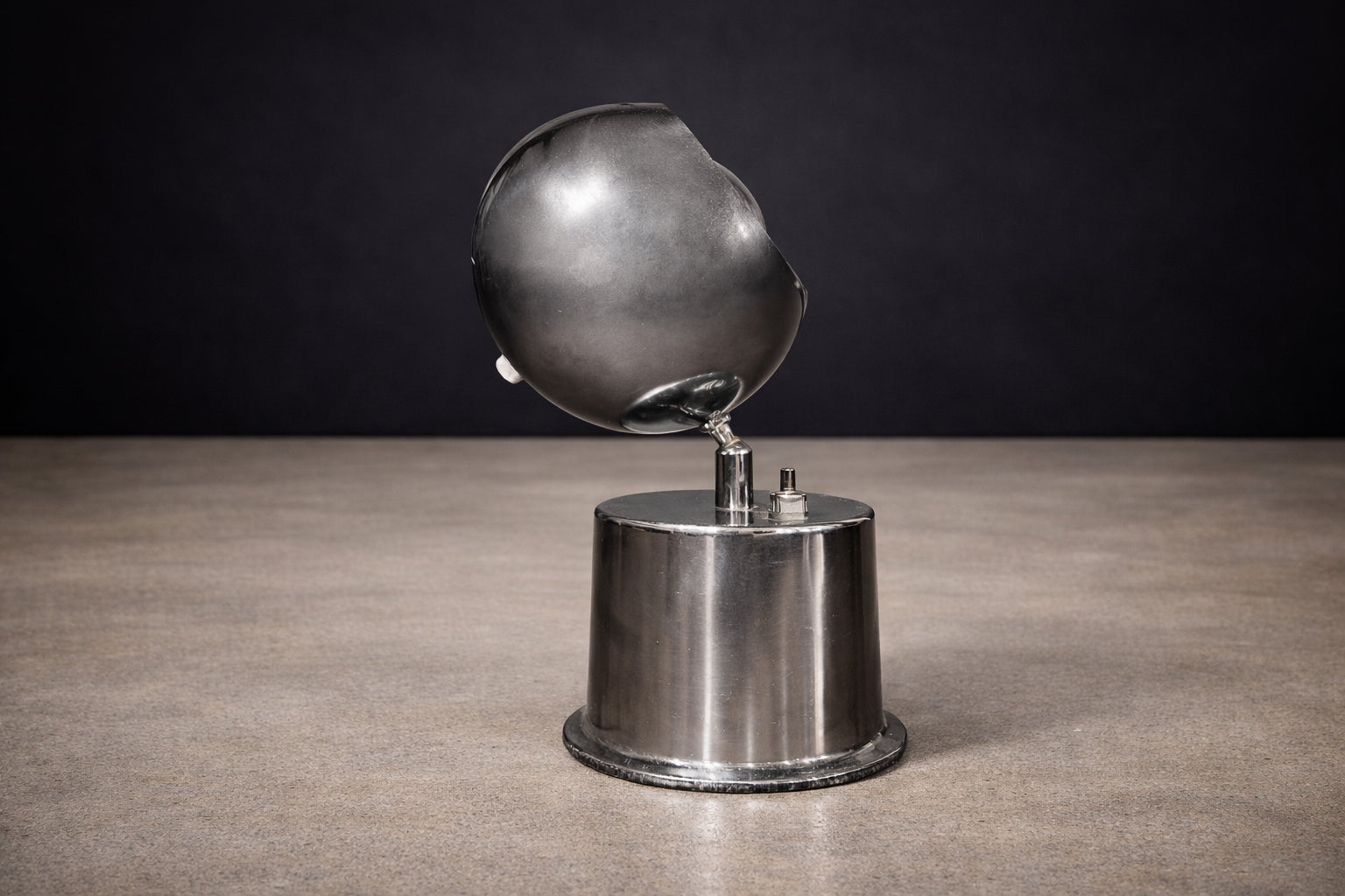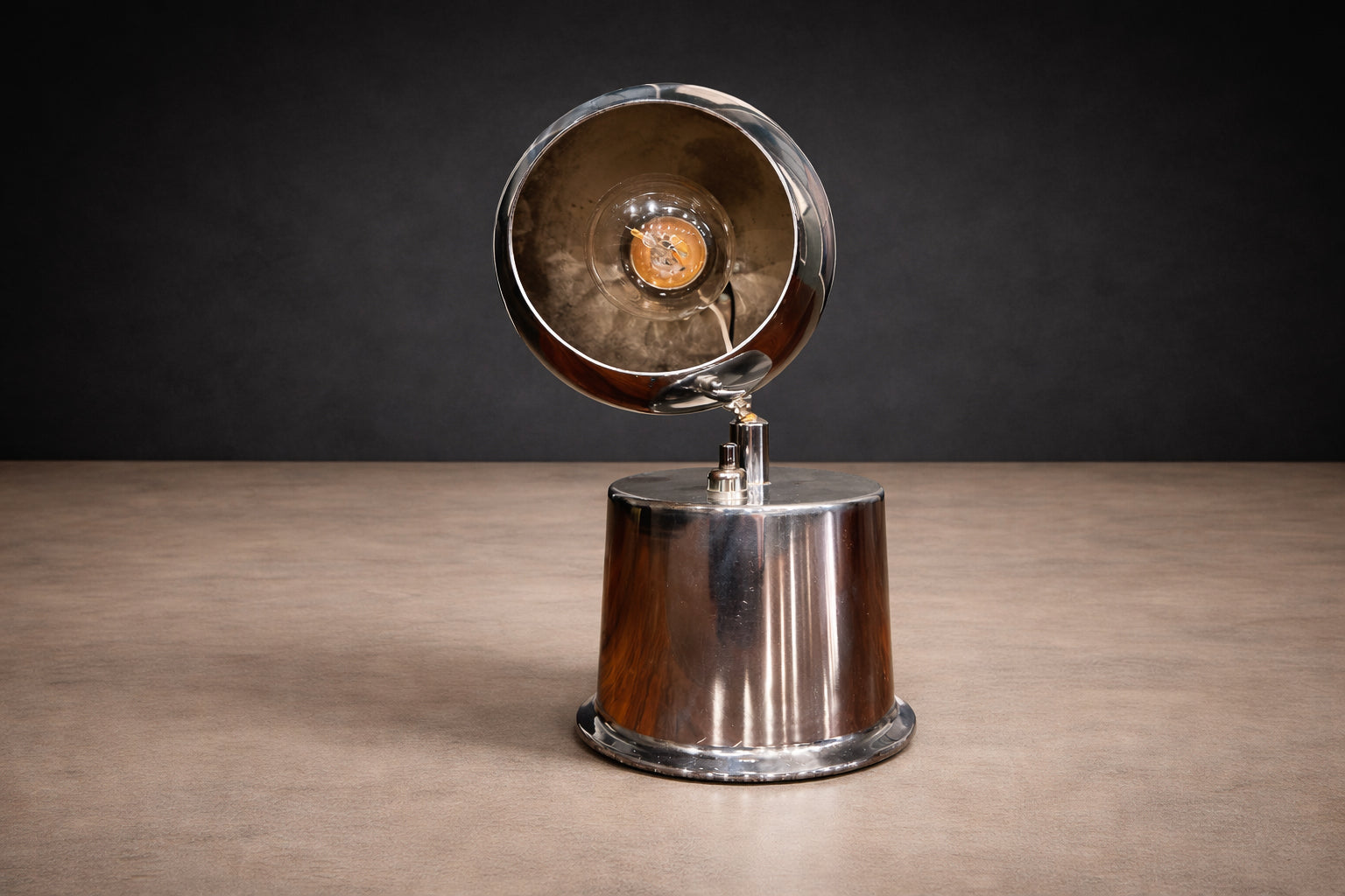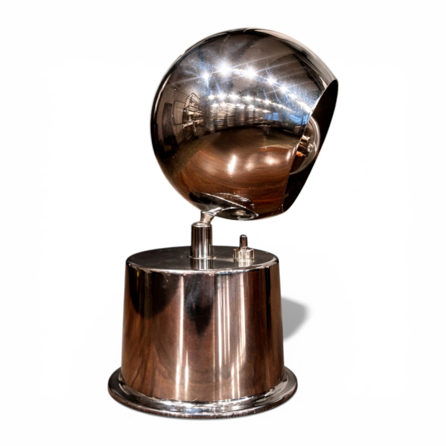 A sculptural Brazilian Modern table lamp by Dominici, Brazil, 1950s—executed in plated chrome and defined by its pure geometric clarity. The polished spherical shade, partially cut to reveal the bulb within, rests on a cylindrical base, creating a bold dialogue between curve and volume characteristic of mid-century Brazilian industrial design.