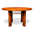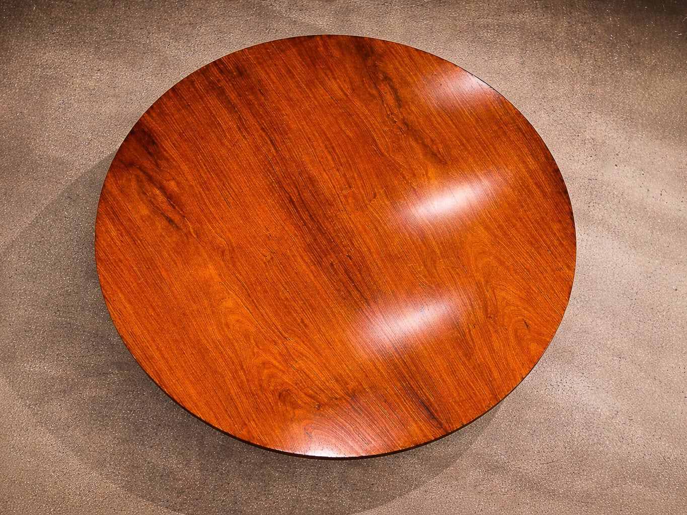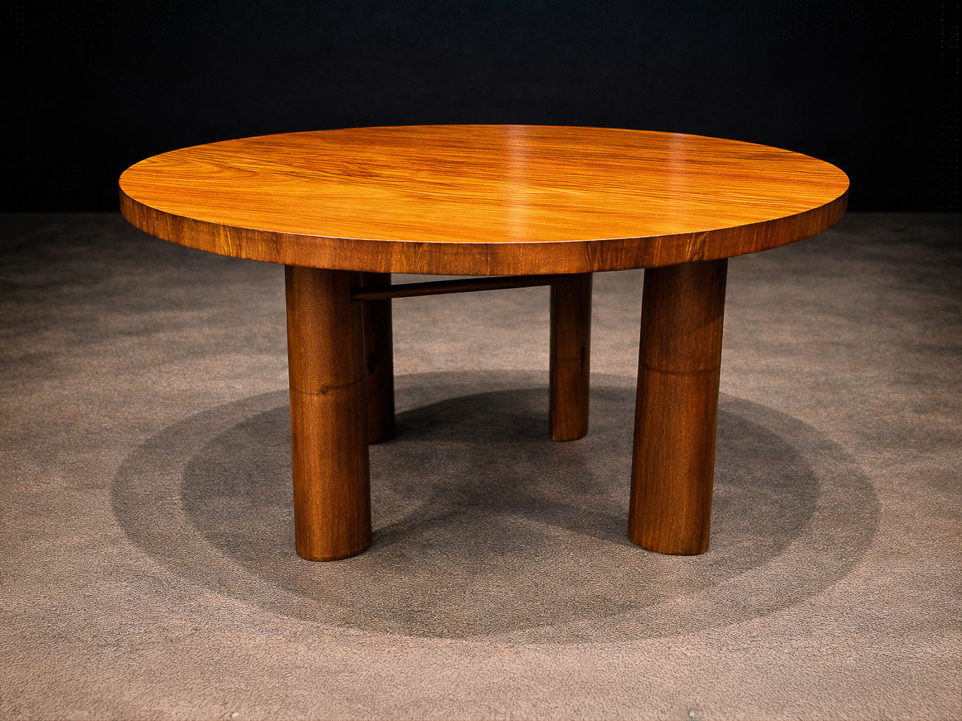 Executed entirely in caviúna wood and caviúna veneer, the table features a generous circular top supported by four elliptical-shaped legs, joined by discreet cross bars. This elliptical leg profile became an iconic element of Tenreiro’s tables in the late 1950s and early 1960s, allowing substantial mass to be resolved with visual lightness and sculptural elegance. The form reflects his deep understanding of proportion and load, transforming structural necessity into a defining aesthetic signature.