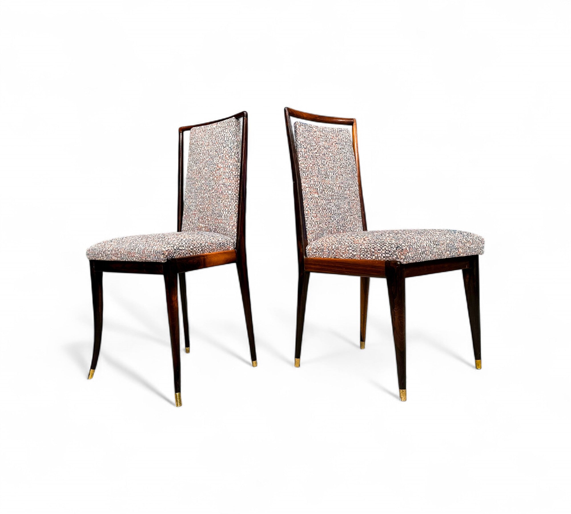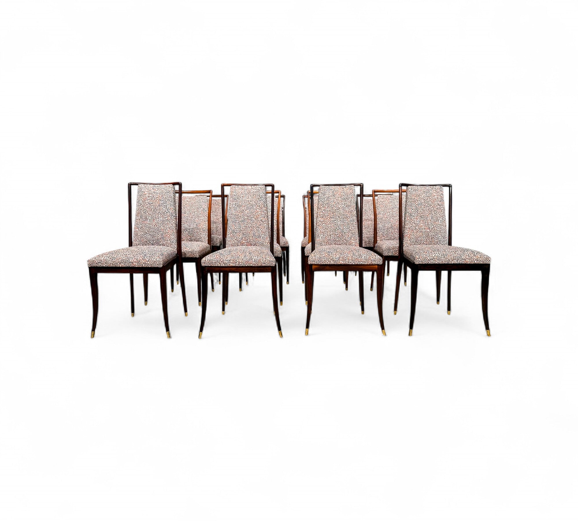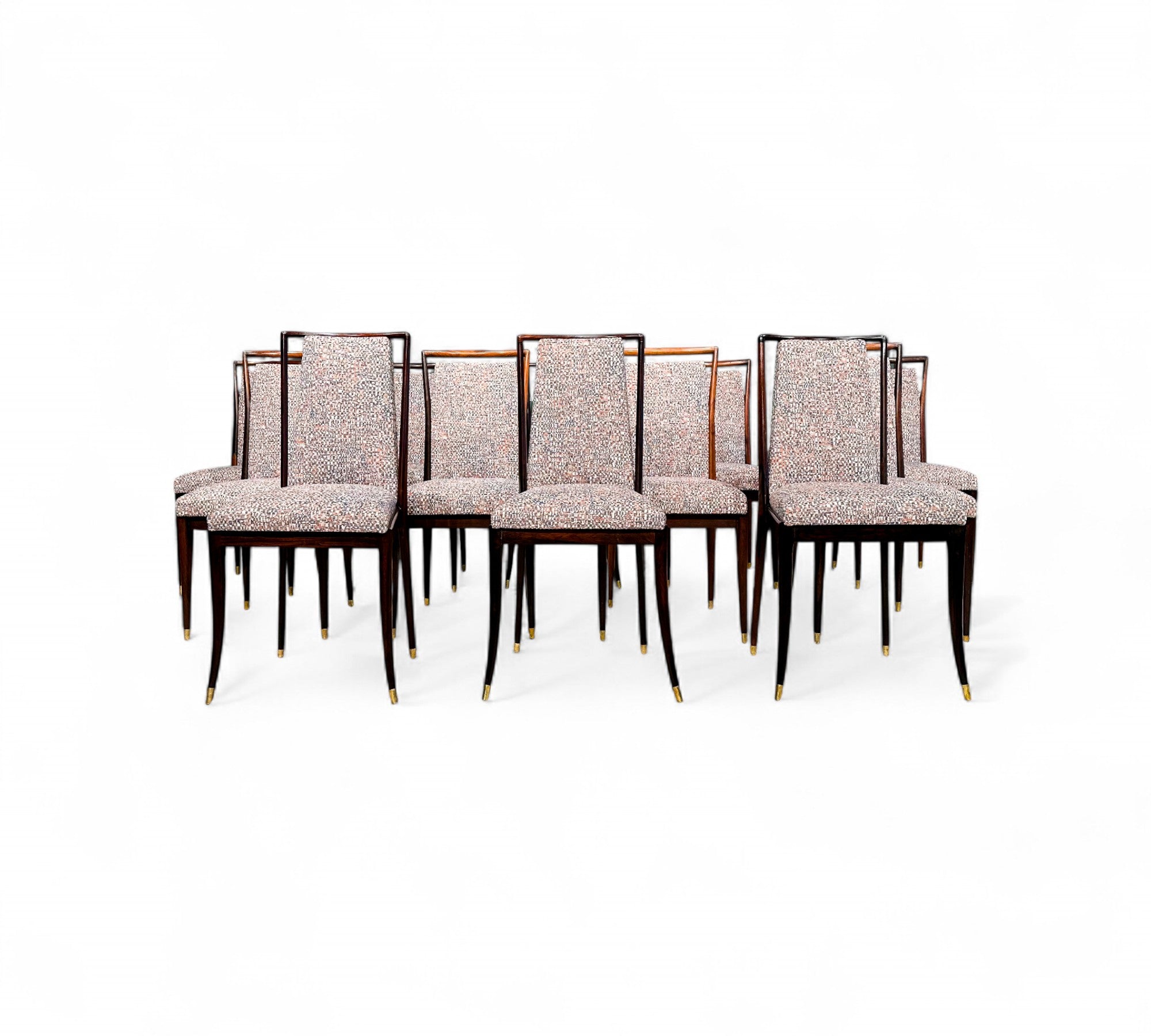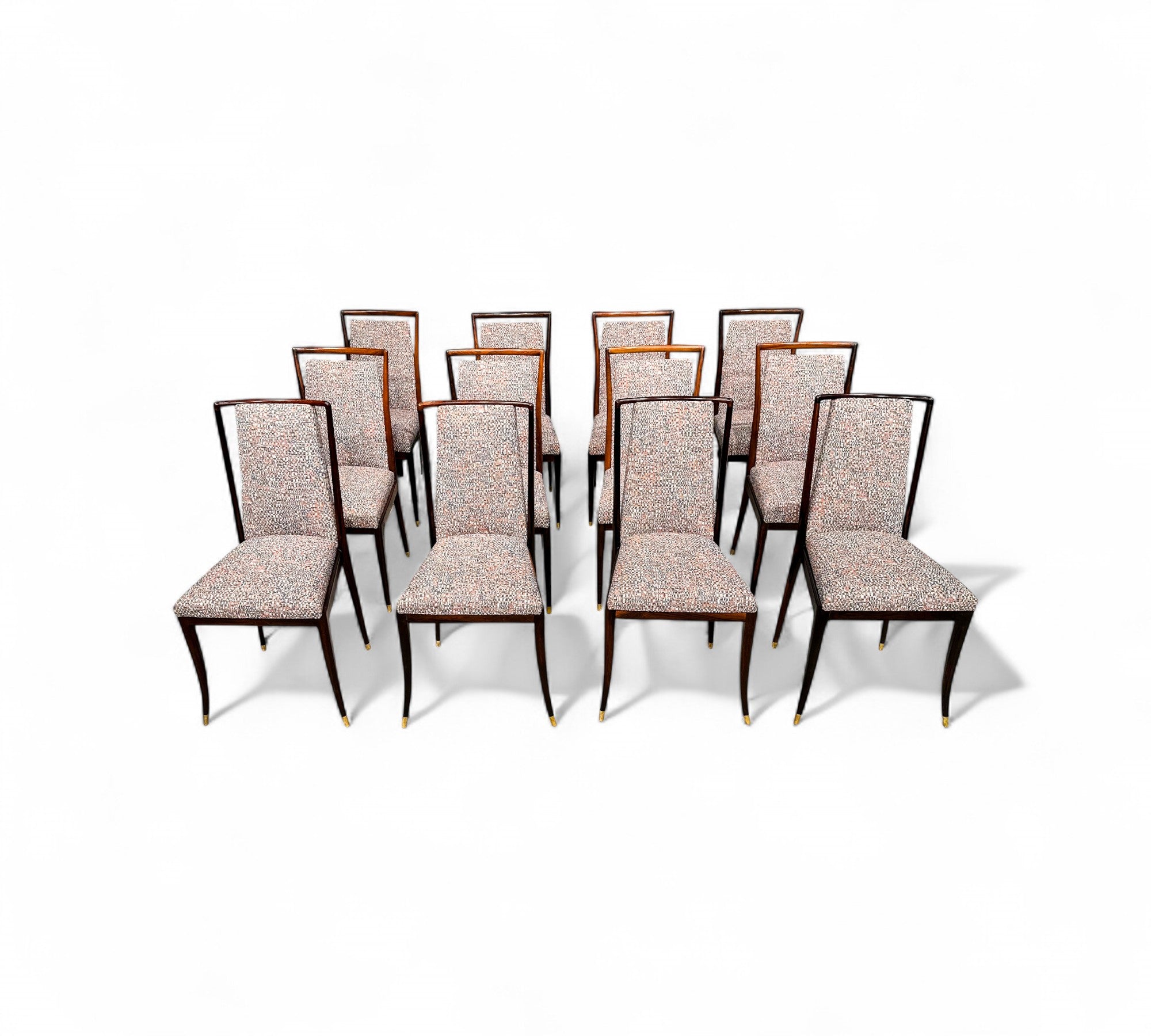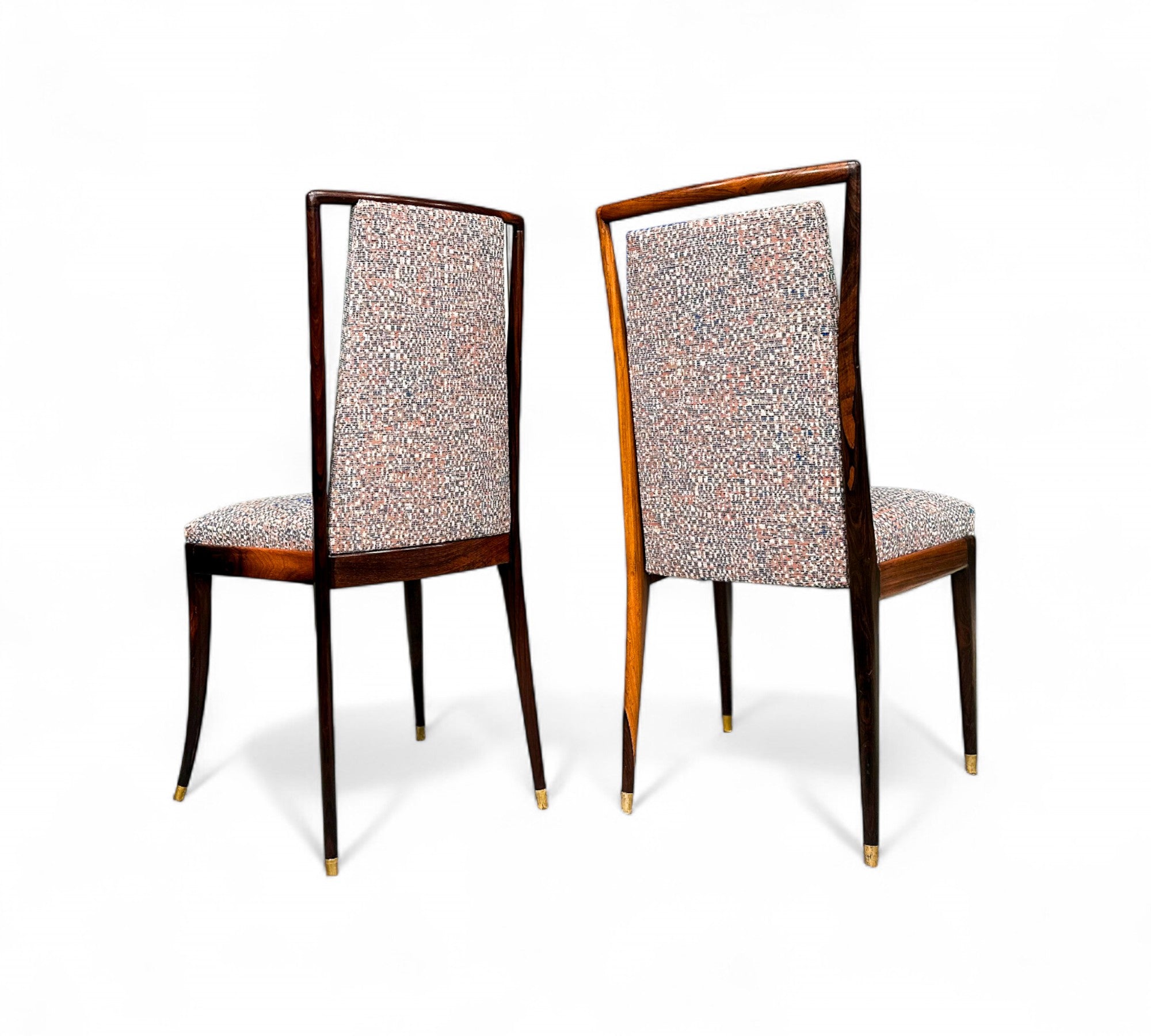 Presenting an elegant and sculptural set of twelve dining chairs, expertly crafted in rosewood and newly reupholstered in a refined multicolored patterned fabric. The set includes eight chairs with straight tapered legs and four with gracefully curved legs, all capped with brass for a touch of sophistication. The tall backrests and clean lines highlight the timeless beauty of Brazilian modern design. Each frame has been expertly refinished and remains in excellent condition, showcasing both craftsmanship and comfort.