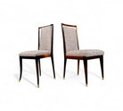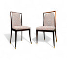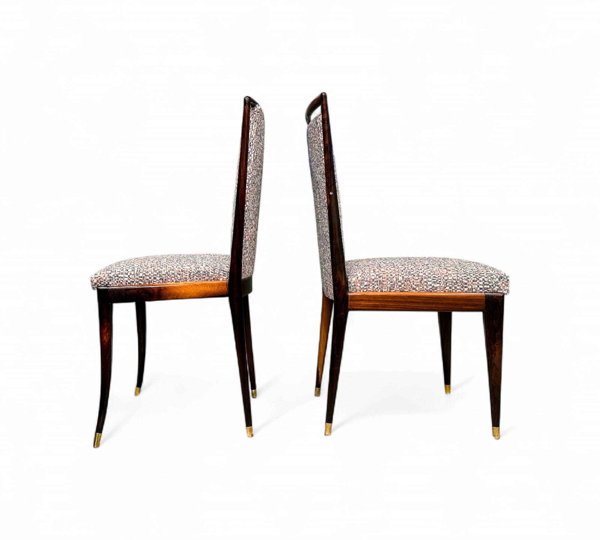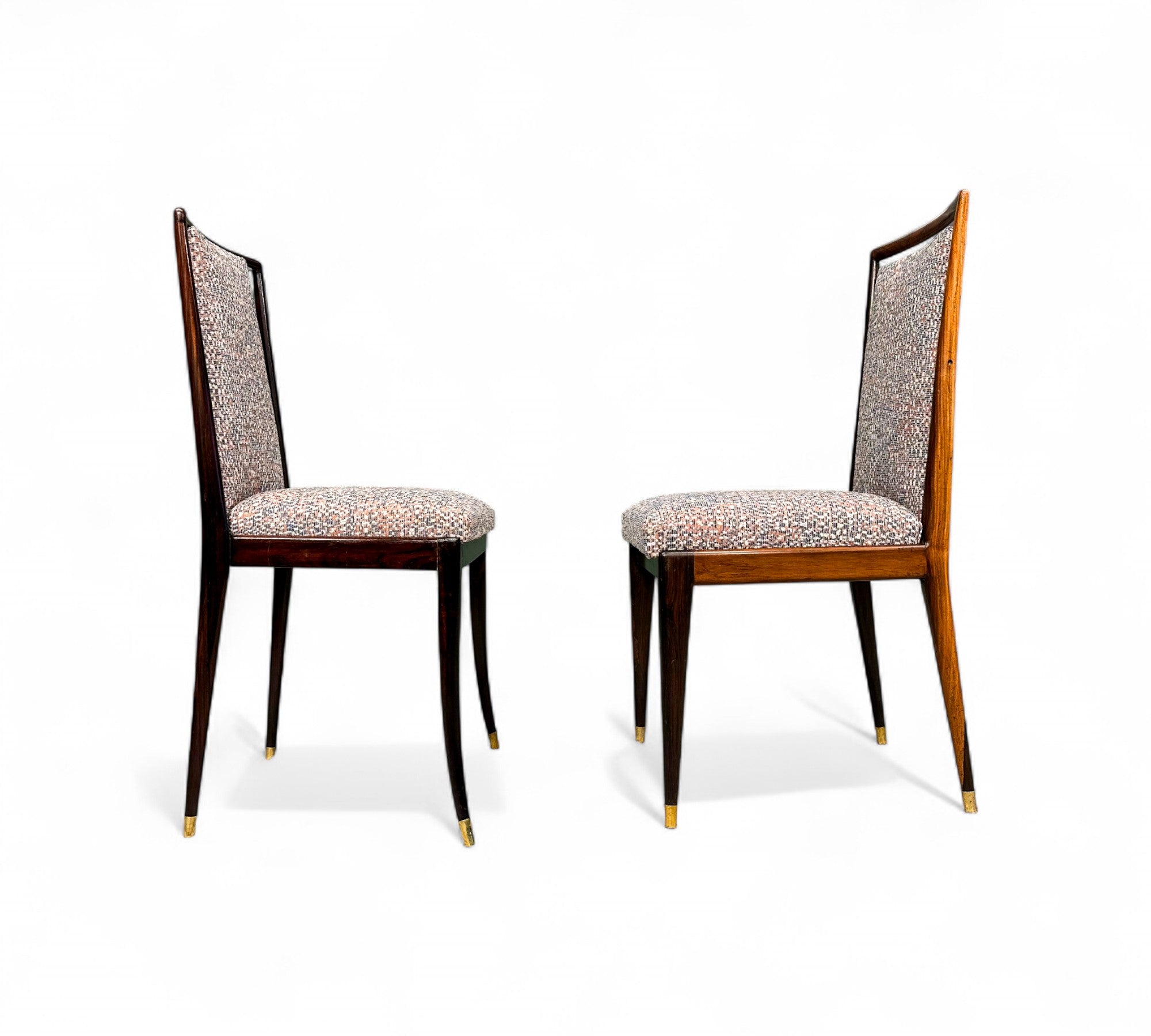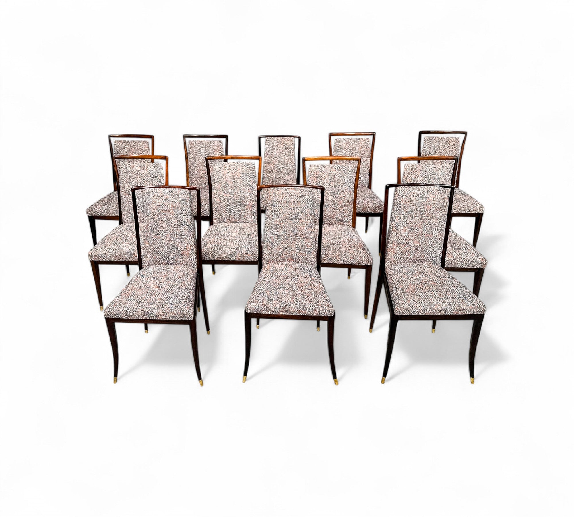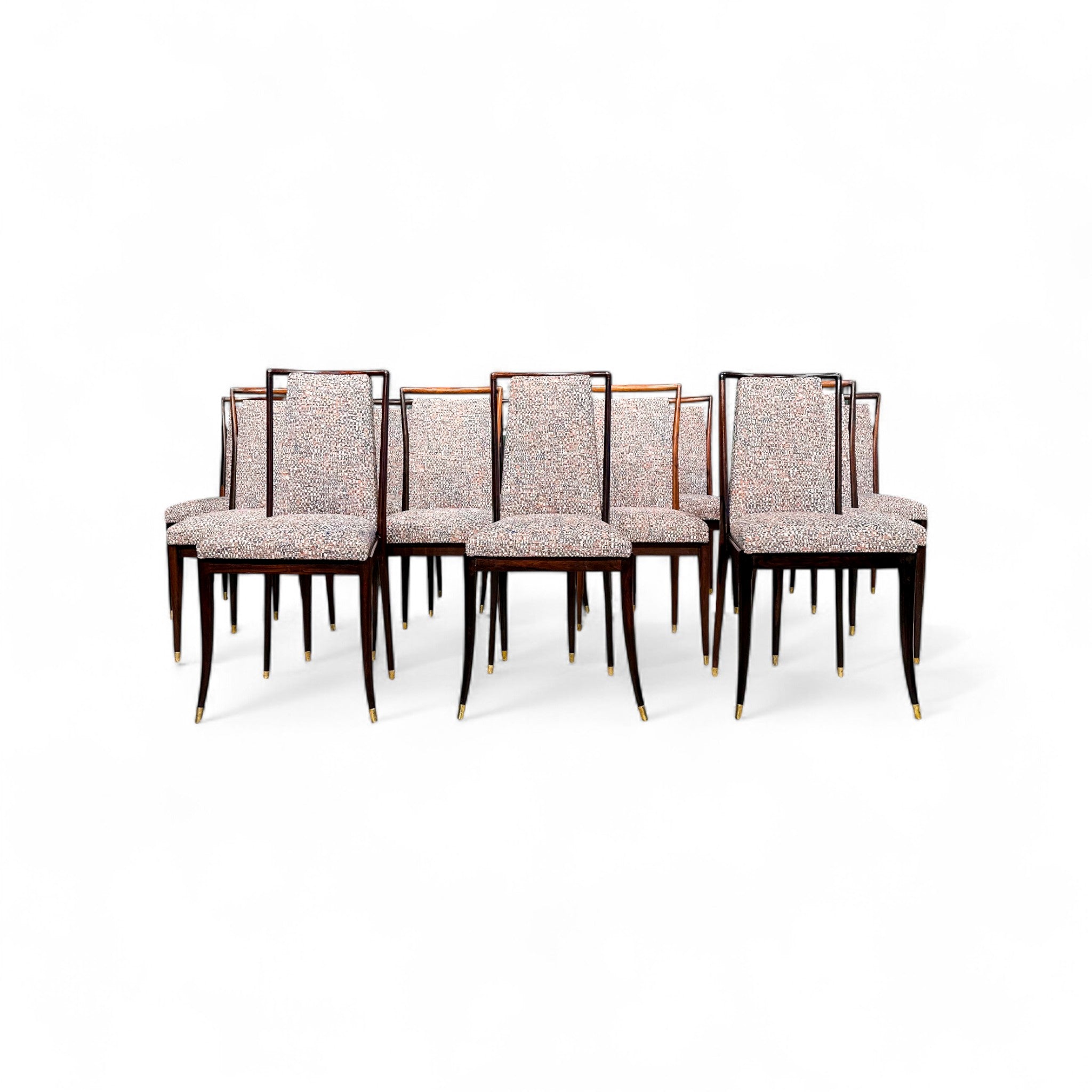 Presenting an elegant and sculptural set of twelve dining chairs, expertly crafted in rosewood and newly reupholstered in a refined multicolored patterned fabric. The set includes eight chairs with straight tapered legs and four with gracefully curved legs, all capped with brass for a touch of sophistication. The tall backrests and clean lines highlight the timeless beauty of Brazilian modern design. Each frame has been expertly refinished and remains in excellent condition, showcasing both craftsmanship and comfort.