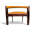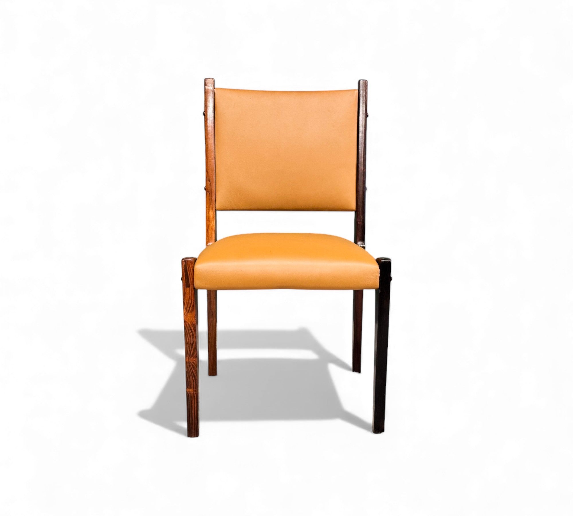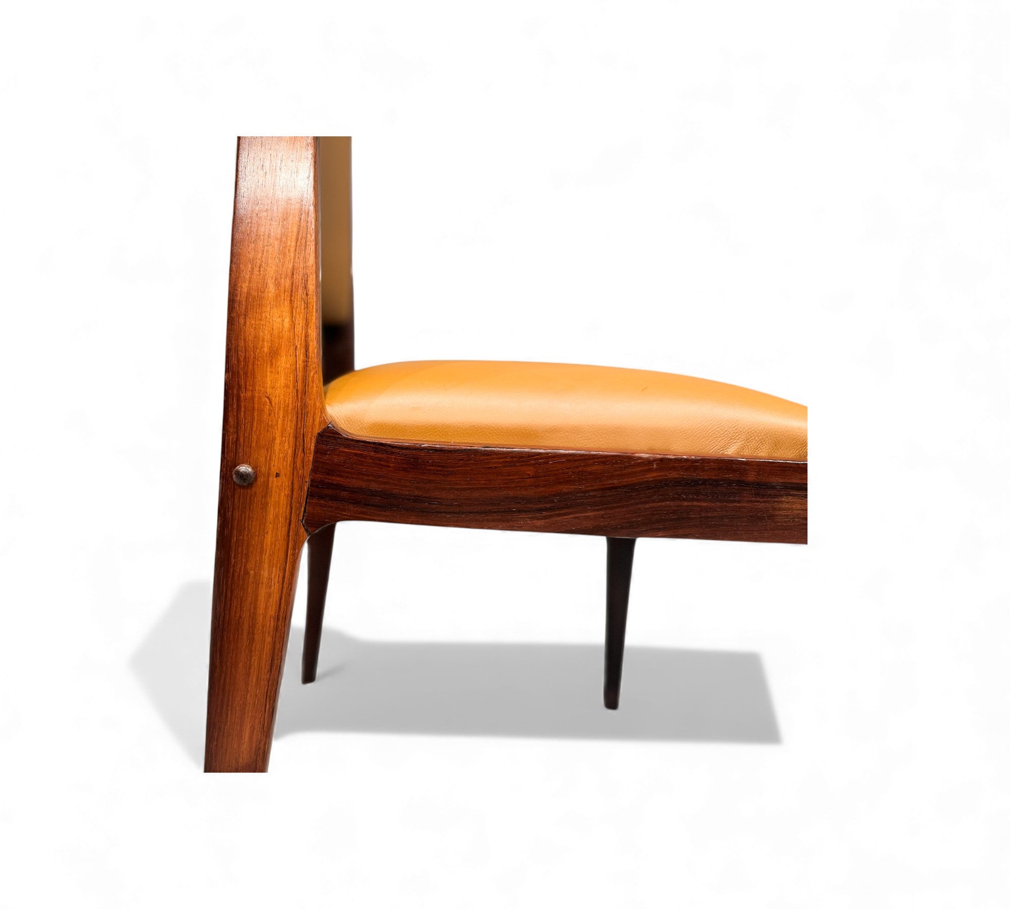 Each of these chairs features a solid rosewood frame paired with light brown leather upholstery, presenting a clean, almost brutalist aesthetic. Originally designed for Bloch Editors—a major Brazilian publishing and broadcasting conglomerate—these chairs were part of the modern furniture commissioned for the company’s headquarters in São Paulo. Created by renowned designers Sergio Rodrigues and Joaquim Tenreiro, they embody a distinctive blend of Brazilian modernist style and everyday functionality.