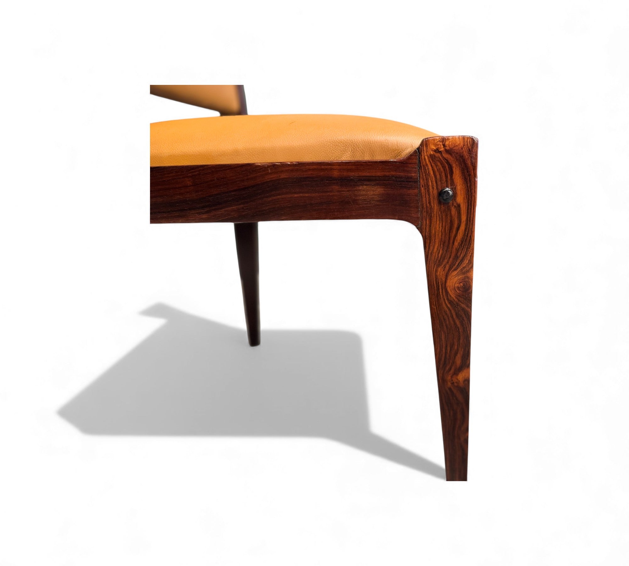 The chairs have been reupholstered in a similar light brown tone, maintaining the look and feel of the original upholstery. The rosewood frames have been refinished to reveal the richness of the wood grain, with minor age-related marks visible on the legs. Many examples still retain the original Bloch heritage plaques on the backrests.