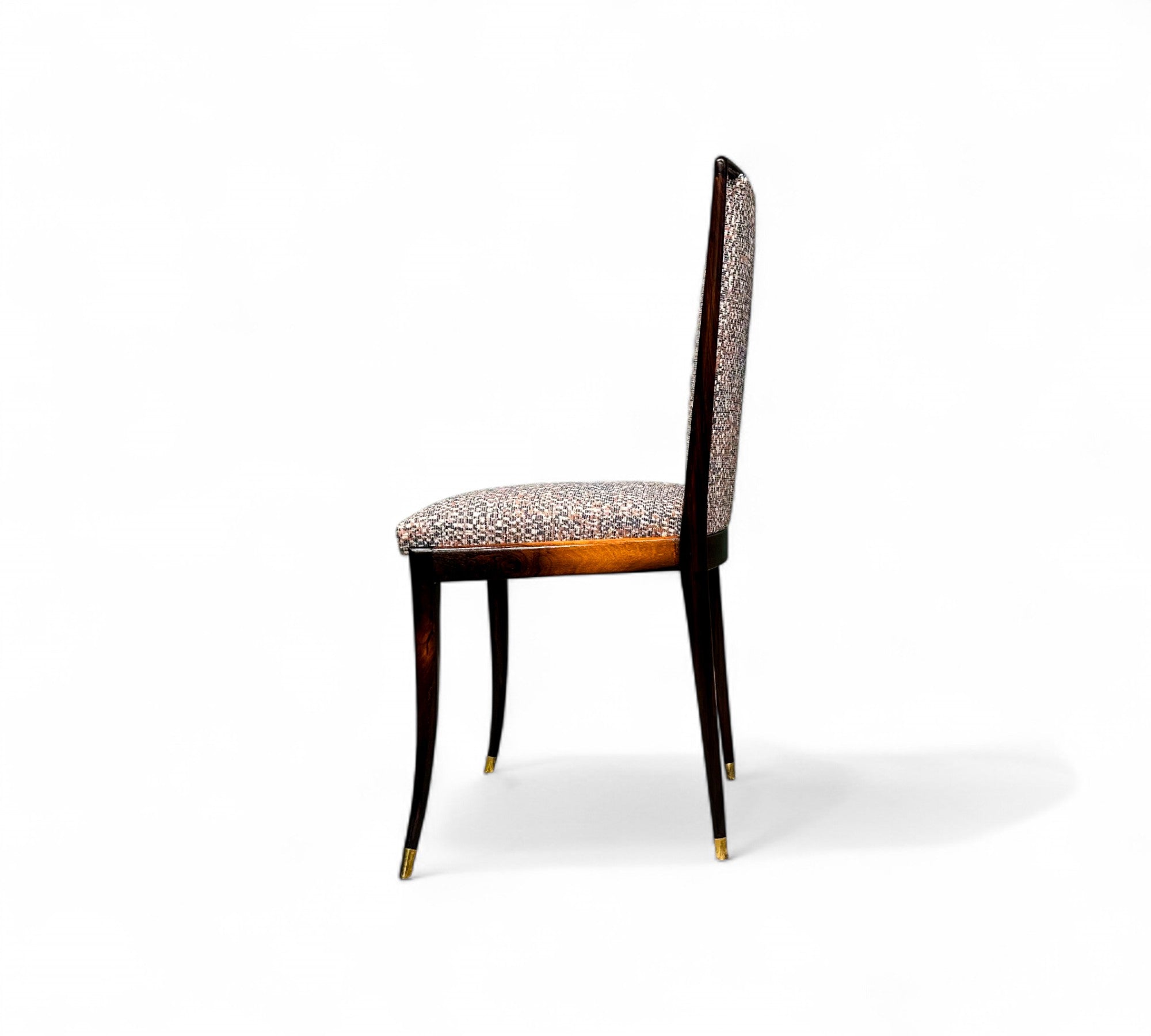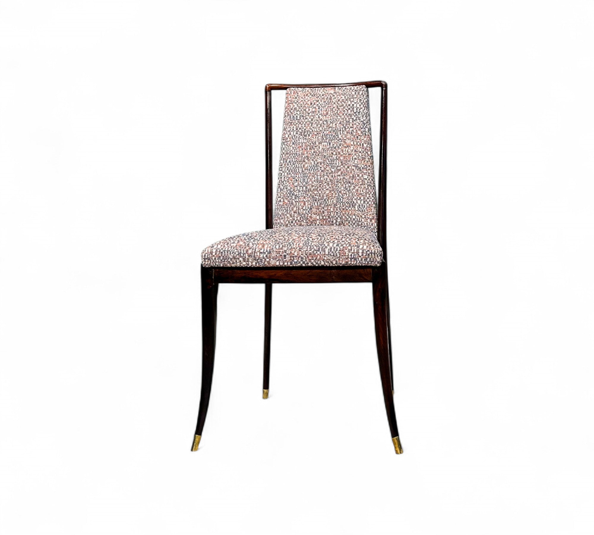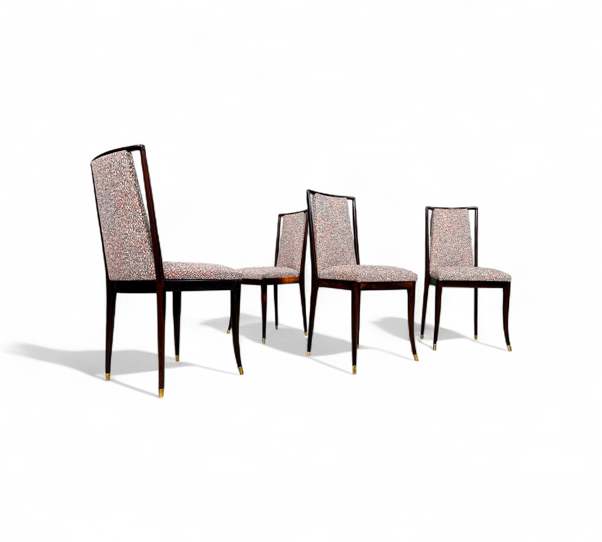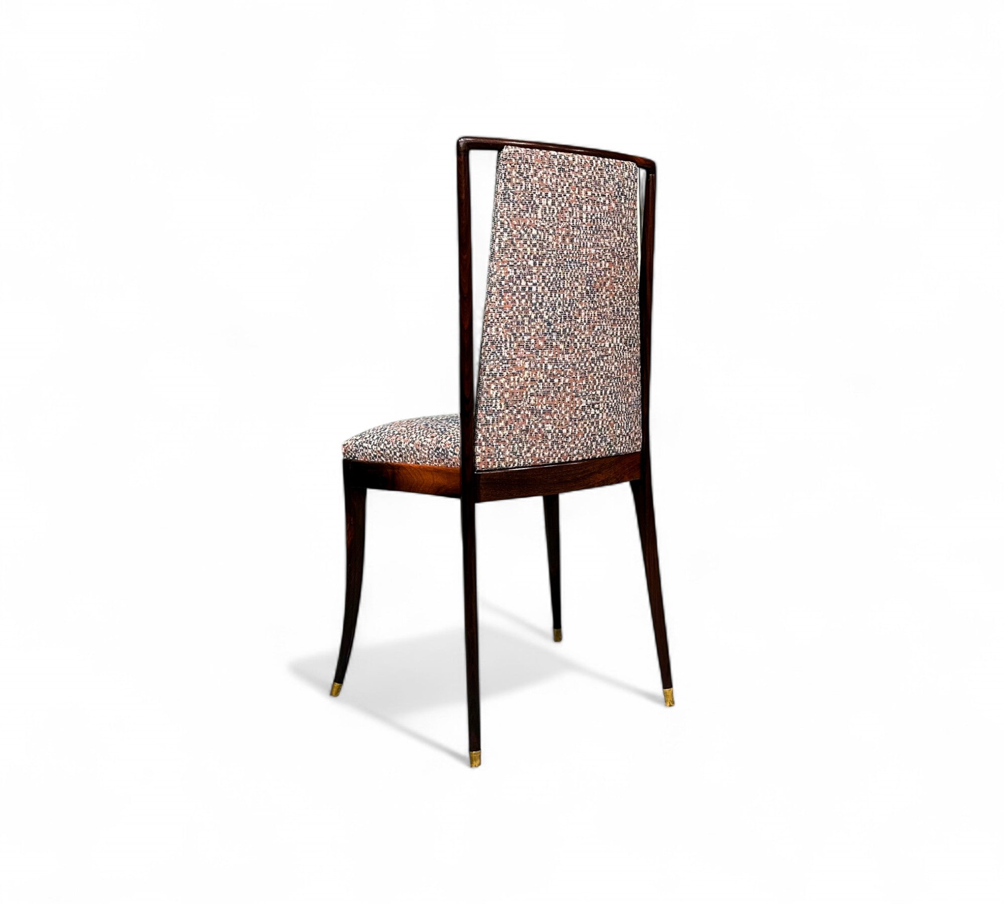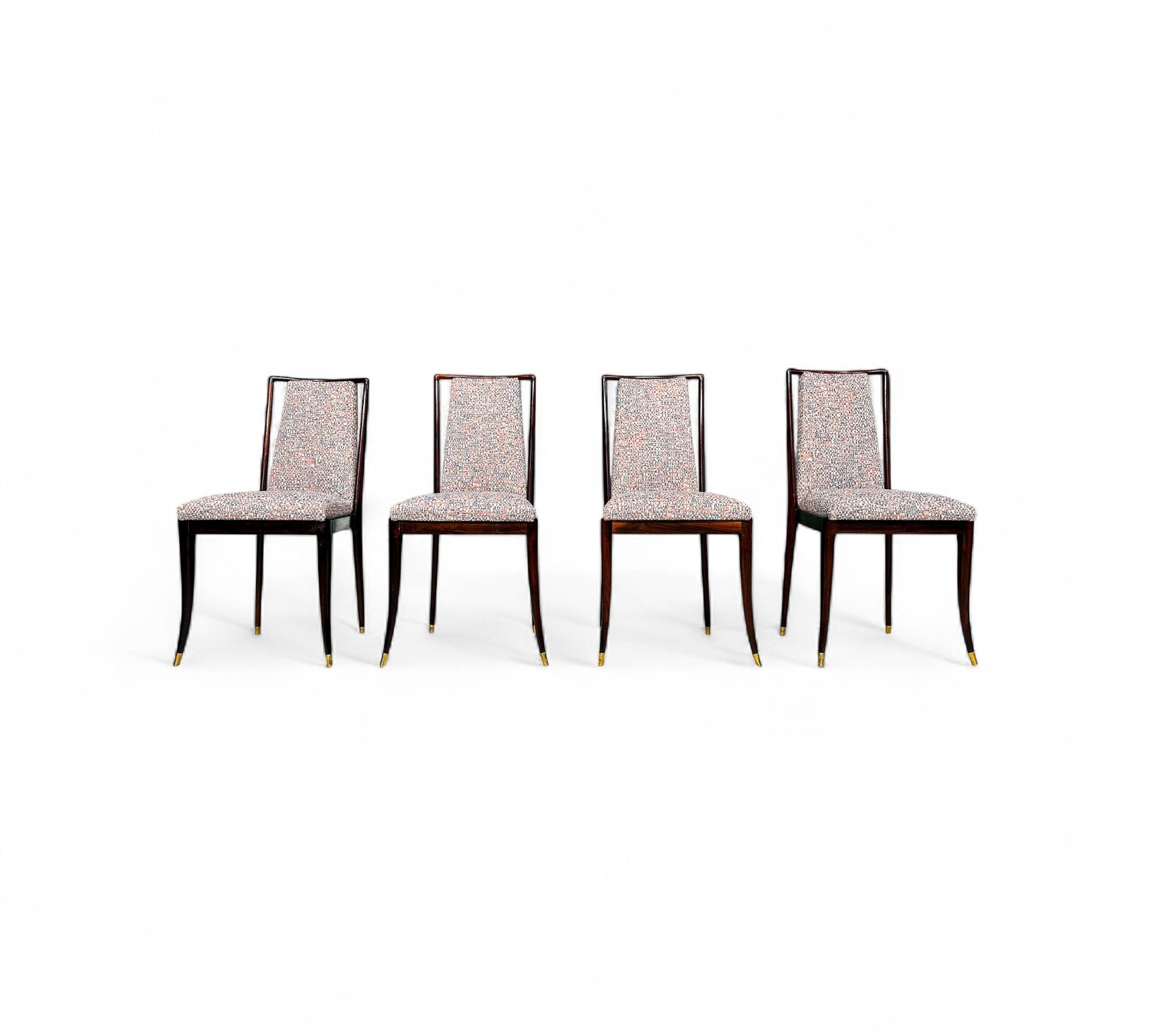 Each chair in this exquisite set of four features a Brazilian rosewood (jacaranda) structure, highlighted by a tall backrest and four elegantly curved toothpick legs. The chairs have been reupholstered in a beautiful multi colored fabric, creating a striking contrast with the rich wood tones. The rosewood has been expertly refinished, and aside from minimal marks of age, the set looks stunning.