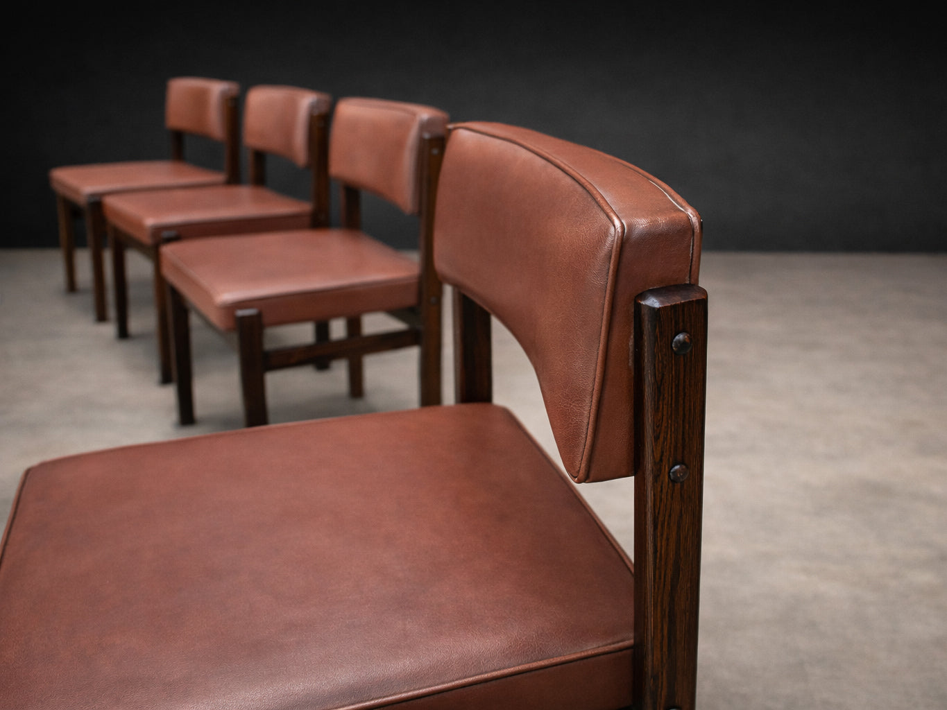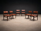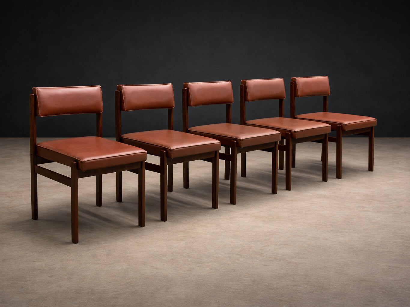 Crafted in solid Brazilian rosewood (jacarandá), the frames display the warm tonal depth and pronounced grain that distinguish Rodrigues’ most sought-after designs. The construction is direct and architectural: rectilinear legs, restrained proportions, and a quietly assertive stance that allows the material itself to carry the visual weight. The chairs retain their original 1950s upholstery, offering an unusually intact reference to the model’s initial presentation and scale.
