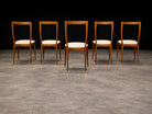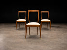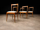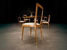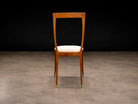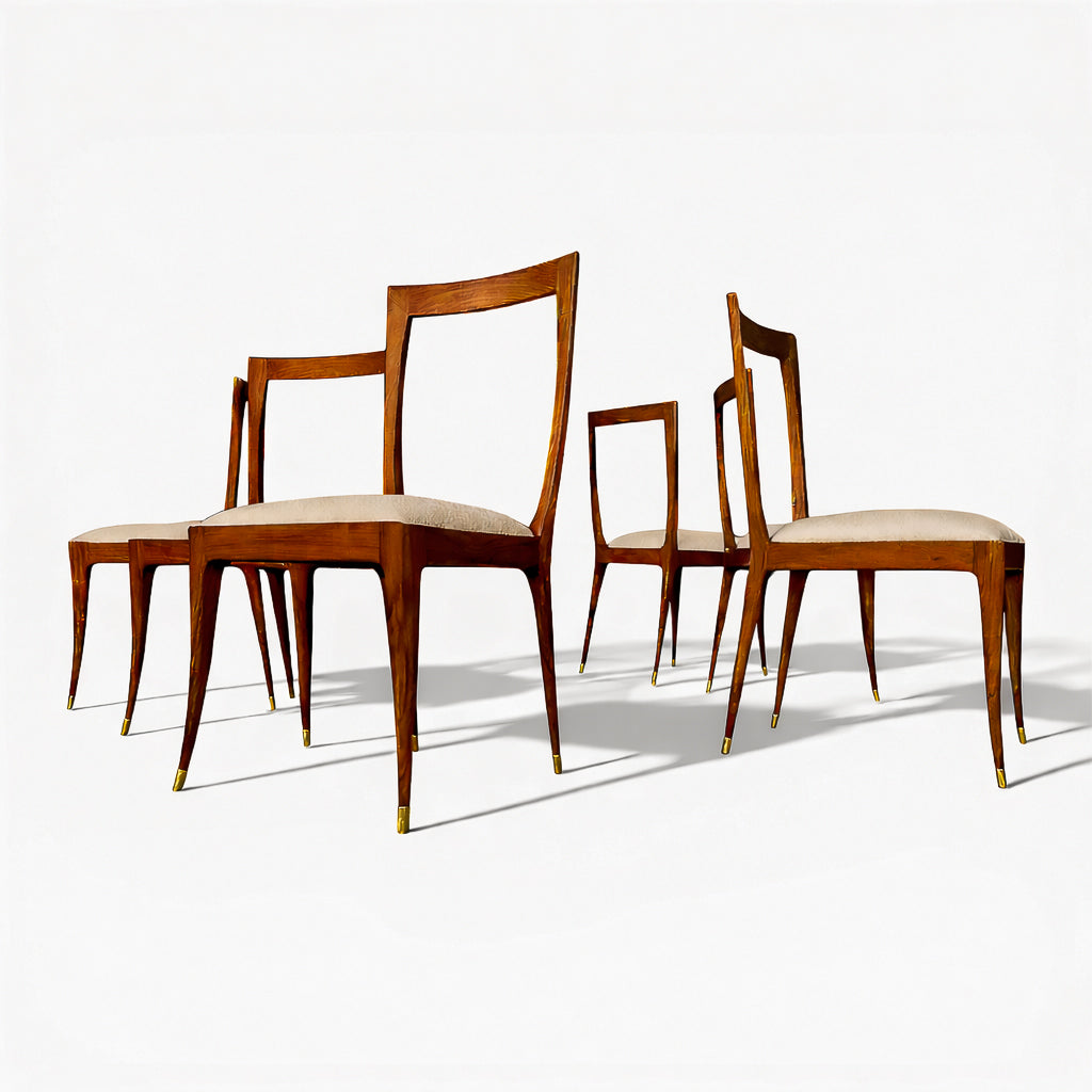 This sculptural set of six dining chairs exemplifies the refined elegance and expressive craftsmanship of Brazilian modernism in the 1950s. Designed by Giuseppe Scapinelli, each chair is distinguished by a gracefully contoured backrest, subtly curved seat, and tapered legs that culminate in a poised, architectural stance.