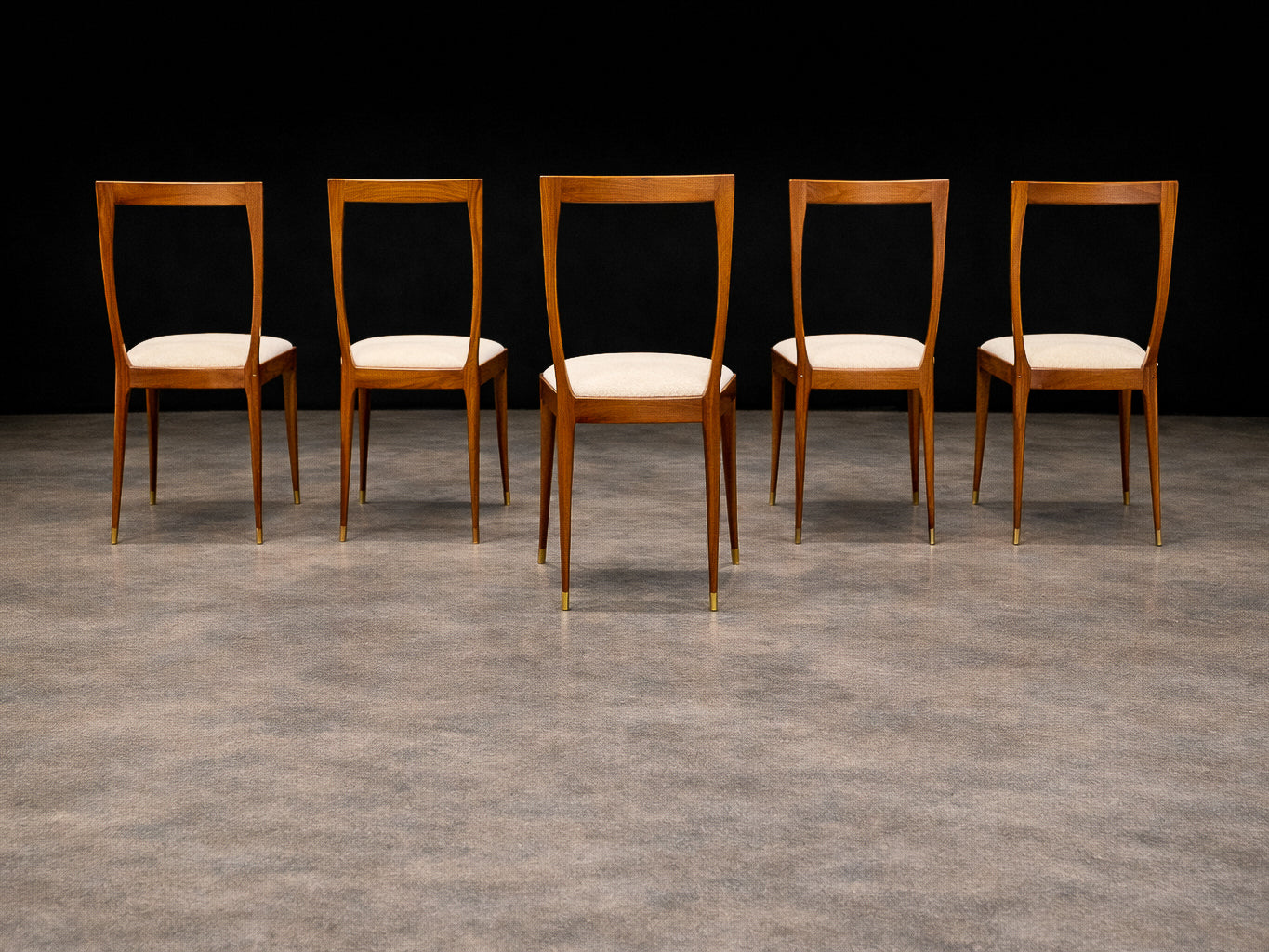 Executed entirely in solid Caviuna wood—a prized Brazilian hardwood frequently favored by Scapinelli for its depth of tone and fine grain—the frames have been meticulously refinished, revealing a rich, warm patina while preserving the integrity of the original construction. The chairs have been newly upholstered in an off-white textured wool bouclé, offering a soft tactile contrast to the sculptural woodwork and reinforcing their timeless, contemporary appeal.