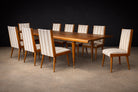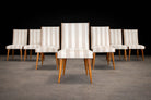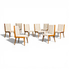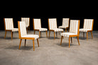 Offered as a complete set of eight chairs (six currently shown, with two under restoration), this grouping presents a compelling opportunity for collectors seeking a cohesive and architecturally expressive dining ensemble.