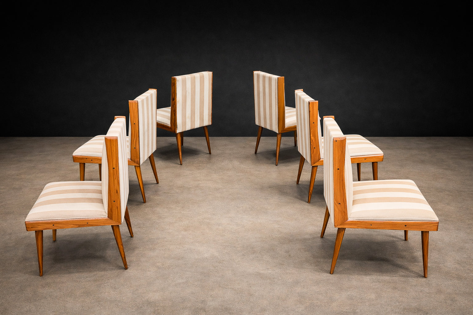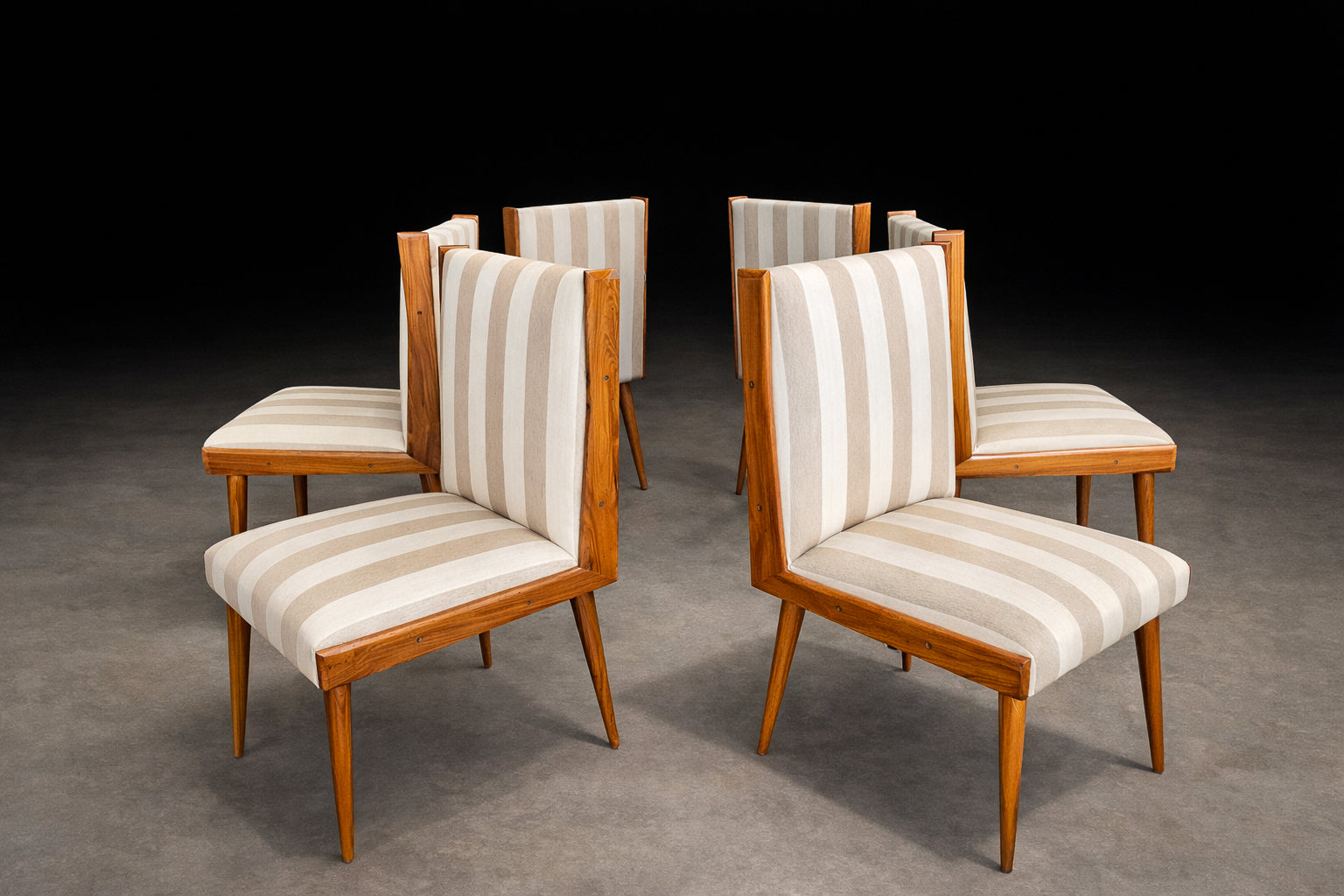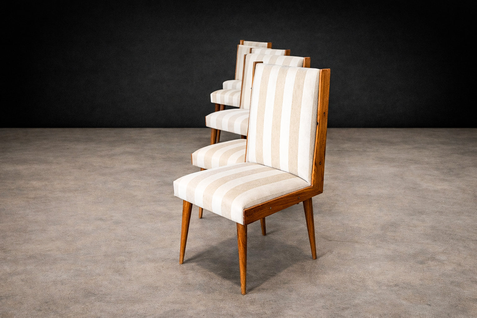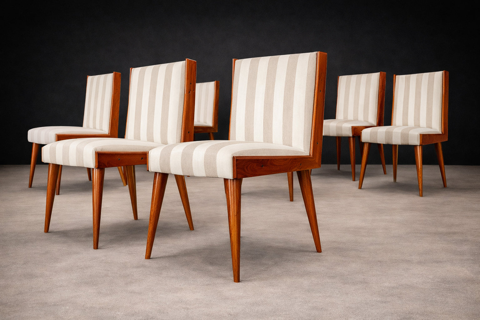 The seats and backrests are currently upholstered in a later striped cotton fabric (not original to the 1950s), presented in OK condition. The vertical striping introduces a subtle architectural rhythm that echoes and enhances the chairs’ elongated silhouette. The upholstery choice adds visual lift without competing with the warmth and depth of the caviúna, allowing the wood grain to remain the primary focal point.