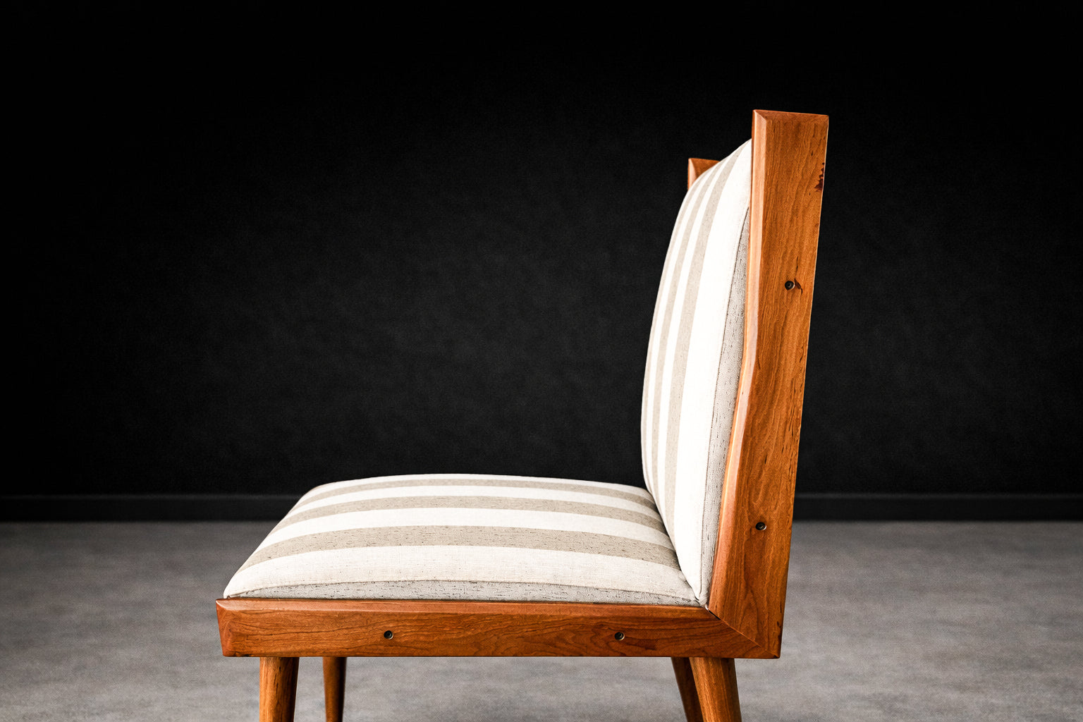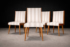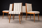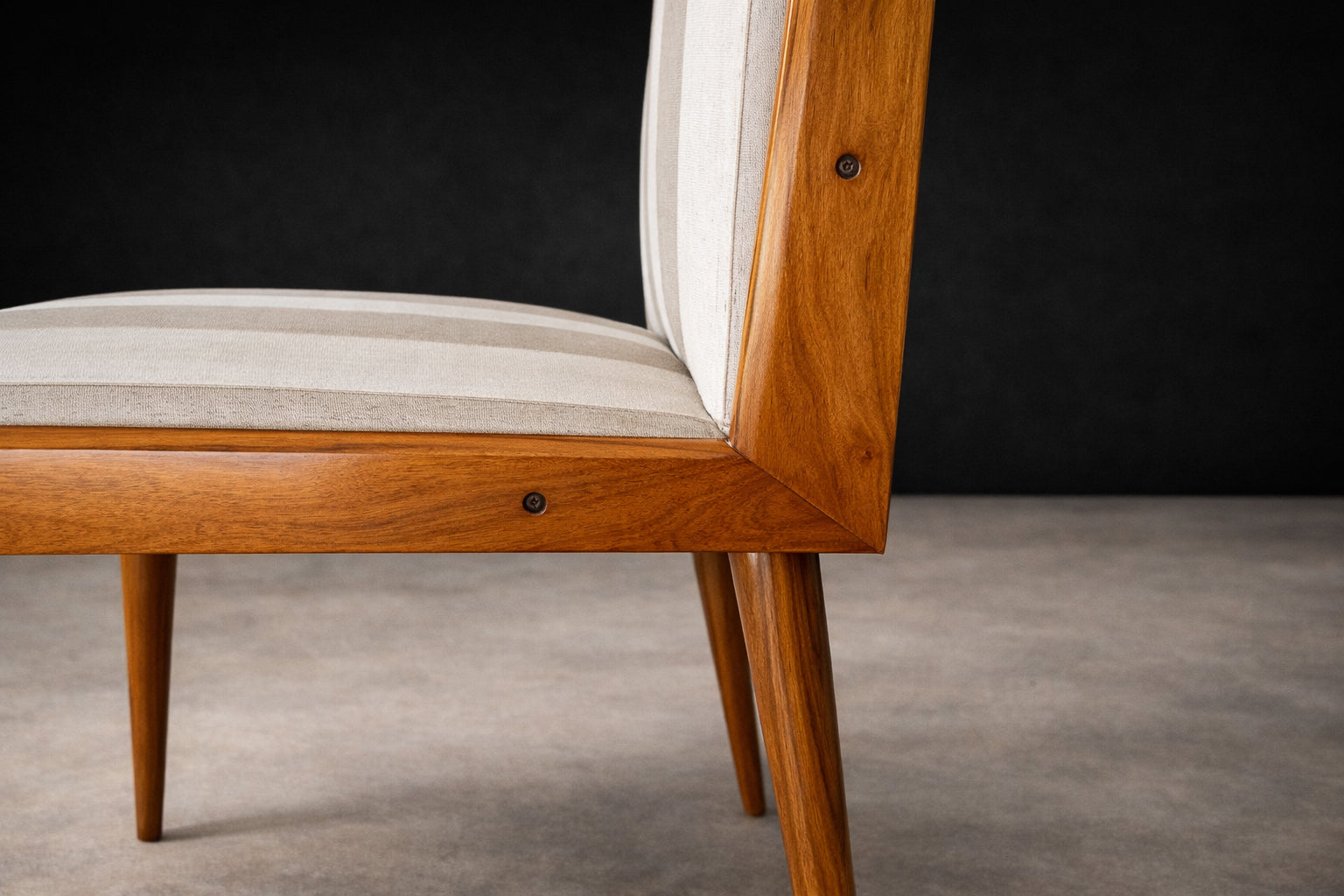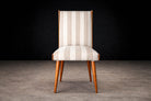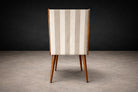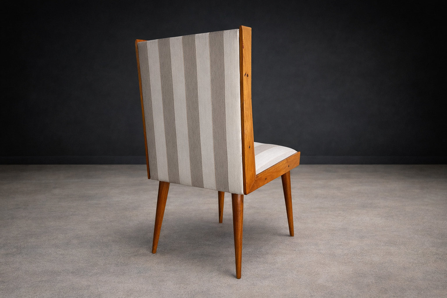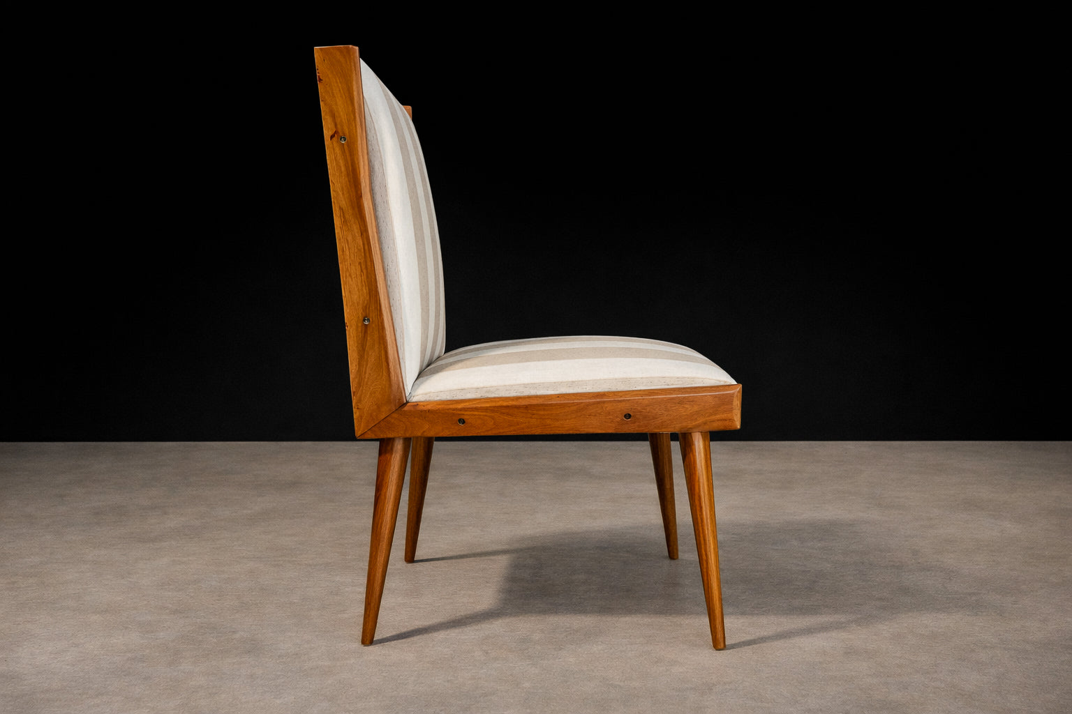 The seats and backrests are currently upholstered in a later striped cotton fabric (not original to the 1950s), presented in OK condition. The vertical striping introduces a subtle architectural rhythm that echoes and enhances the chairs’ elongated silhouette. The upholstery choice adds visual lift without competing with the warmth and depth of the caviúna, allowing the wood grain to remain the primary focal point.