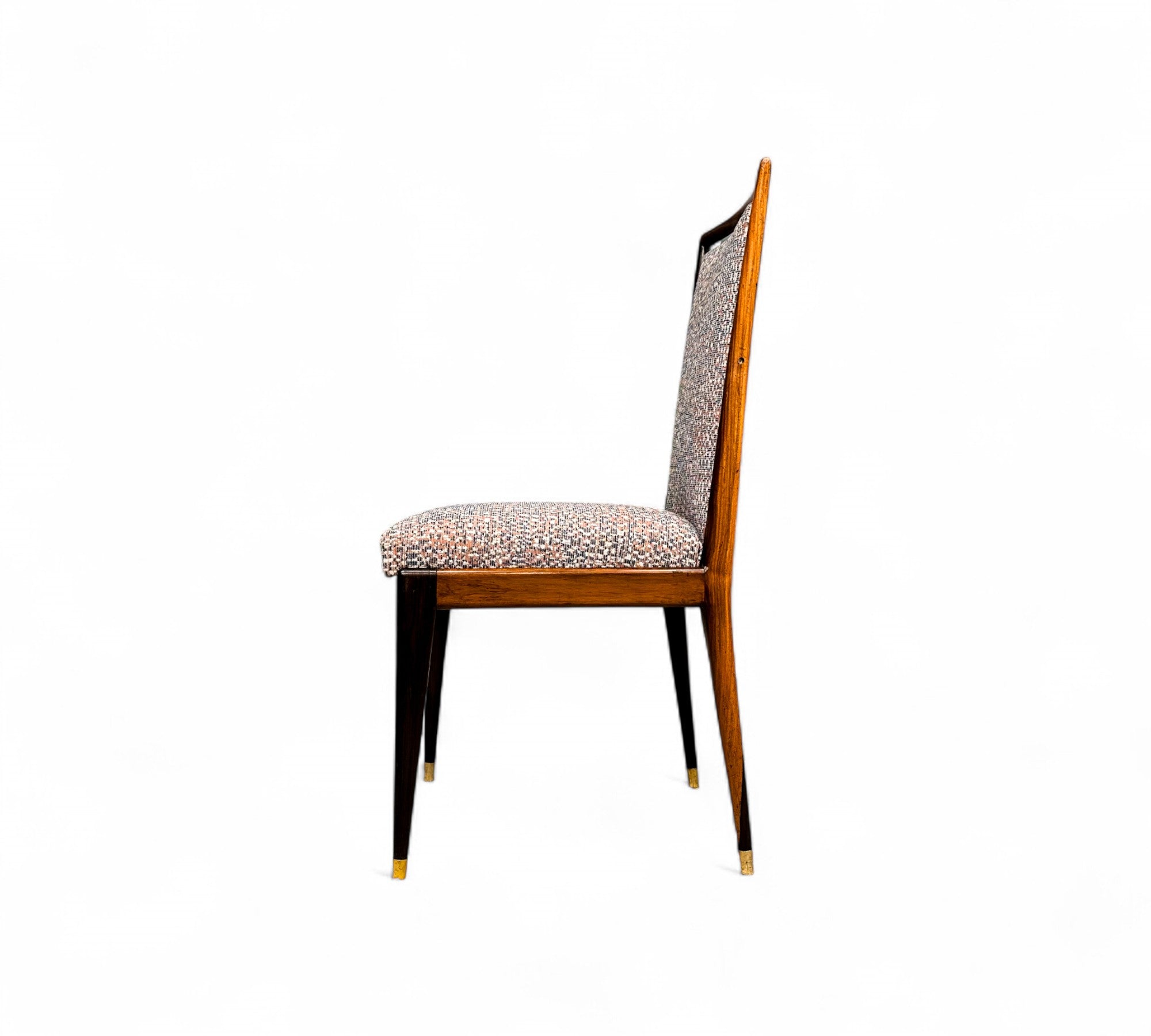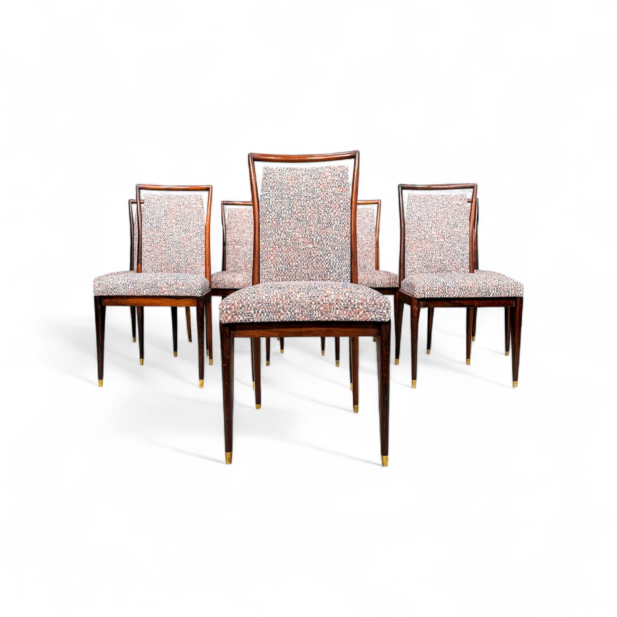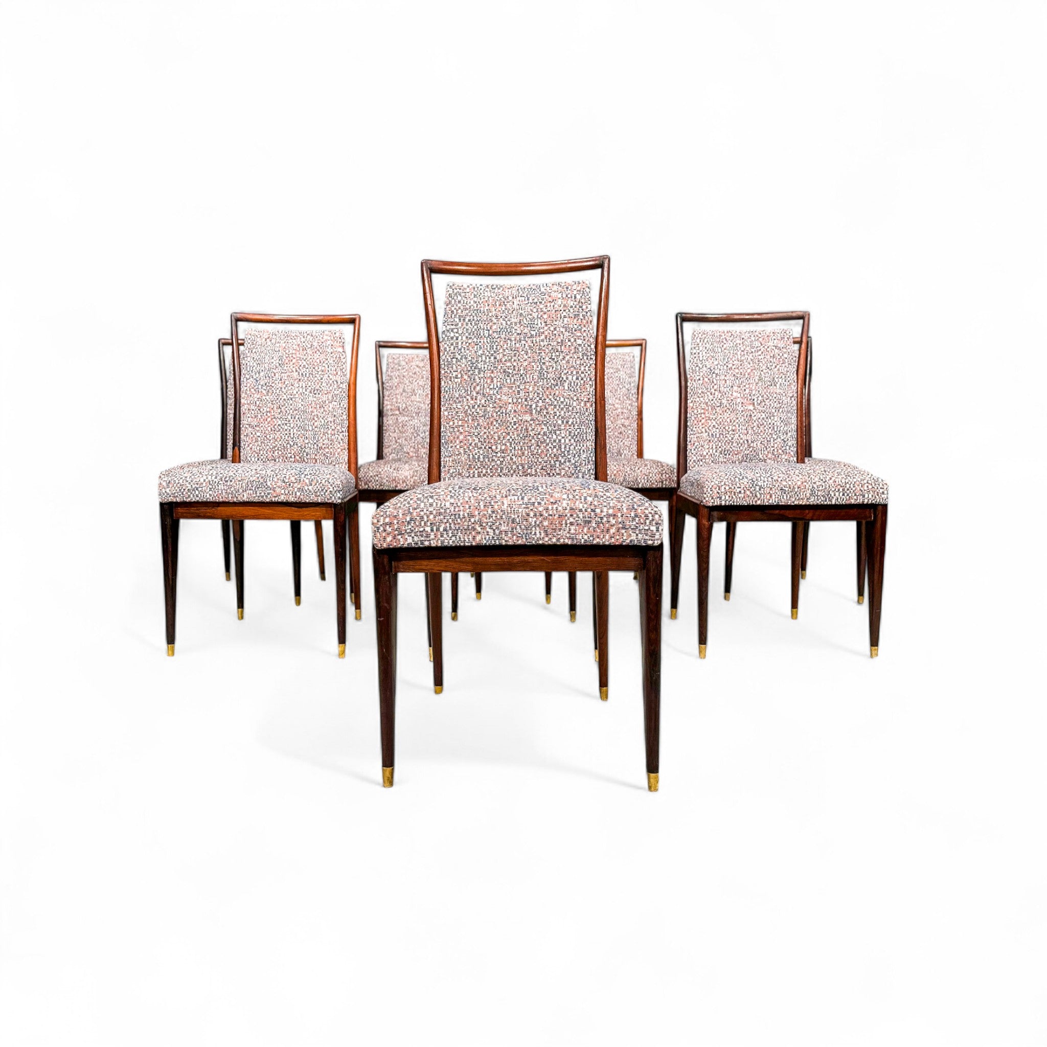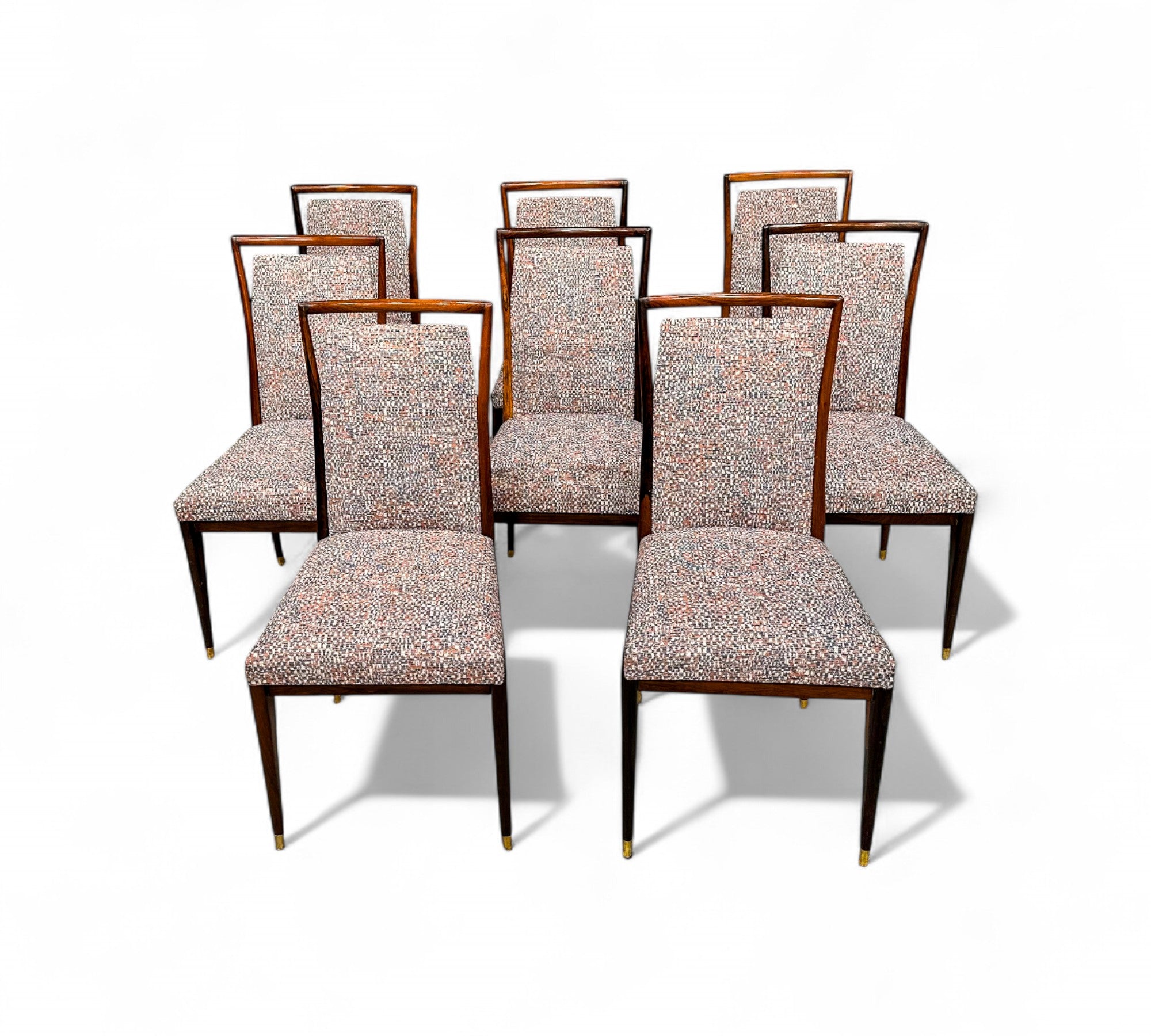 Presenting a sculptural and elegant set of eight dining chairs, each featuring a tall backrest and tapered legs capped with brass. The seats and backs have been newly reupholstered in a contemporary patterned fabric, blending texture and subtle color for a refined modern look. The rosewood frames have been expertly refinished and remain in excellent condition. Originally from a private residence in Brasília, these chairs exemplify sophistication and timeless Brazilian design. This set has been recently reupholstered in the multicolored fabric that is visible in the listing.
