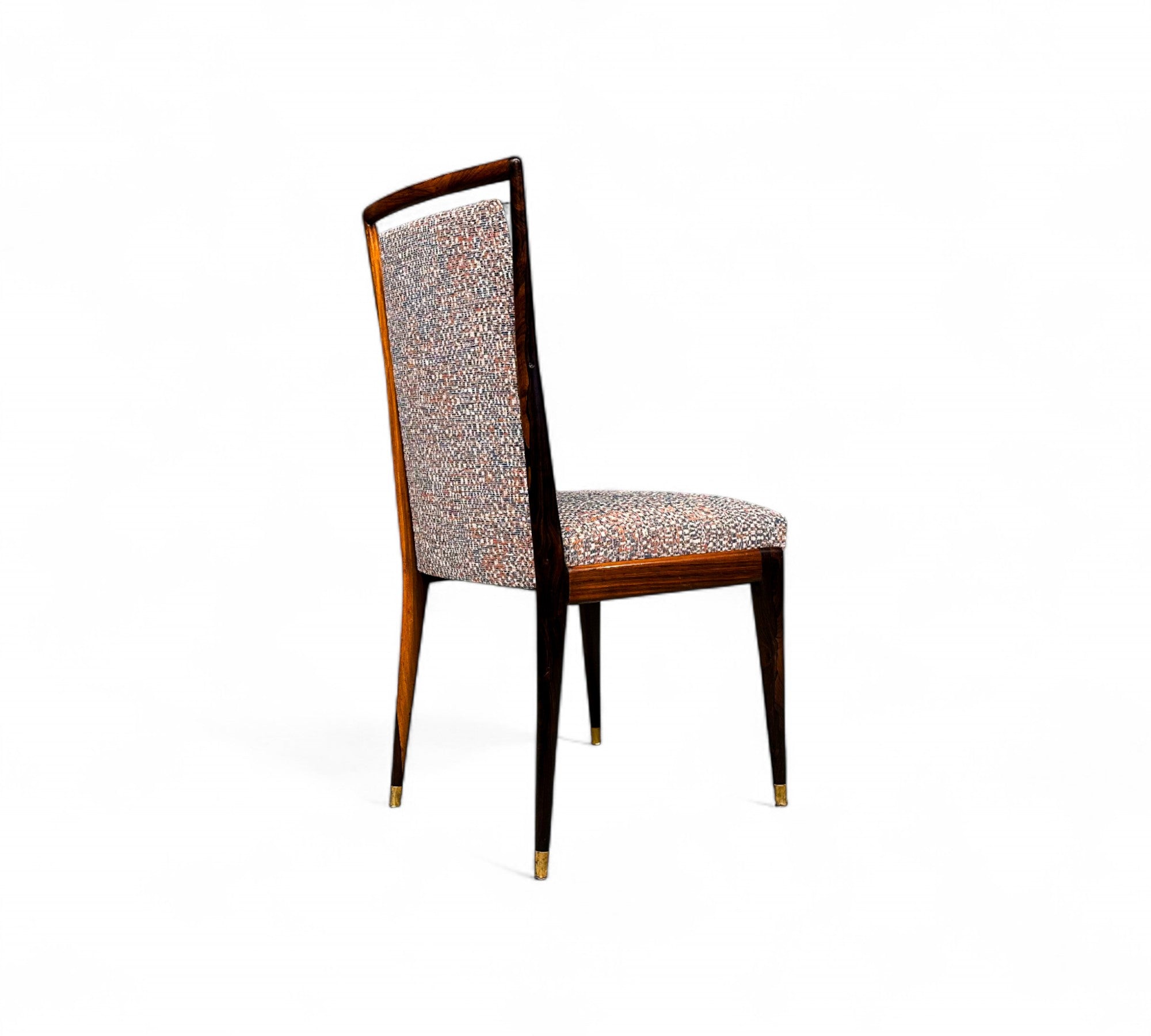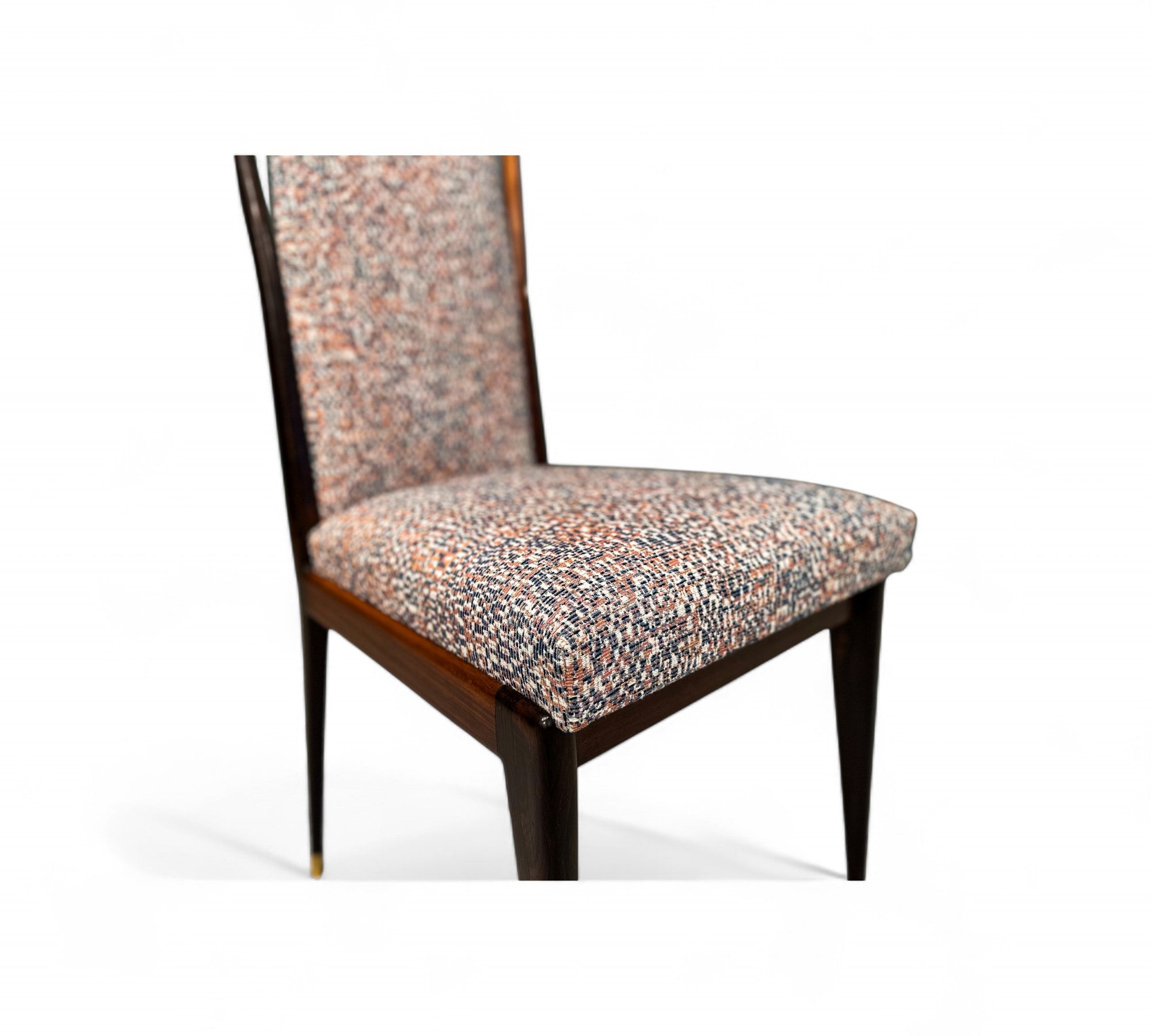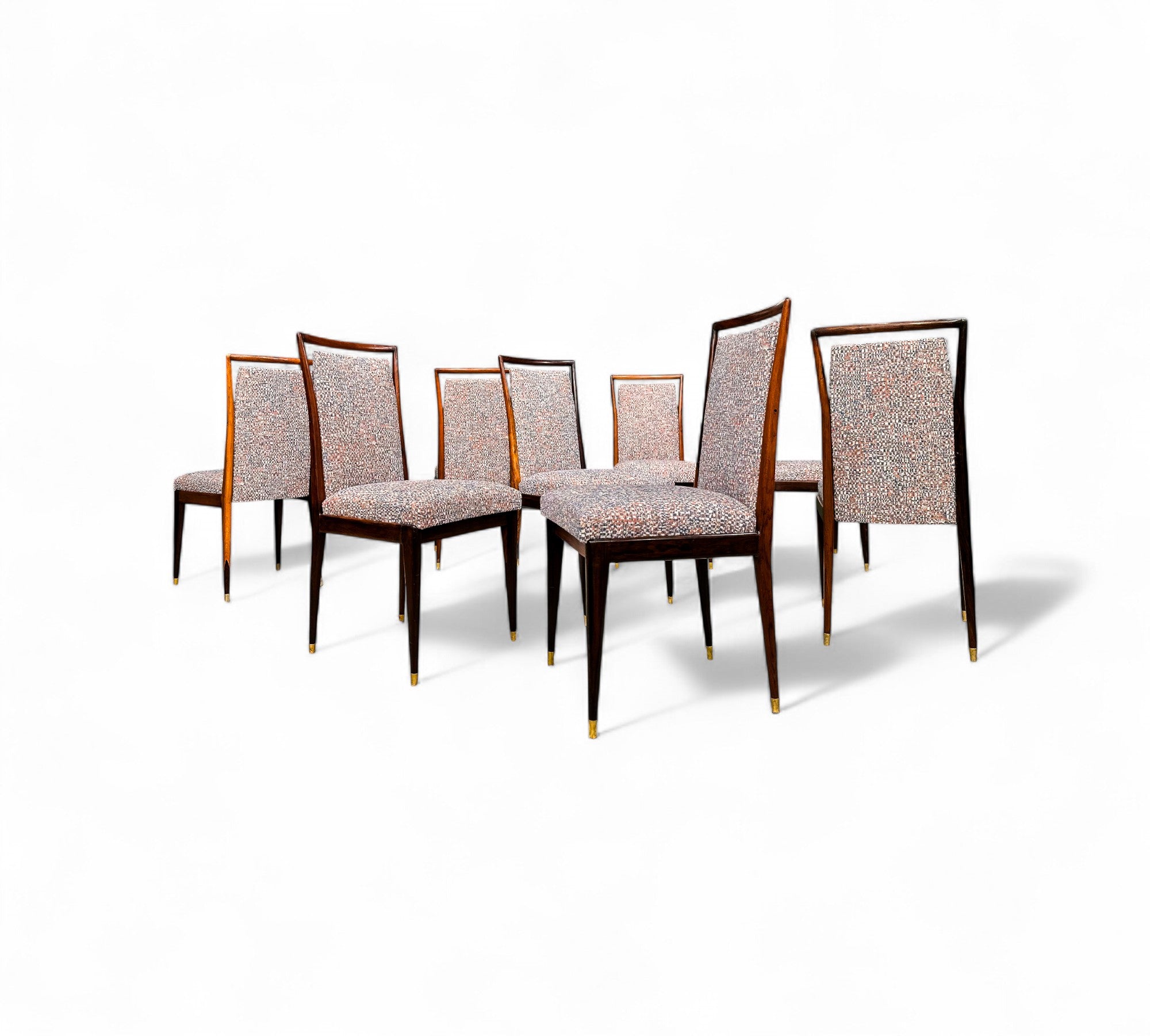 Presenting a sculptural and elegant set of eight dining chairs, each featuring a tall backrest and tapered legs capped with brass. The seats and backs have been newly reupholstered in a contemporary patterned fabric, blending texture and subtle color for a refined modern look. The rosewood frames have been expertly refinished and remain in excellent condition. Originally from a private residence in Brasília, these chairs exemplify sophistication and timeless Brazilian design. This set has been recently reupholstered in the multicolored fabric that is visible in the listing.