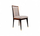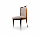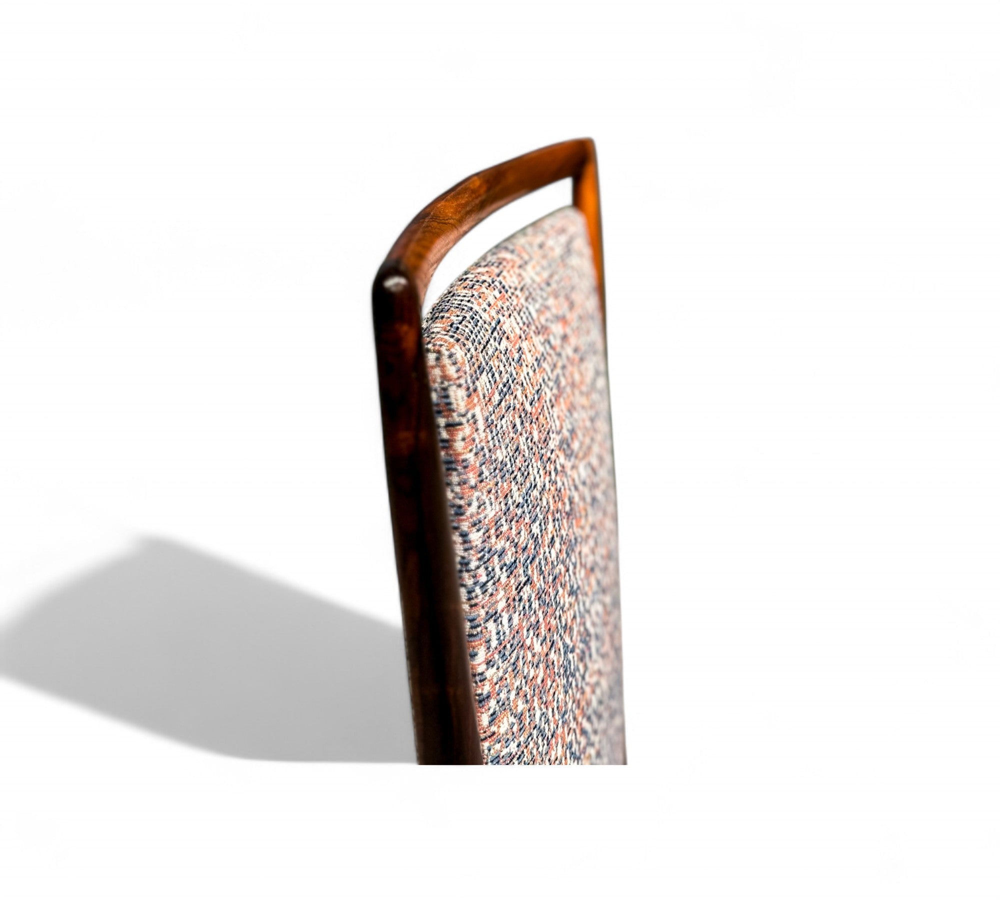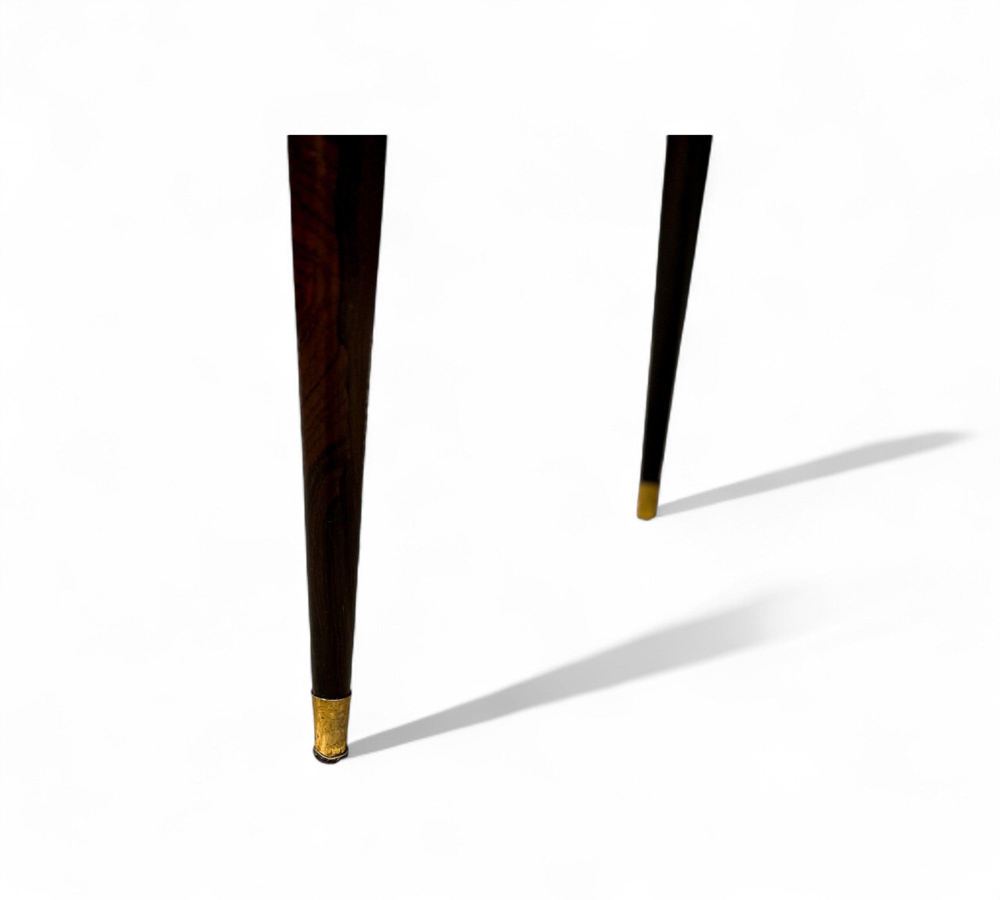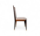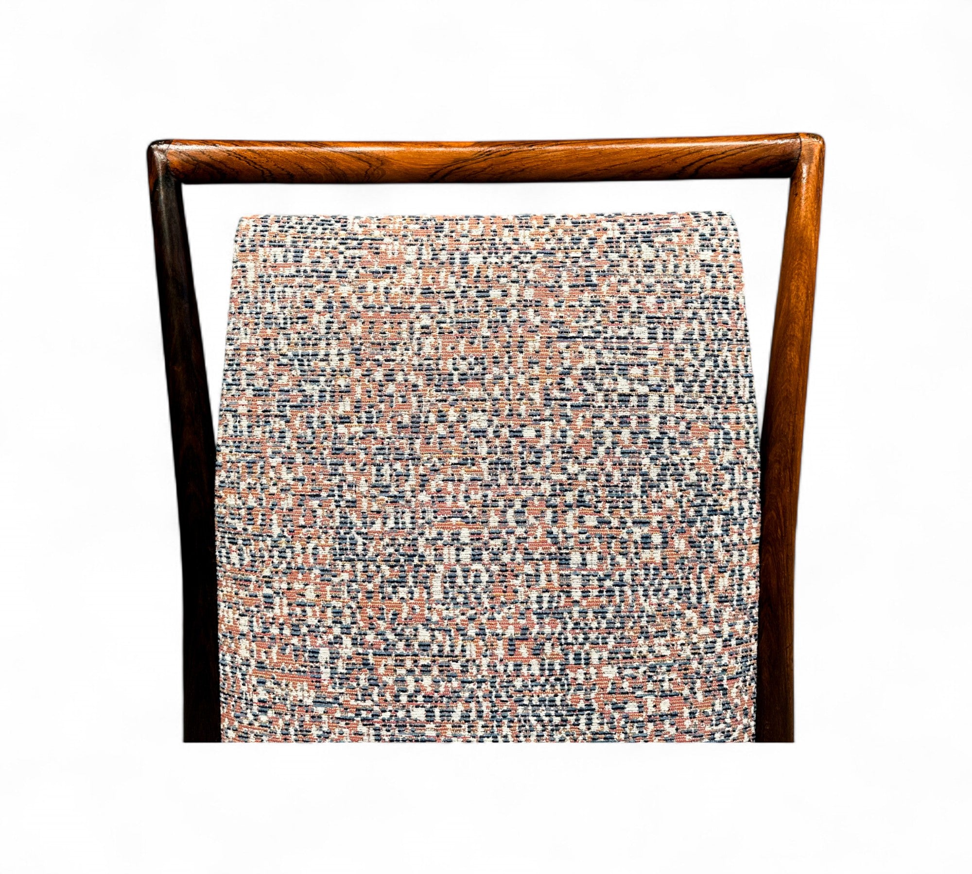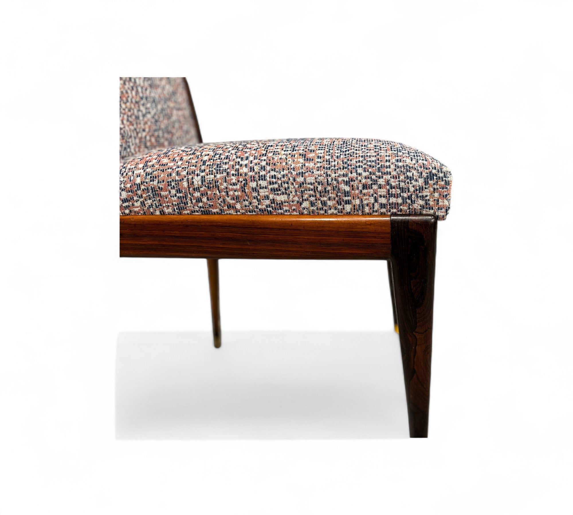 Presenting a sculptural and elegant set of eight dining chairs, each featuring a tall backrest and tapered legs capped with brass. The seats and backs have been newly reupholstered in a contemporary patterned fabric, blending texture and subtle color for a refined modern look. The rosewood frames have been expertly refinished and remain in excellent condition. Originally from a private residence in Brasília, these chairs exemplify sophistication and timeless Brazilian design. This set has been recently reupholstered in the multicolored fabric that is visible in the listing.