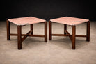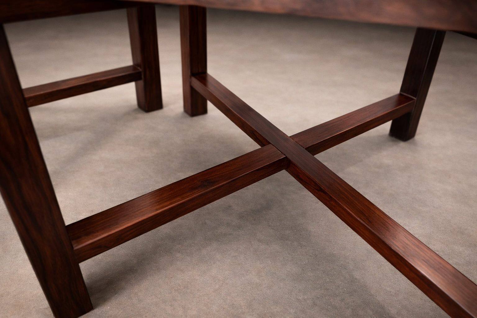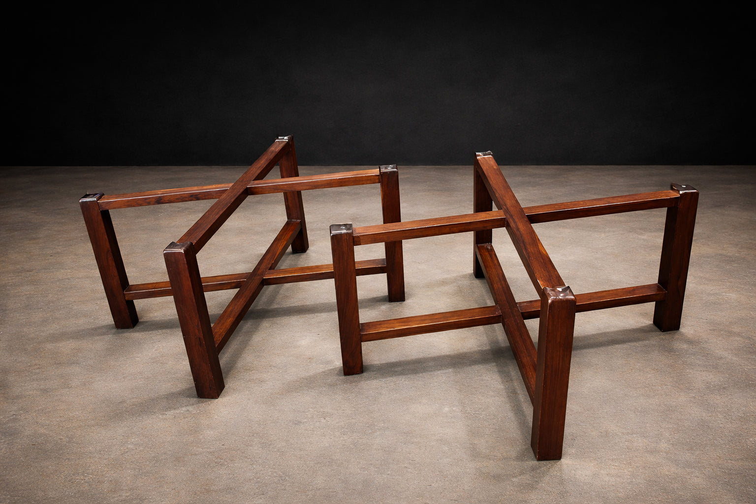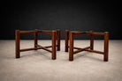 A compelling study in material contrast and architectural clarity, this pair of Brazilian side tables from the 1960s embodies the structural confidence that defined the country’s most sophisticated modern interiors. Crafted in richly grained solid rosewood (Jacarandá), the bases feature a strong X-form stretcher and four substantial legs, creating a grounded yet refined silhouette.