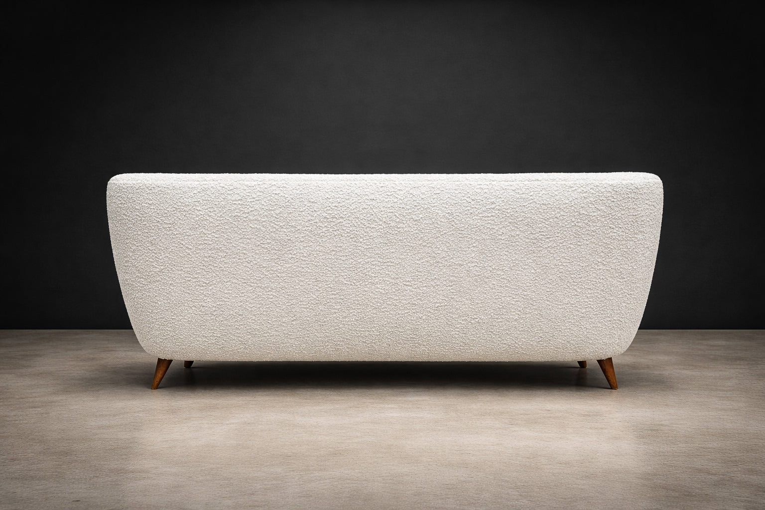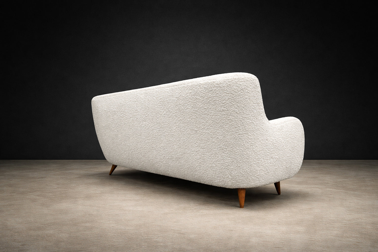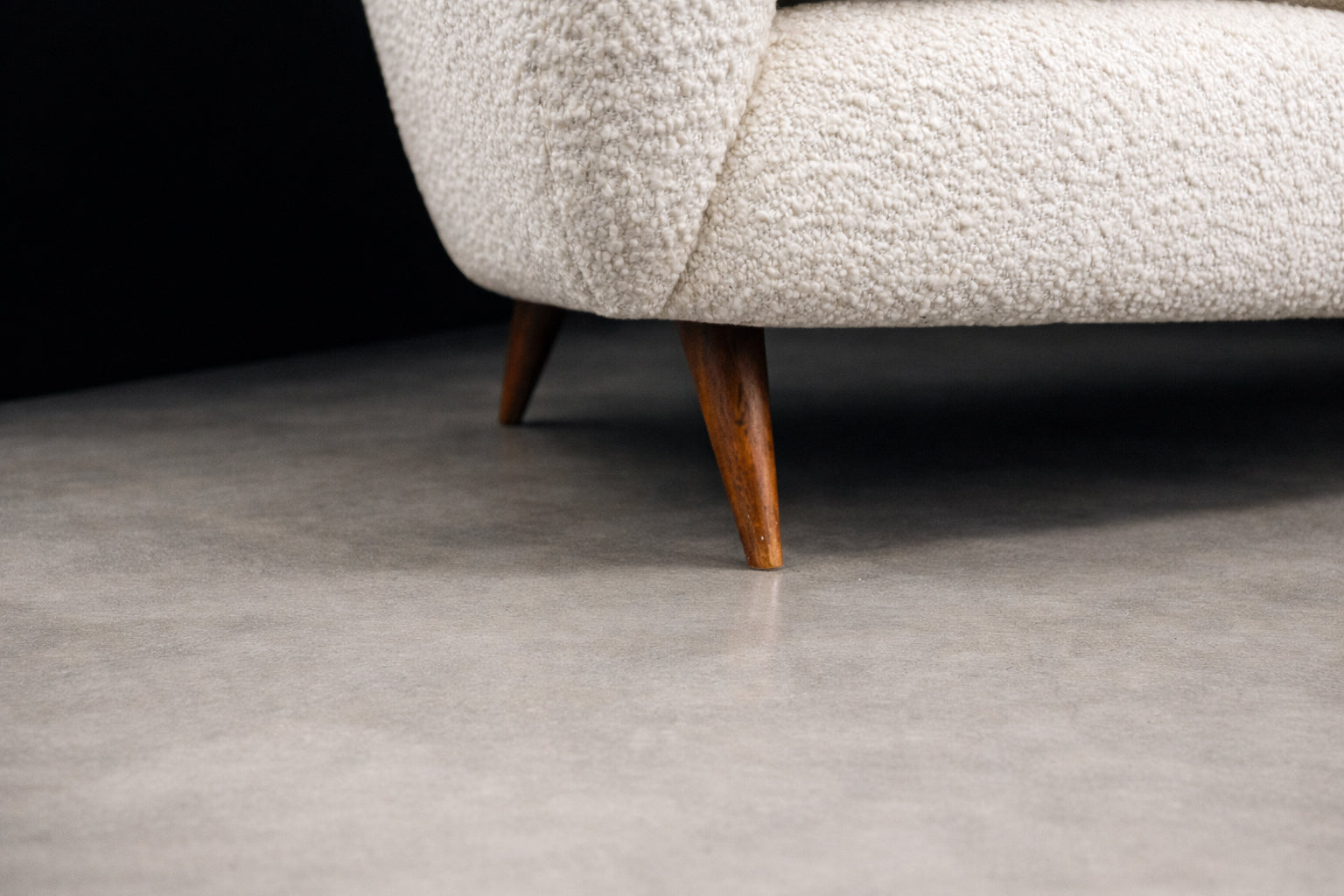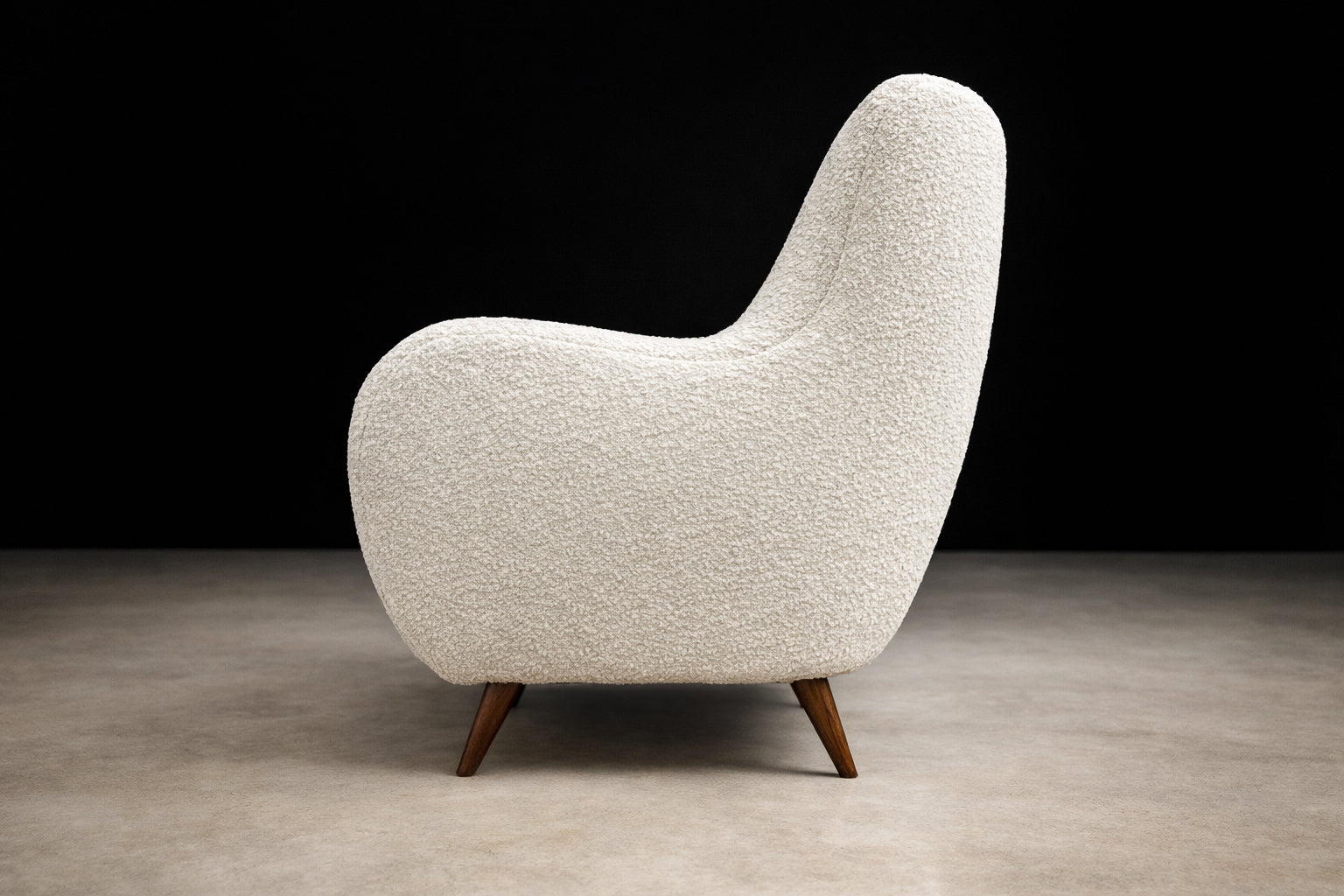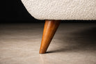 The sofa has been reupholstered in off-white bouclé, a richly textured fabric characterized by its looped surface and tactile depth. The bouclé introduces warmth and softness, creating a compelling contrast with the clean architectural lines of the wooden structure. Its neutral tone allows the form and craftsmanship of the sofa to take visual precedence.