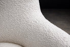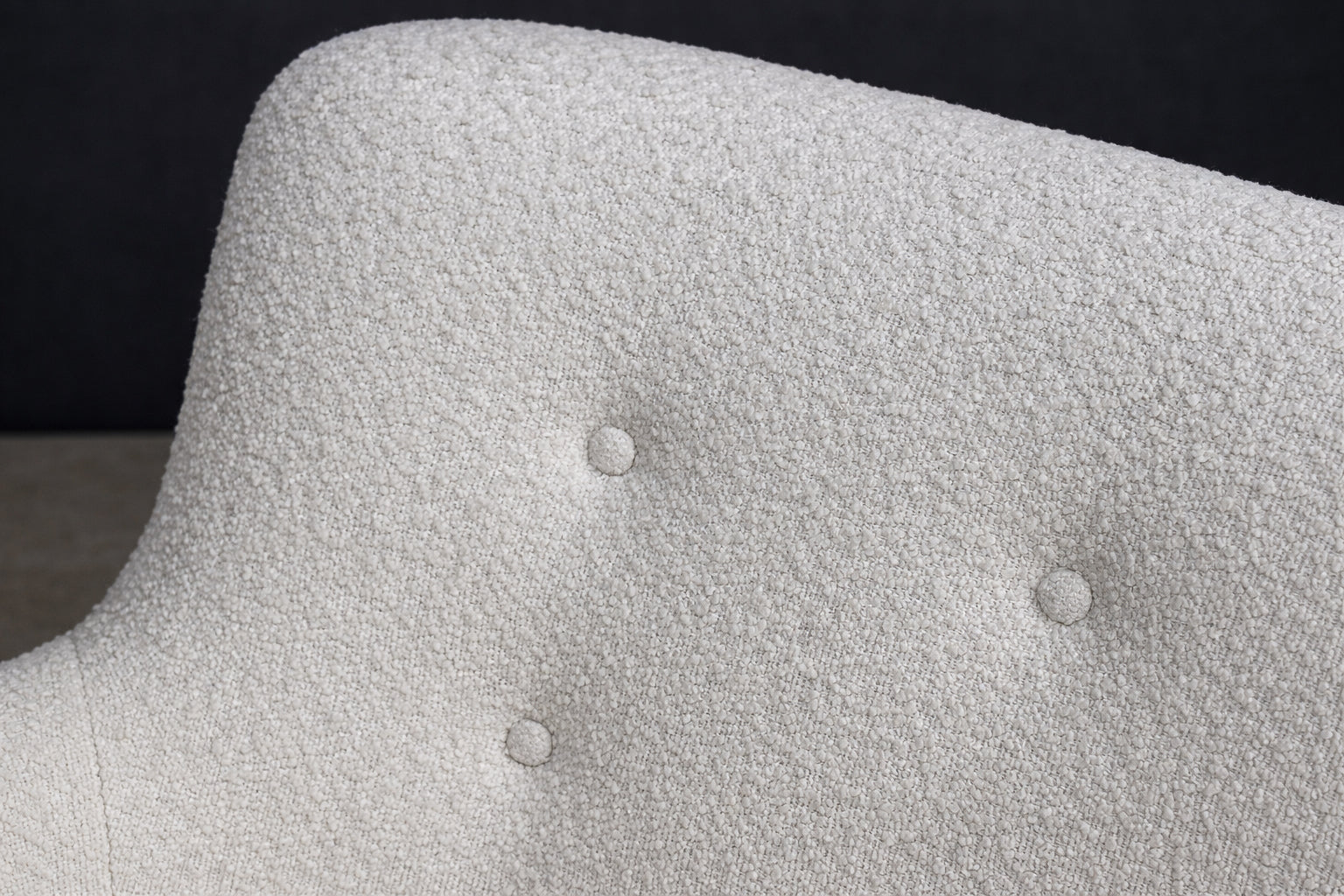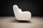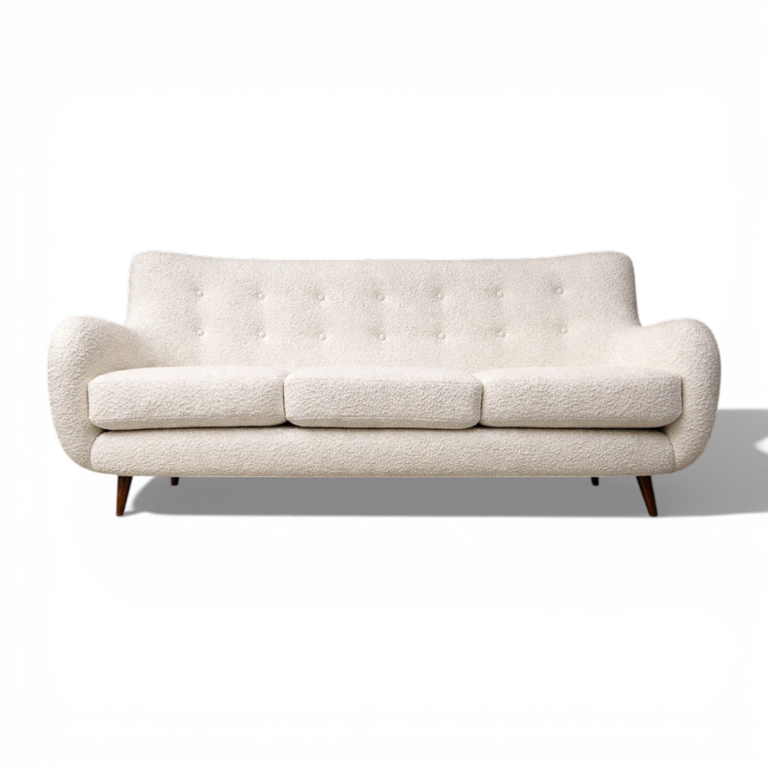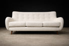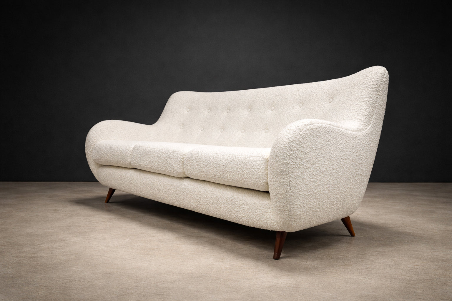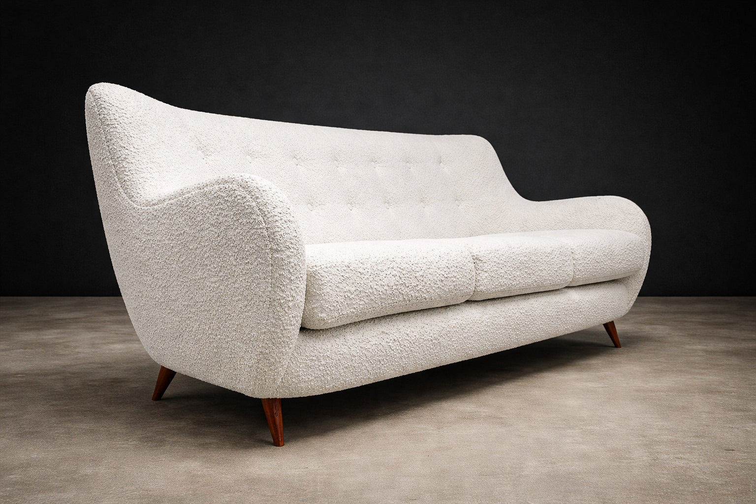 The sofa has been reupholstered in off-white bouclé, a richly textured fabric characterized by its looped surface and tactile depth. The bouclé introduces warmth and softness, creating a compelling contrast with the clean architectural lines of the wooden structure. Its neutral tone allows the form and craftsmanship of the sofa to take visual precedence.