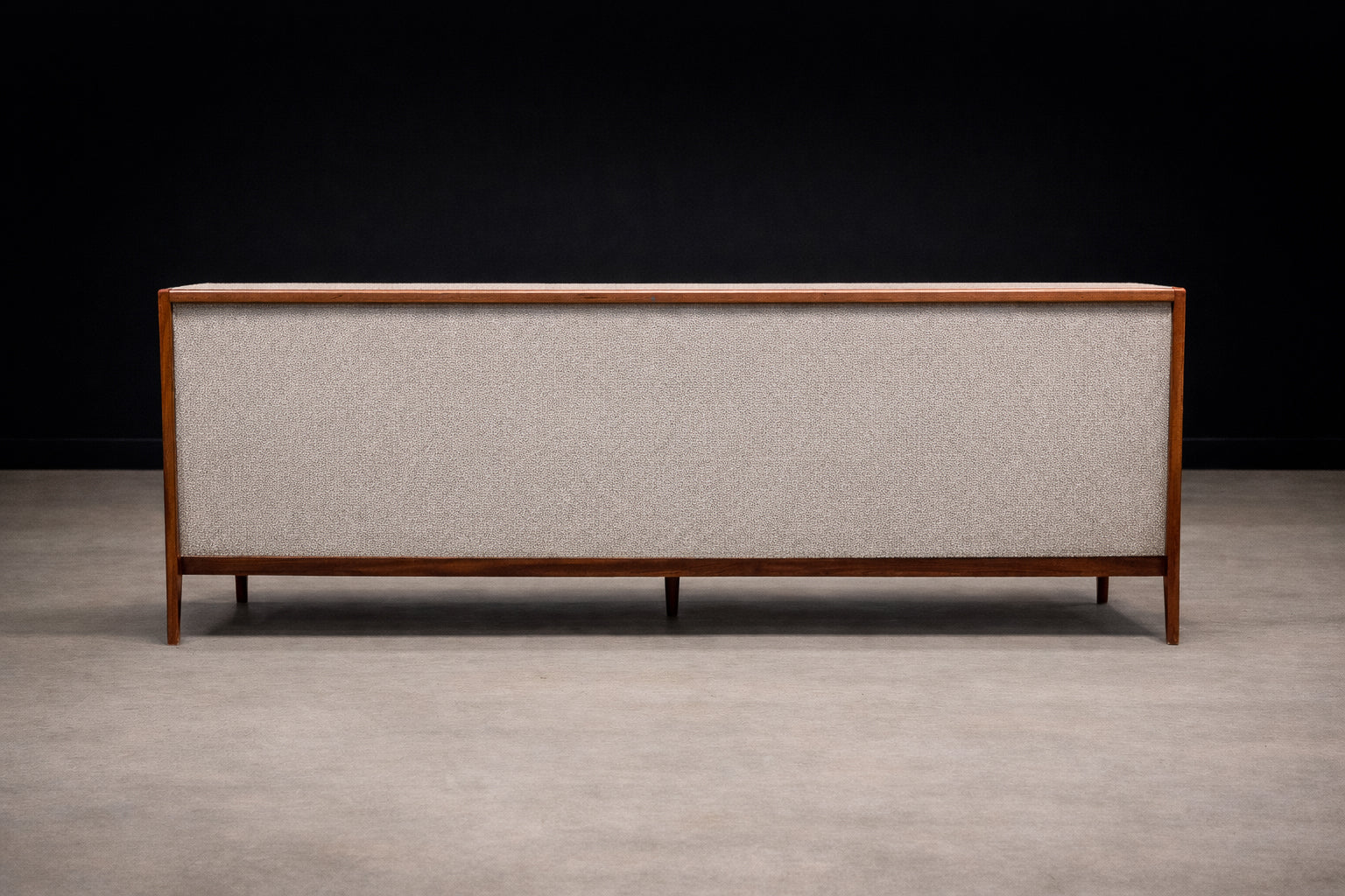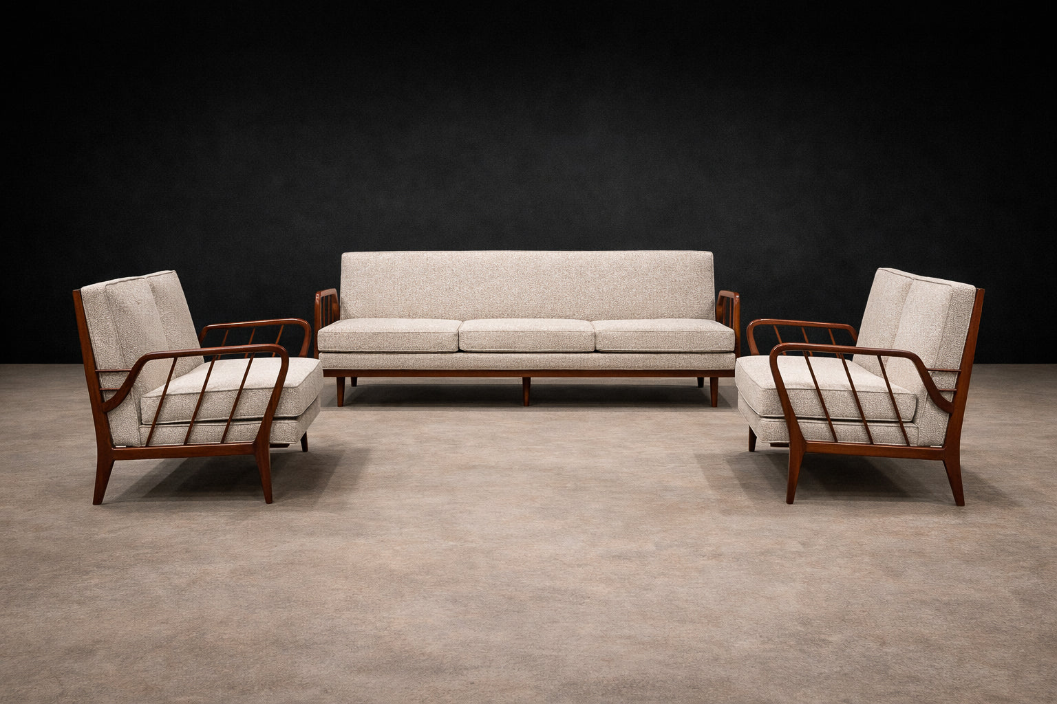 A sculptural expression of architectural modernism, this exceptional sofa by Rino Levi distills the disciplined clarity of Brazilian mid-century design into a refined domestic form. Known foremost as one of Brazil’s most important modernist architects, Levi brought a distinctly structural intelligence to his furniture—where proportion, joinery, and line are inseparable from function.