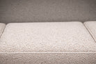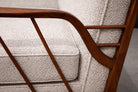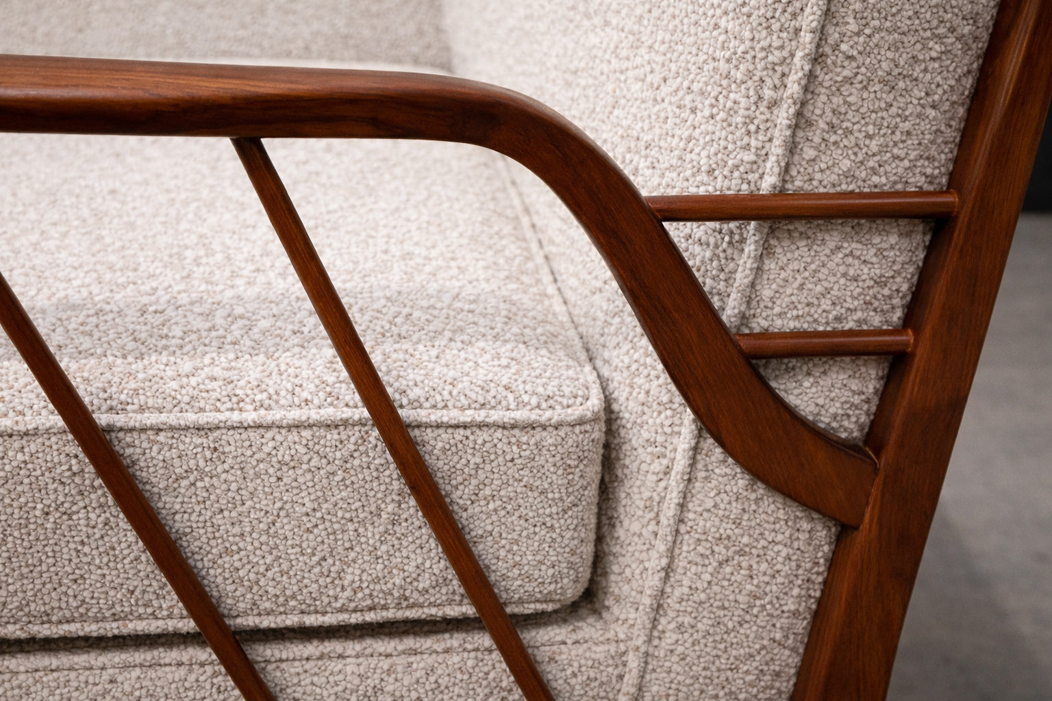 The seat and back are upholstered in a warm oatmeal bouclé with subtle stone undertones, offering a refined, tactile counterpoint to the warmth of the hardwood frame. Three removable cushions rest within the architectural structure, preserving visual lightness while enhancing comfort and versatility. The nuanced, mineral softness of the bouclé heightens the sculptural presence of the wood, creating a balanced dialogue between texture and structure.