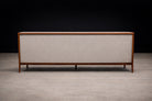 Executed in richly toned hardwood, the frame reveals masterful craftsmanship and architectural precision. The armrests are defined by subtly tilted, linear supports that create a rhythmic vertical cadence—an unmistakable gesture that feels both graphic and organic. These vertical elements connect seamlessly into horizontal rails, reinforcing the backrest while articulating the sofa’s structural logic with quiet confidence.