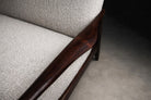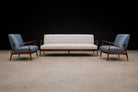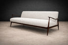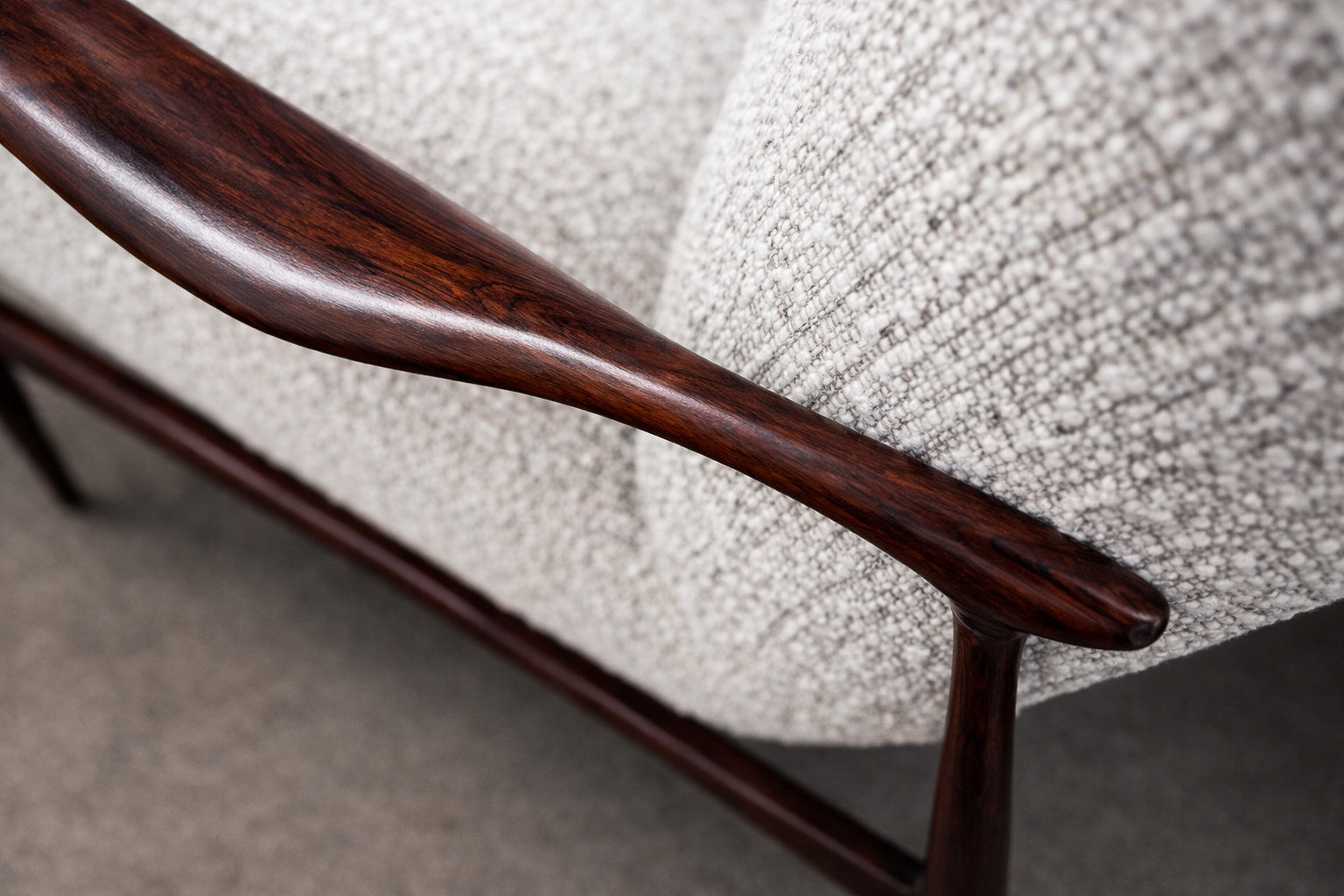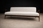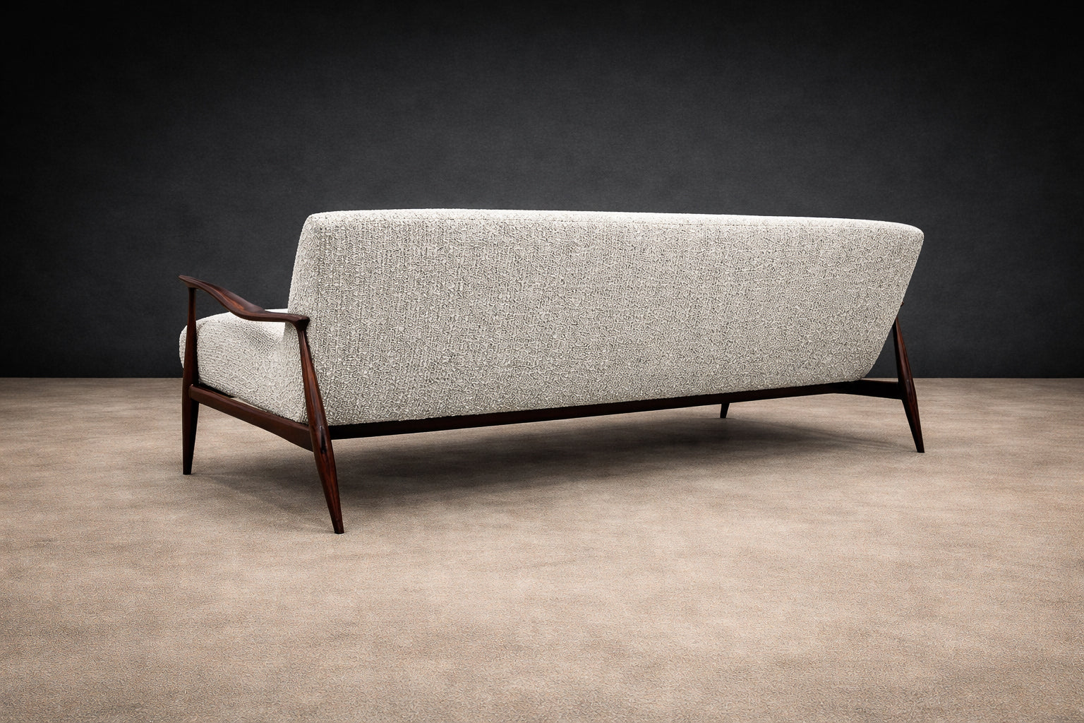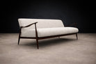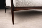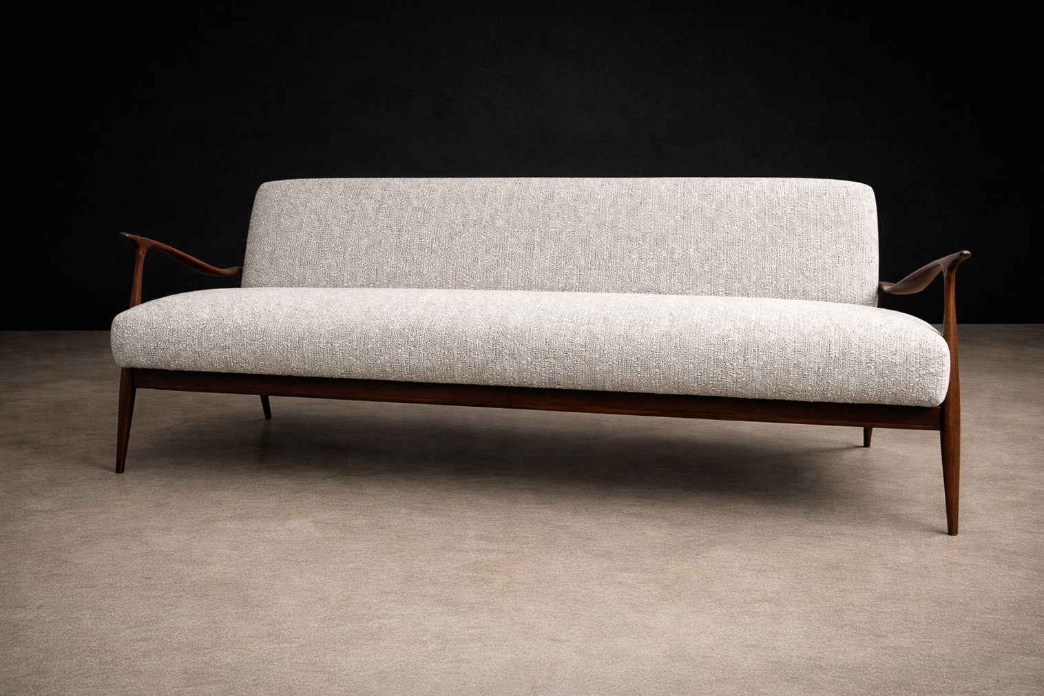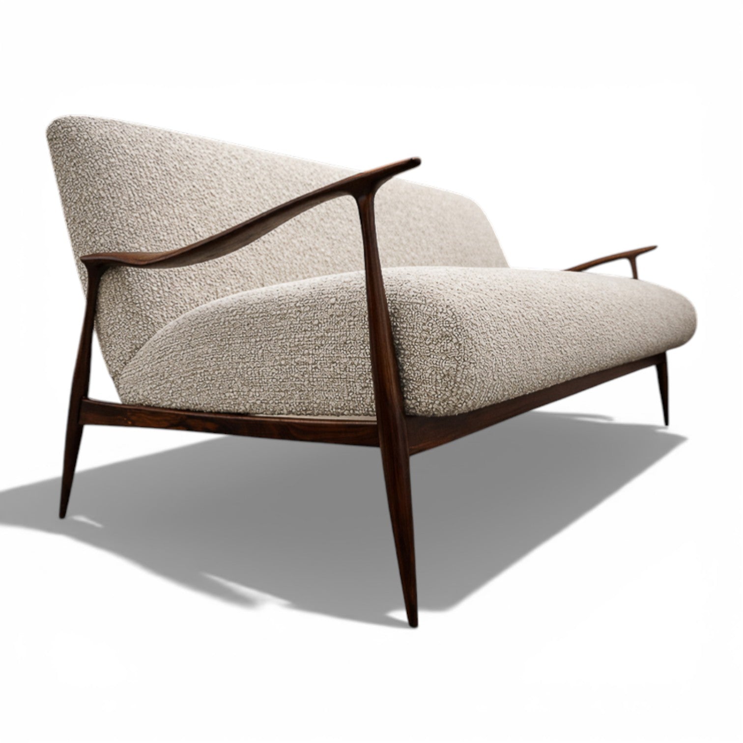 The sofa has been reupholstered in a warm ivory bouclé, a richly textured fabric characterized by its looped surface and tactile depth. The bouclé introduces warmth and softness, creating a compelling contrast with the clean architectural lines of the wooden structure. Its neutral tone allows the form and craftsmanship of the sofa to take visual precedence.