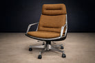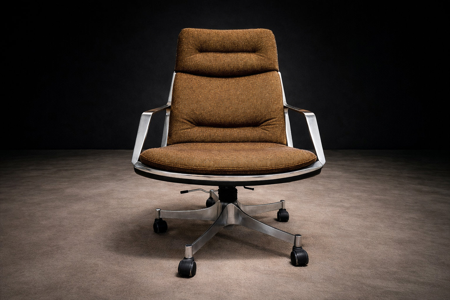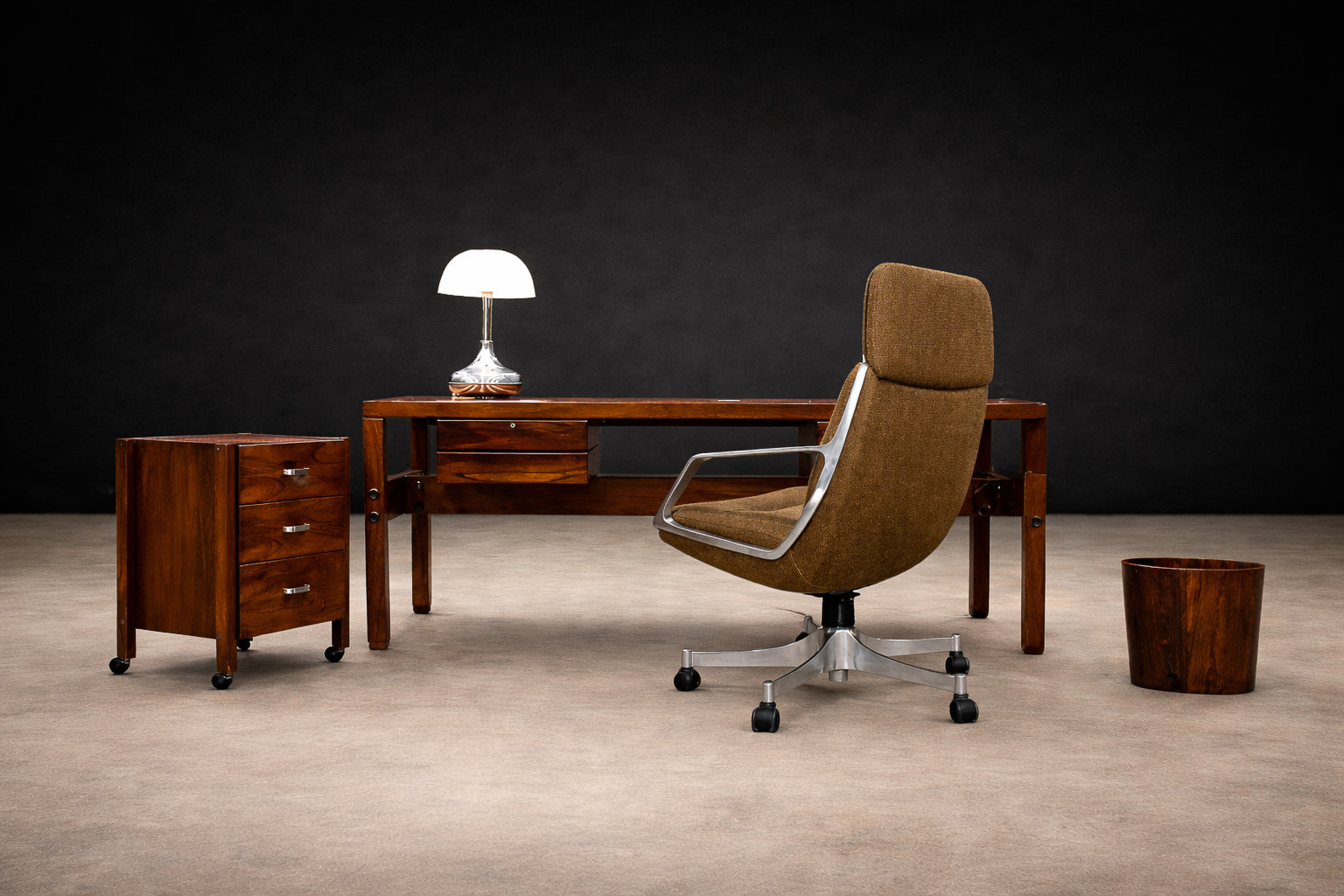 Designed in the late 1960s to meet Brazil’s rapidly expanding demand for modern corporate and executive furniture, the “Commander” armchair stands as one of the period’s most innovative office seating solutions. Conceived with both aesthetics and ergonomics in mind, the model was originally produced on casters—reflecting the growing international influence of American and European task-chair design—though a static, fixed-base version was later introduced.