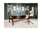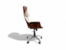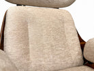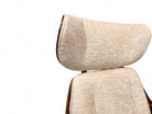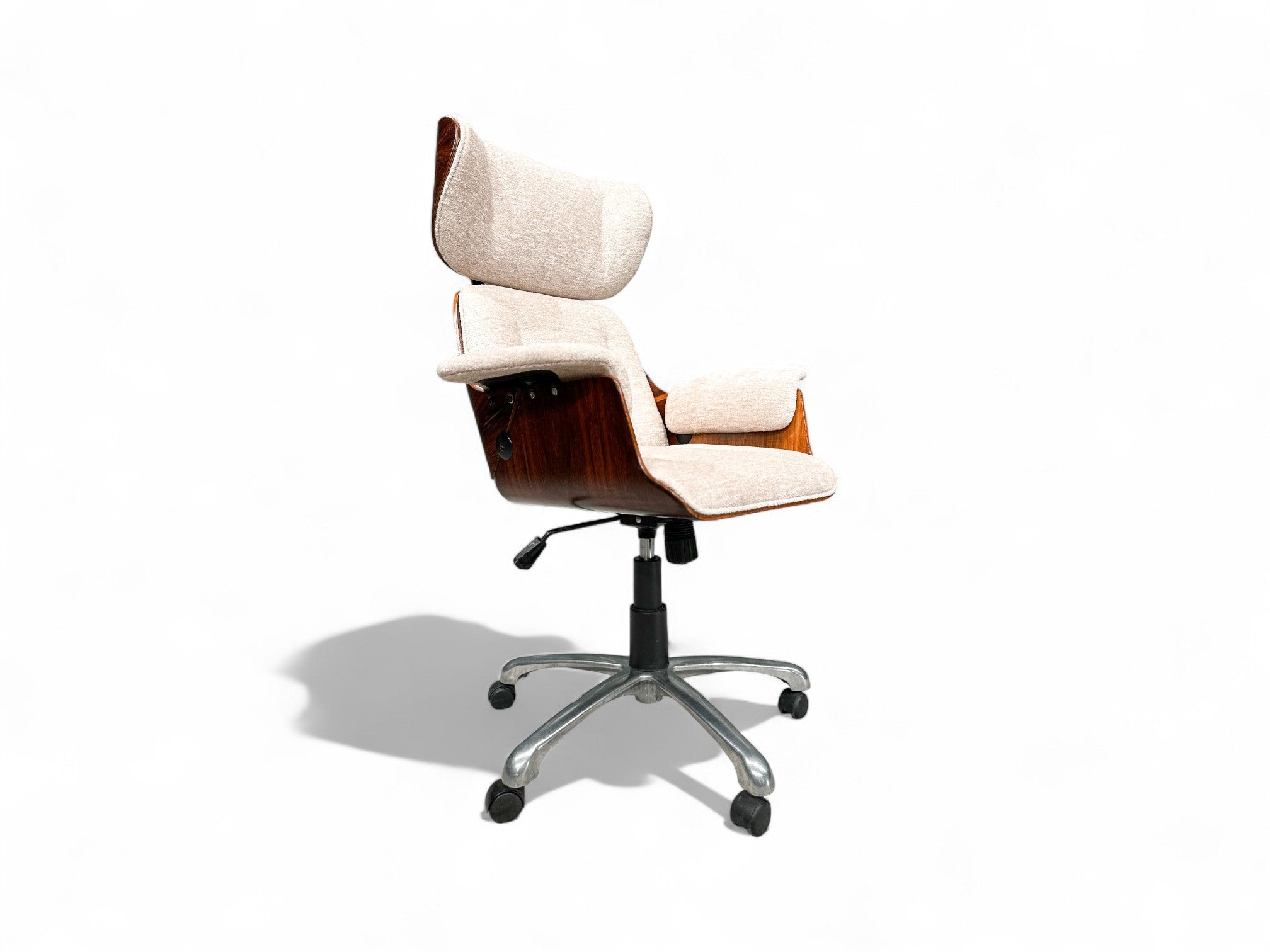 This elegant model features a five-spoke chrome metal base with rolling casters, and a plywood seat and backrest finished in rich rosewood veneer. The piece has been newly upholstered in camel-colored super-soft chenille, offering both comfort and a tactile, inviting warmth that complements the wood’s natural tones.